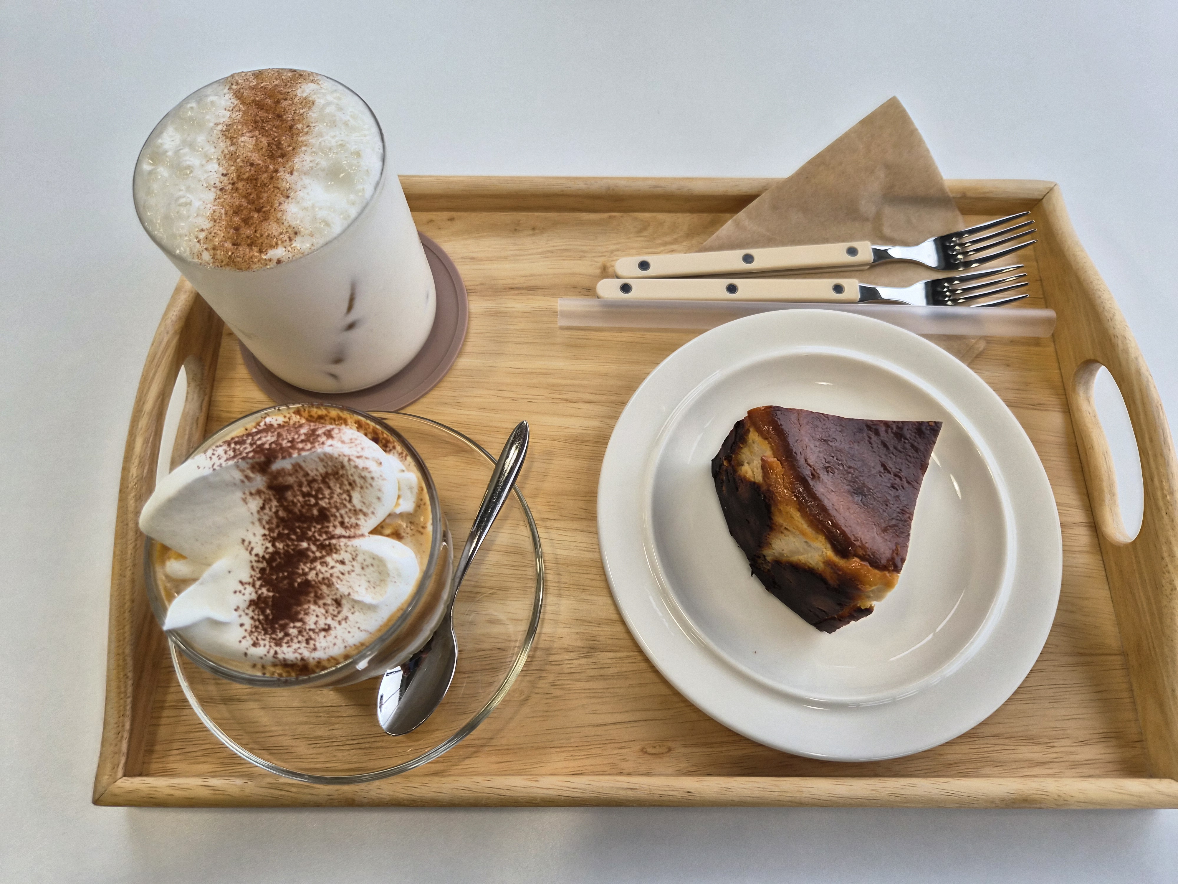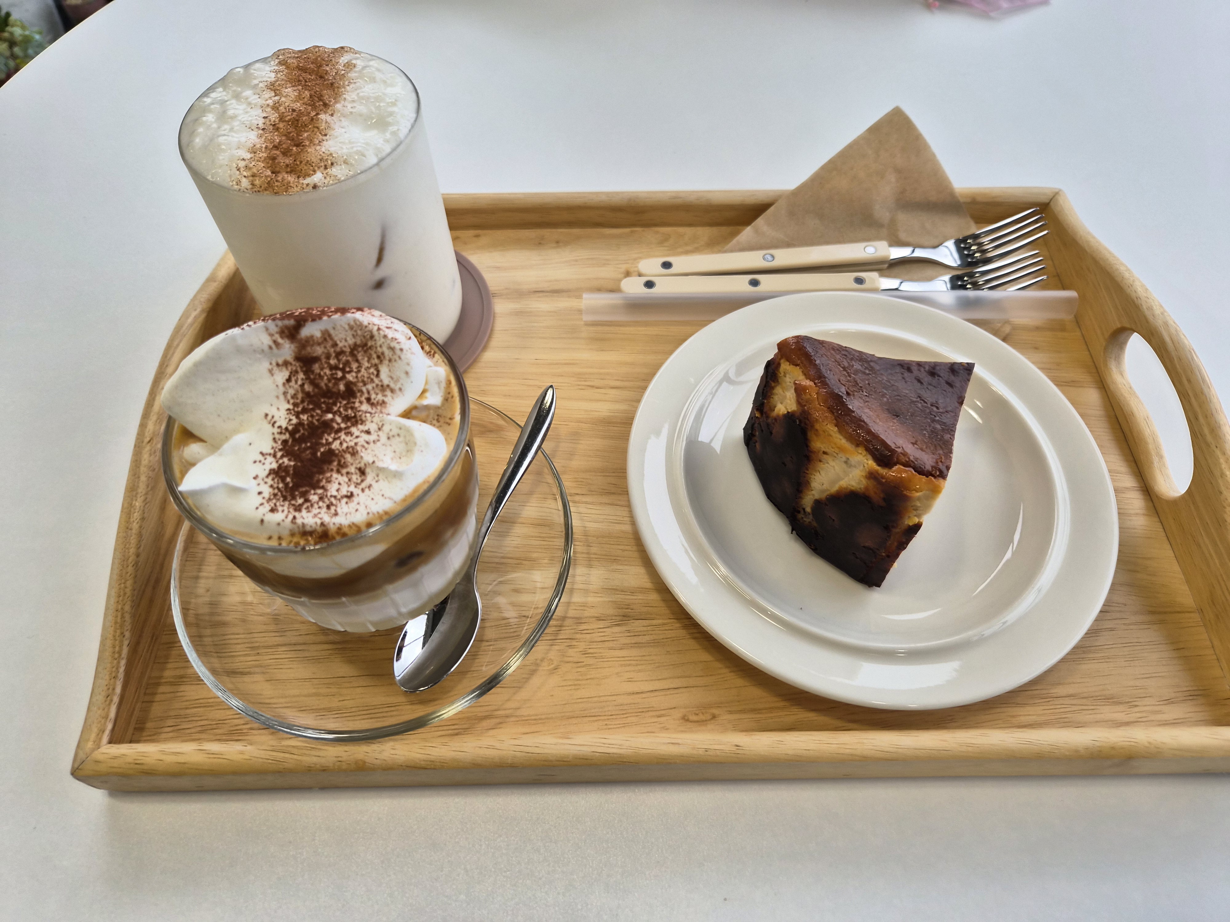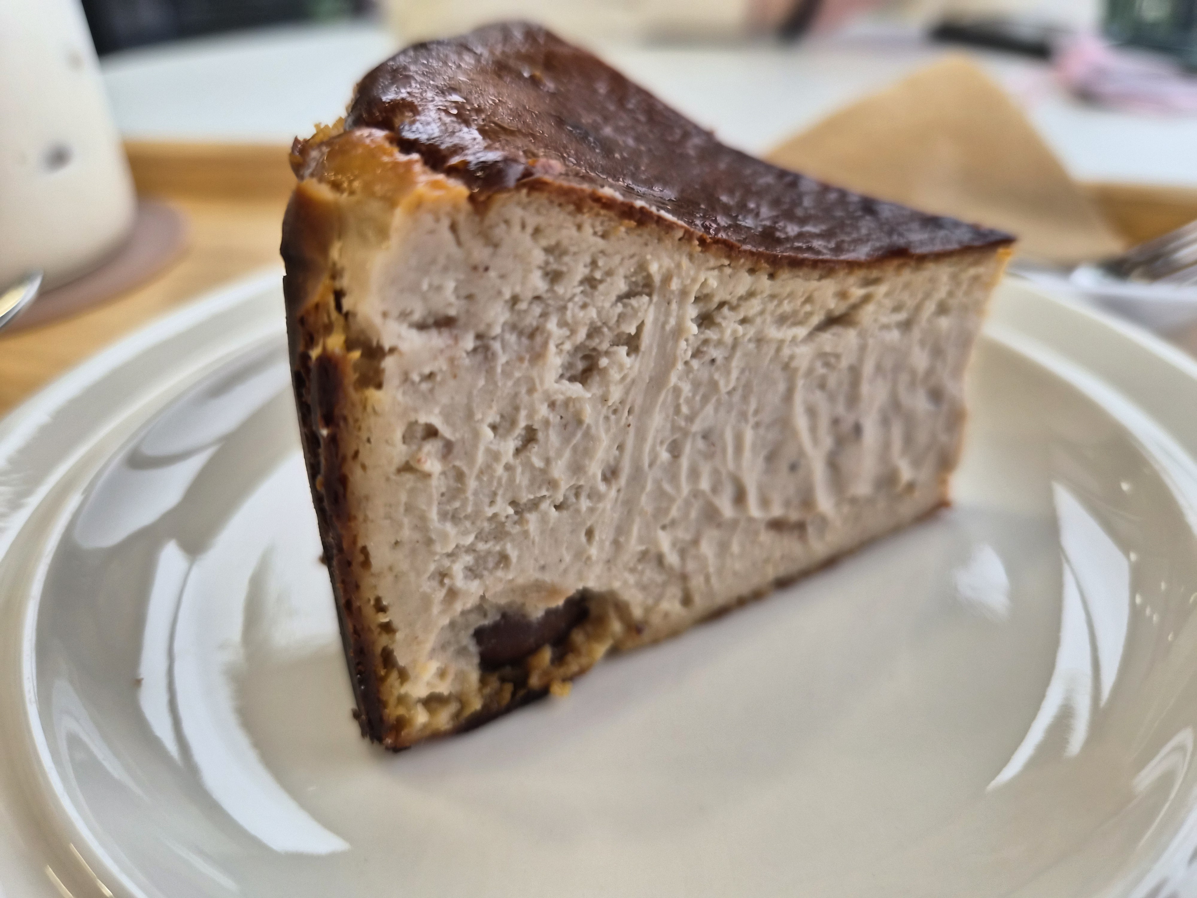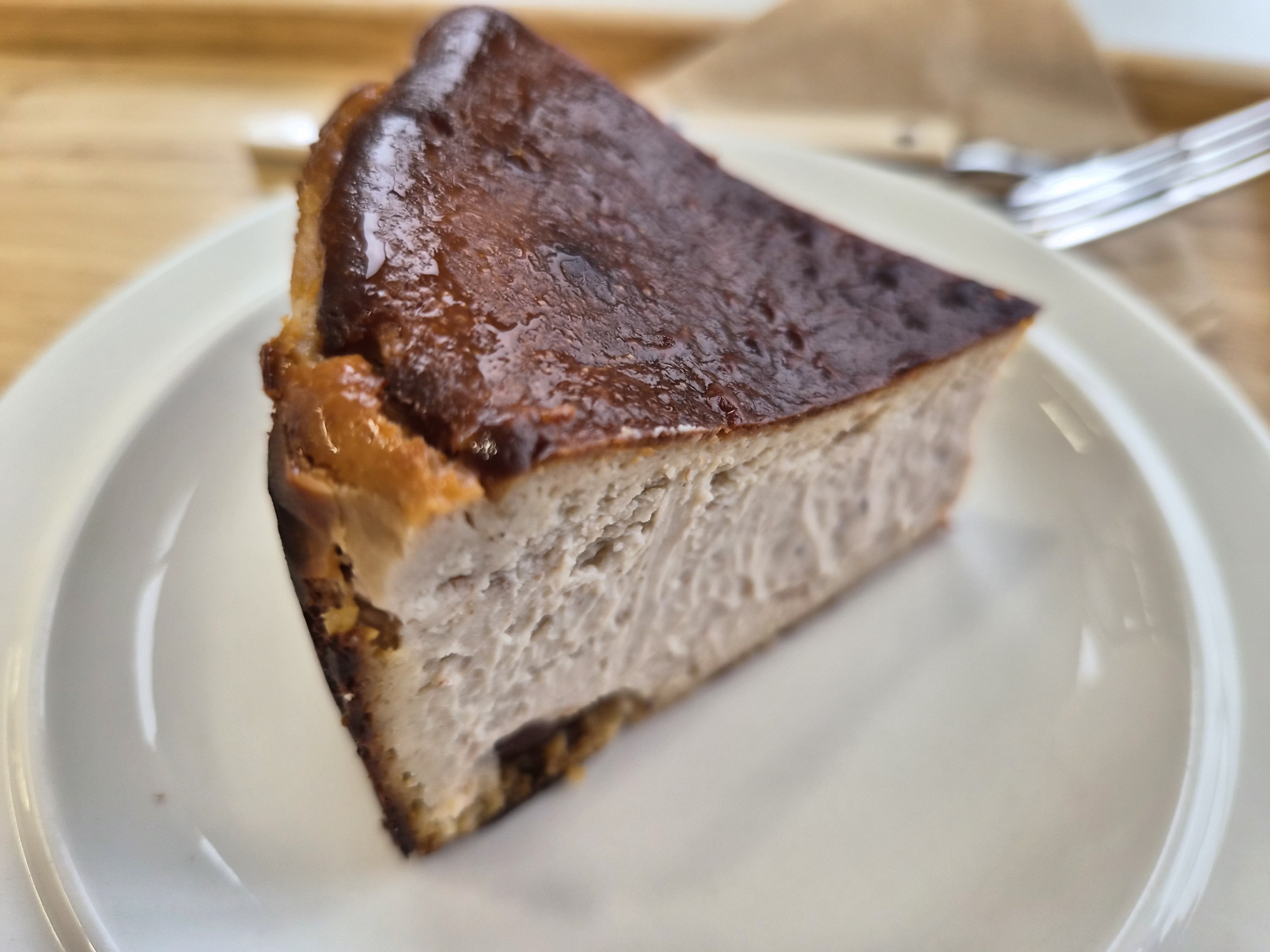 그리고 다음으로 맛 본 꿀밤 바스크 치즈케이크. 꿀밤카페의 시그니처 메뉴입니다. 겉은 먹음직스럽게 그을려 특유의 꾸덕꾸덕함이 느껴졌고요. 속은 굉장히 크리미한 스타일이었습니다. 케이크 속에는 달콤하게 조린 밤이 통째로 박혀 있었어서 먹는 재미도 일품이었습니다. 진한 크림치즈의 풍미 사이로 씹히는 밤의 고소하고 달콤한 식감이 좋았네요. 이름만 '꿀밤'이 아니라, 정말 '꿀밤'을 품고 있는 진정성 있는 디저트라고 할 수 있겠습니다. 달콤한 크림이 올라간 쌉쌀한 크림 플랫과의 조합도 훌륭했습니다.