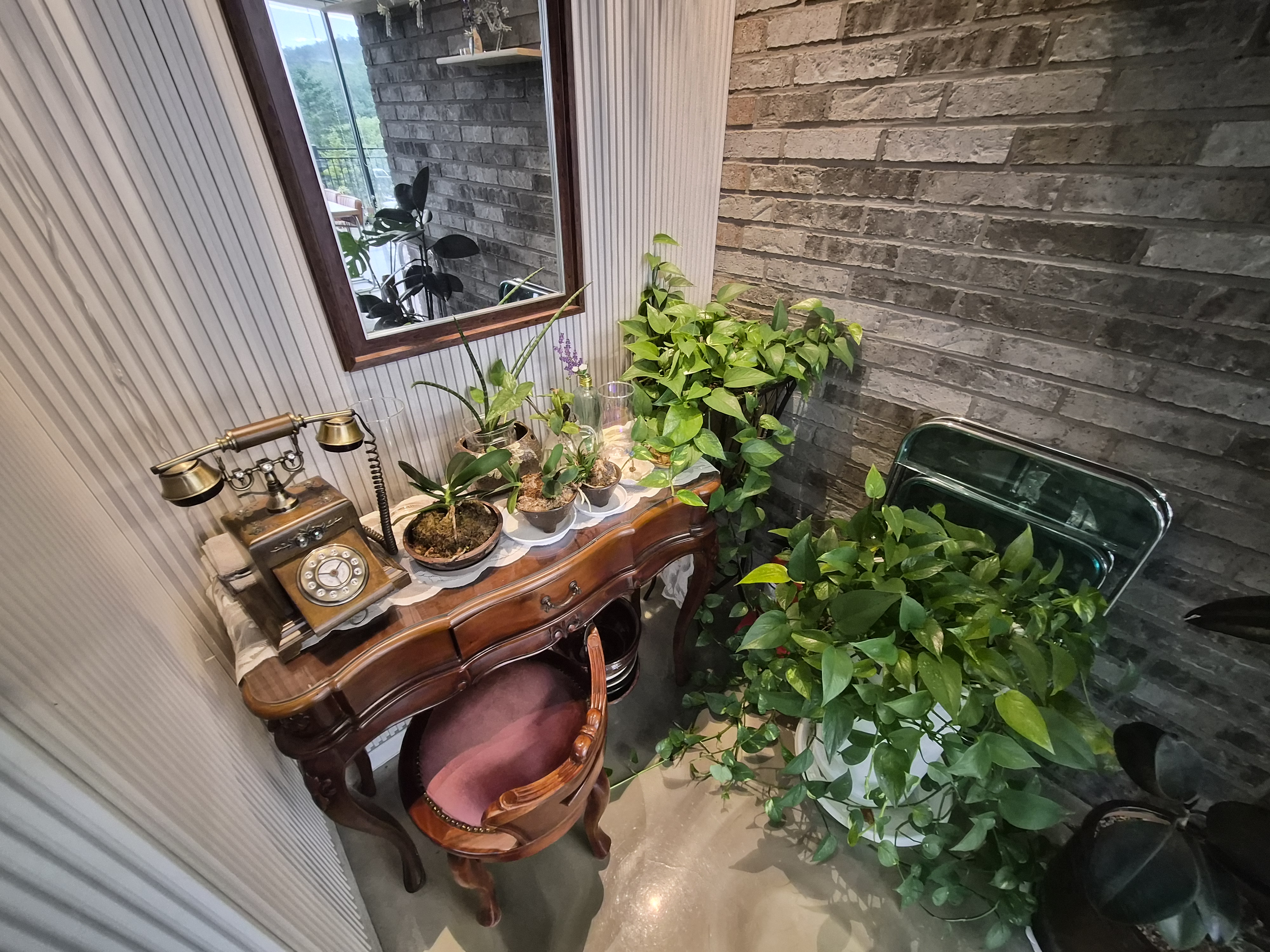 카페 곳곳에 다육이 등 식물이 많아서 또 다른 볼거리였어요. 고급스러운 옛 풍경의 레트로한 장식품들도 있었고 카페 전체가 식물로 가득찬 느낌이었습니다.