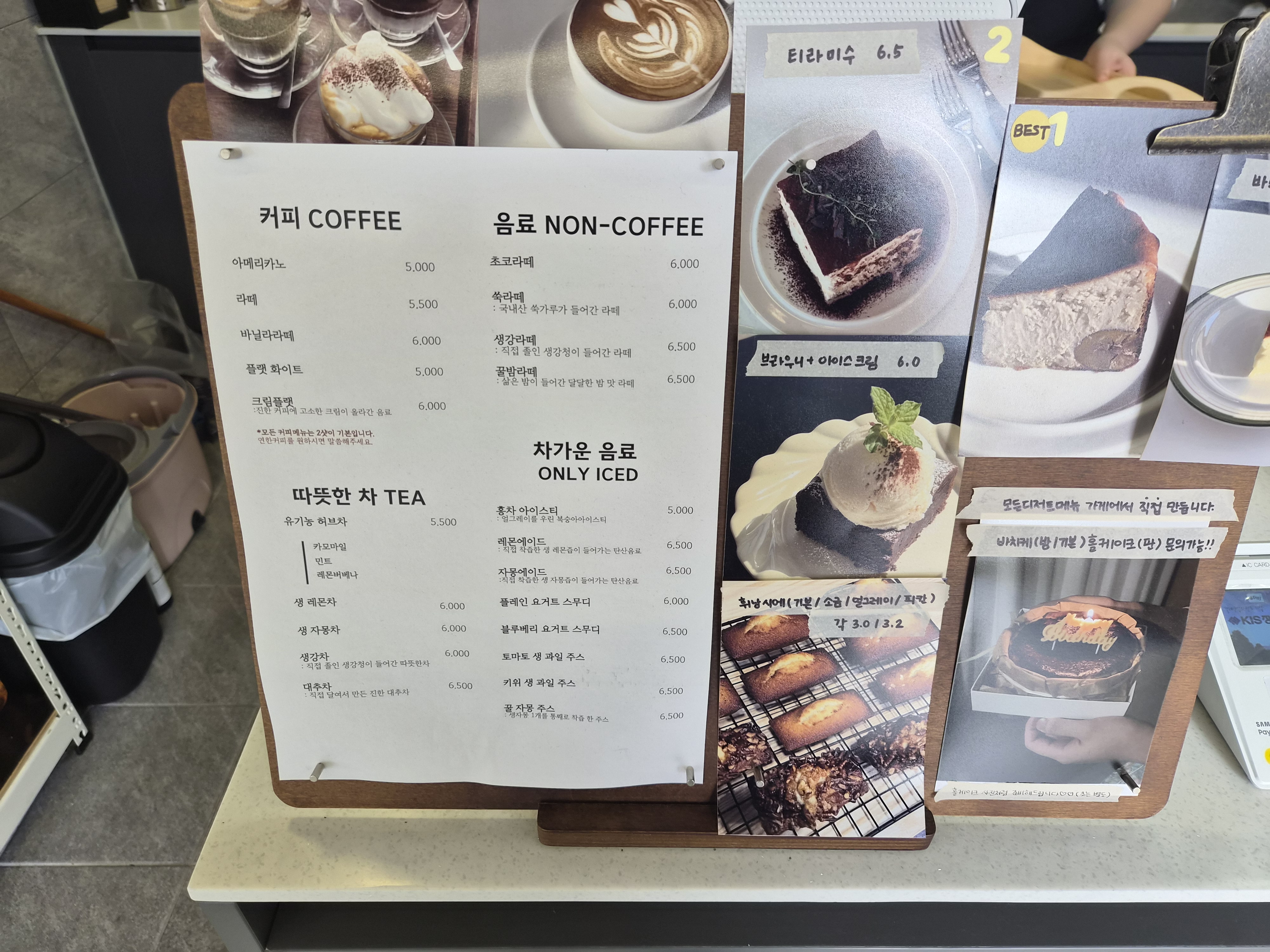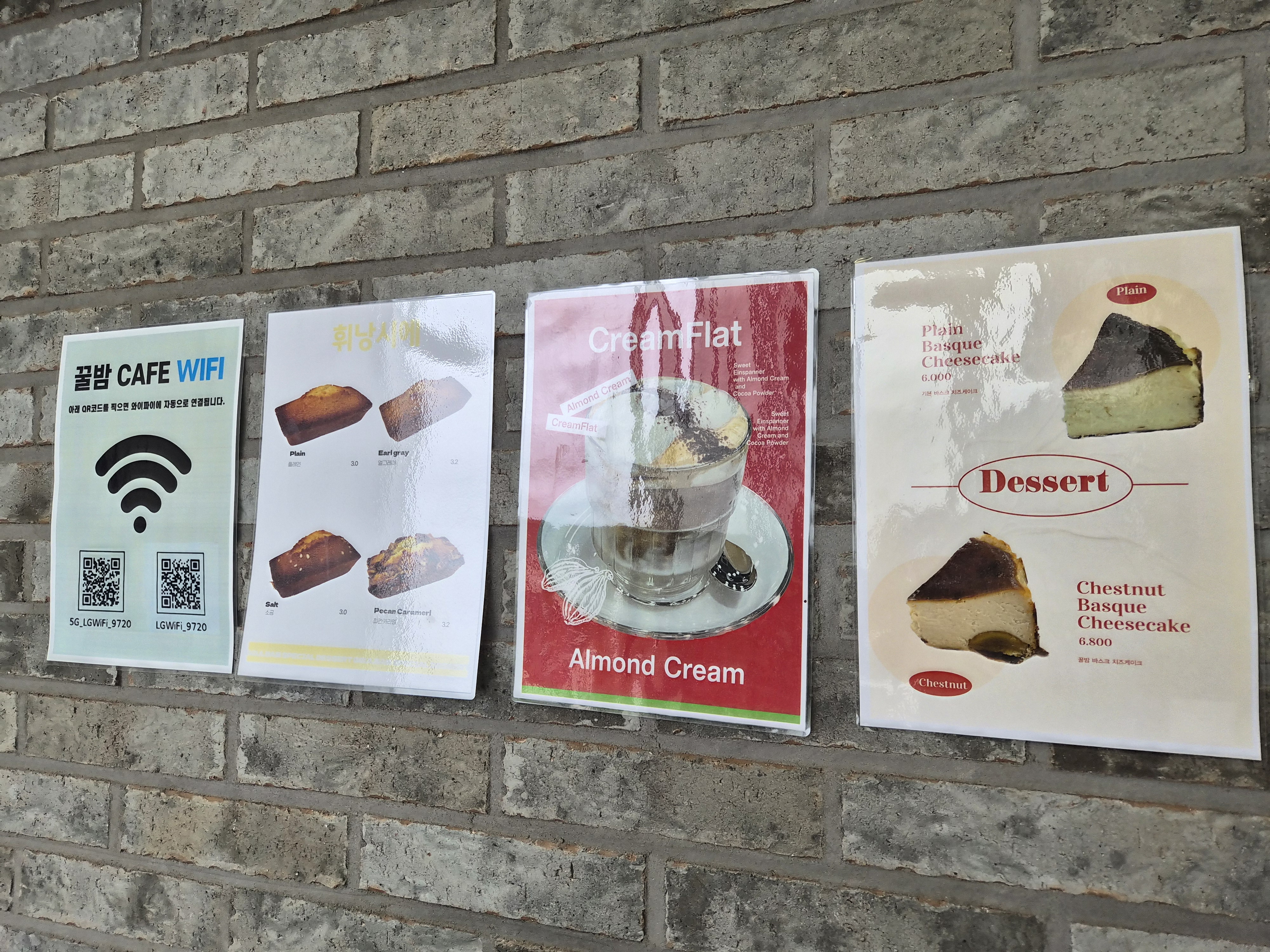 카운터쪽에서 주문해봅니다. 휘낭시에, 크림플랫, 치즈케이크, 커피류, 음료, 차 종류 등 다양한 메뉴들이 있습니다. 크림플랫과 꿀밤라떼, 꿀밤 바스크 치즈케이크를 주문해보았어요.