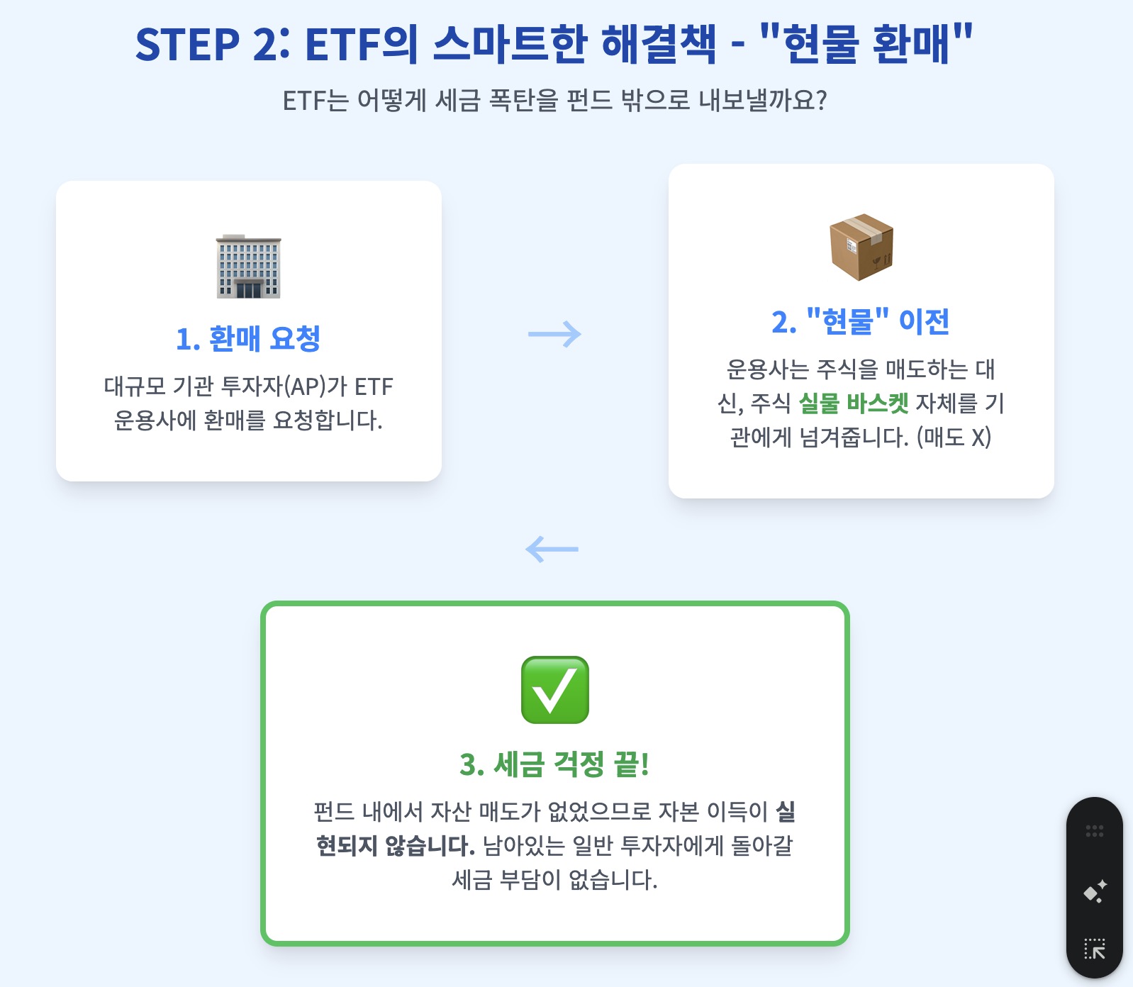 - 세금 문제: ETF 운용사는 주식을 판매(Sale)한 것이 아니라, 그냥 이전(Transfer)만 했다. 펀드 내부에서 '자본 이득'이 실현되지 않았다.