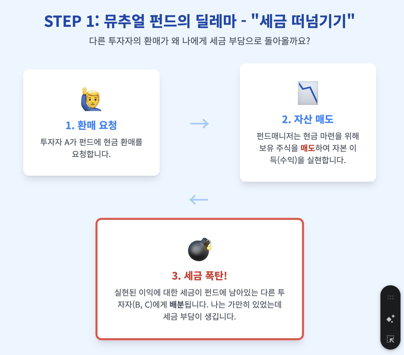 - 세금 문제: 주식을 파는 순간, 펀드 내부적으로 900원의 '자본 이득(Capital Gain)'이 실현된다.