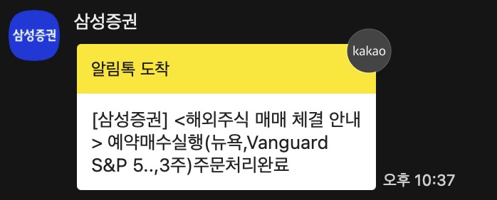 삼성증권의 경우, 원래 예약매수를 하게되면, 위 그림처럼 오후 10시~10시 30분쯤에 주문처리완료 알림톡이 오고 예약매수가 실행됐다고 안내해준다. 근데 여기에 보면 위에 문구 중에 '해외주식 매매 체결 안내'라고 적혀있어서 좀 헷갈리게 해놨다. 주문처리완료는 실제 체결이 된건 아니고 말 그대로 주문만 처리된 것이다.