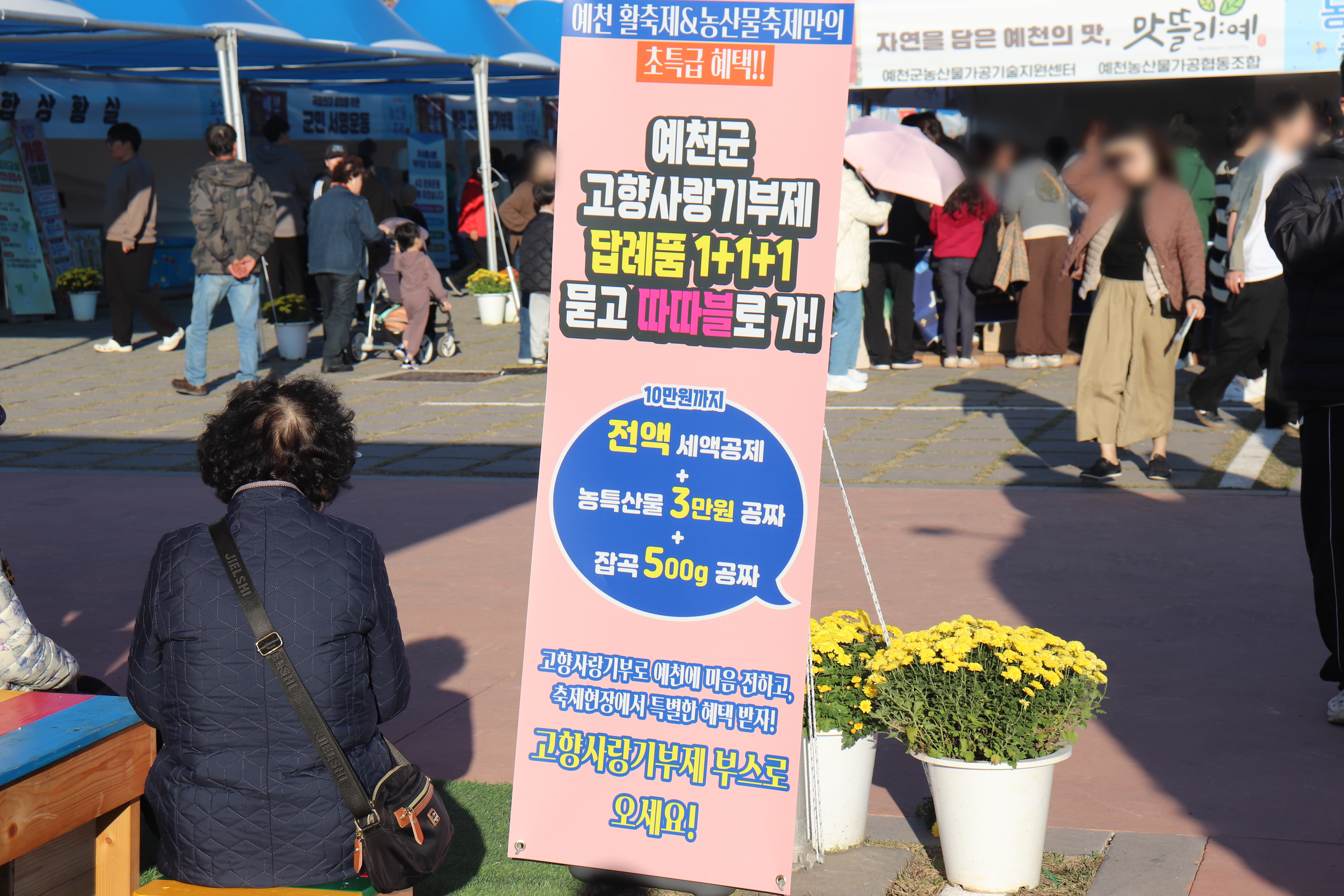 예천군에서 진행 중인 고향사랑기부제 답례품 이벤트도 열리고 있어서 눈여겨볼만했는데요. 예천군 고향사랑기부제로 축제현장에서 기부하게되면 10만원까지 전액 세액공제를 주며 농특산물 3만원 혜택을 주는게 원래 진행 방식인데 여기에 더해서 잡곡 500g도 추가로 준다고하니 참고해보세요.