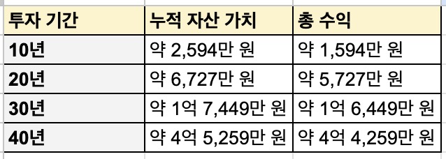 스프레드시트를 활용해 투자기간별 투적 자산 가치와 총 수익을 따져보자. 연 평균 수익 10%를 가정한 시뮬레이션이며 S&P 500에 1,000만원을 투자했을 때의 복리 효과를 가정하였다. 세금 및 수수료를 고려하지 않은 단순 계산 예시다.