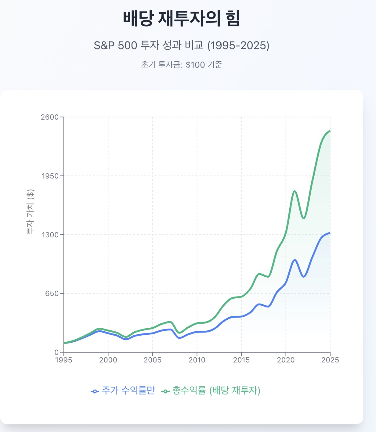 - 배당 재투자를 통해 복리 효과를 극대화하여 자산 증식의 속도를 높인다.