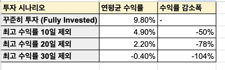 위 데이터가 말해주는 사실은 다음과 같다. 지난 30년간 단 10일의 최고 상승장을 놓친 것만으로도 전체 수익률은 절반으로 줄어든다. 최고 수익률이 제공되었던 20일을 놓칠 경우 수익률은 78%가 감소한다. 만약 최고 수익률이 제공된 30일을 놓칠 경우, 기초자산이 하락하면서 원금조차 손실보게 된다. 따라서 언제 최고 수익률이 제공될지 정확하게 맞출 수 없다면, 시장을 떠나 있으면 안된다. 반드시 시장에 남아있어야한다. 이 부분은 존보글이 책에서 특히 강조했던 내용이기도 하다.