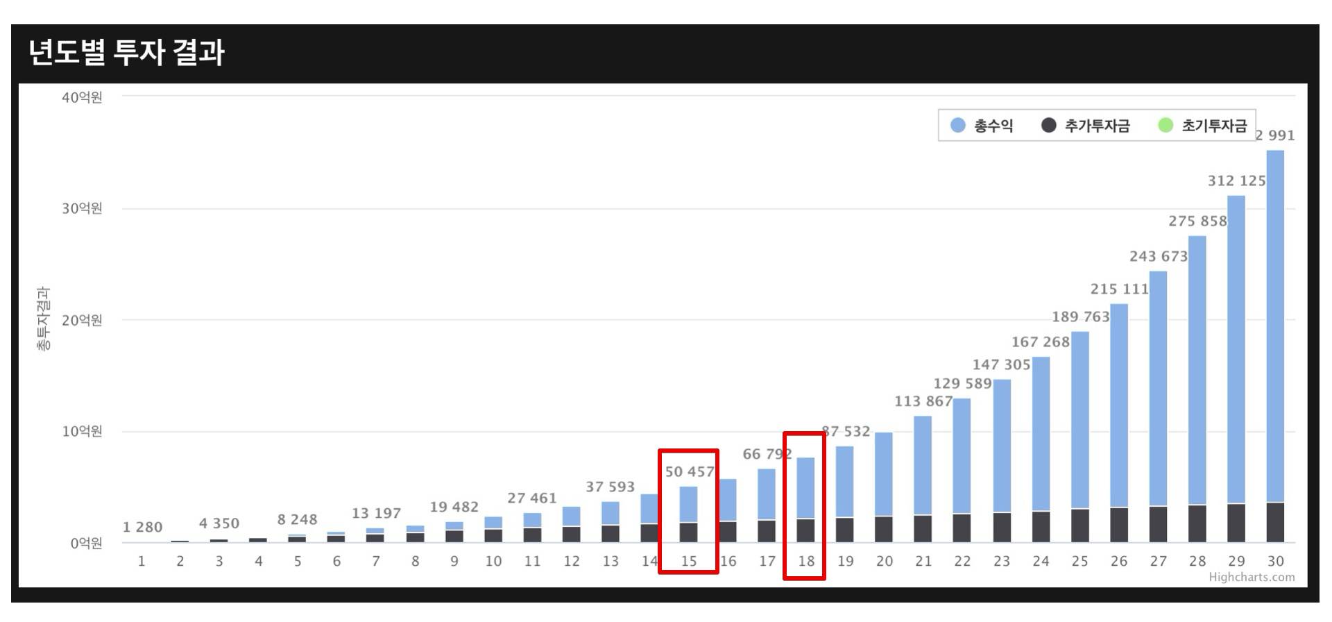 실제로 연도별 투자 결과 시뮬레이션을 체크해보면 대략 15년 투자때부터 투자 원금 대비 수익금이 늘어나는 모습을 볼 수 있다. 이때부터 본격적으로 복리 효과가 누적되기 시작하면서 뒤로가면 뒤로 갈수록 수익금은 커지고 원금은 계속 똑같지만 총 수익금이 엄청나게 늘어나는 그래프 모양을 볼 수 있다.