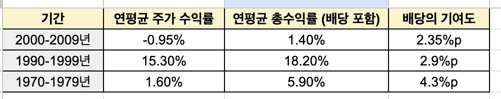2000년대와 같이 주가 변동이 지지부진했던 10년 동안, 배당금은 마이너스(-)였던 주가 수익률을 플러스(+) 총수익률로 바꾸는 결정적인 역할을 해주었다. 만약 배당금을 재투자하지 않고 그냥 소진해버렸거나 투자하지 않았다면 연평균 주가 수익률은 마이너스였을 것이다. 하지만 배당 기여도를 통해서 배당포함 총수익률을 플러스로 전환할 수 있었다. 이처럼 배당은 시장이 횡보하거나 하락할 때 수익률을 방어하고, 상승장에서는 수익을 더욱 가속하는 엔진이다. 따라서 장기투자자들은 반드시 배당금을 재투자해야한다. 장기투자자라면, 생활비는 배당금으로 충당하려고하지말고 소득으로 사용해야한다.