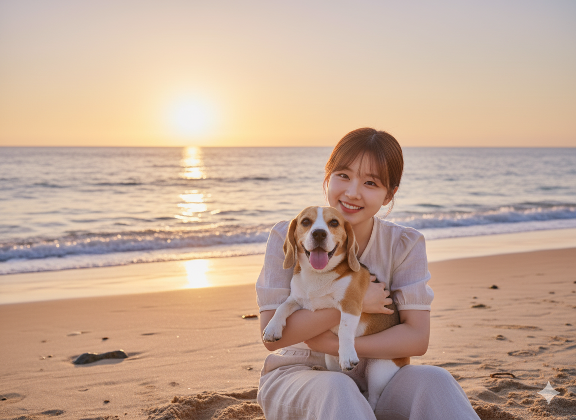 프롬프트: "인물이 강아지를 끌어안고 있는 모습으로. 바닷가 배경."