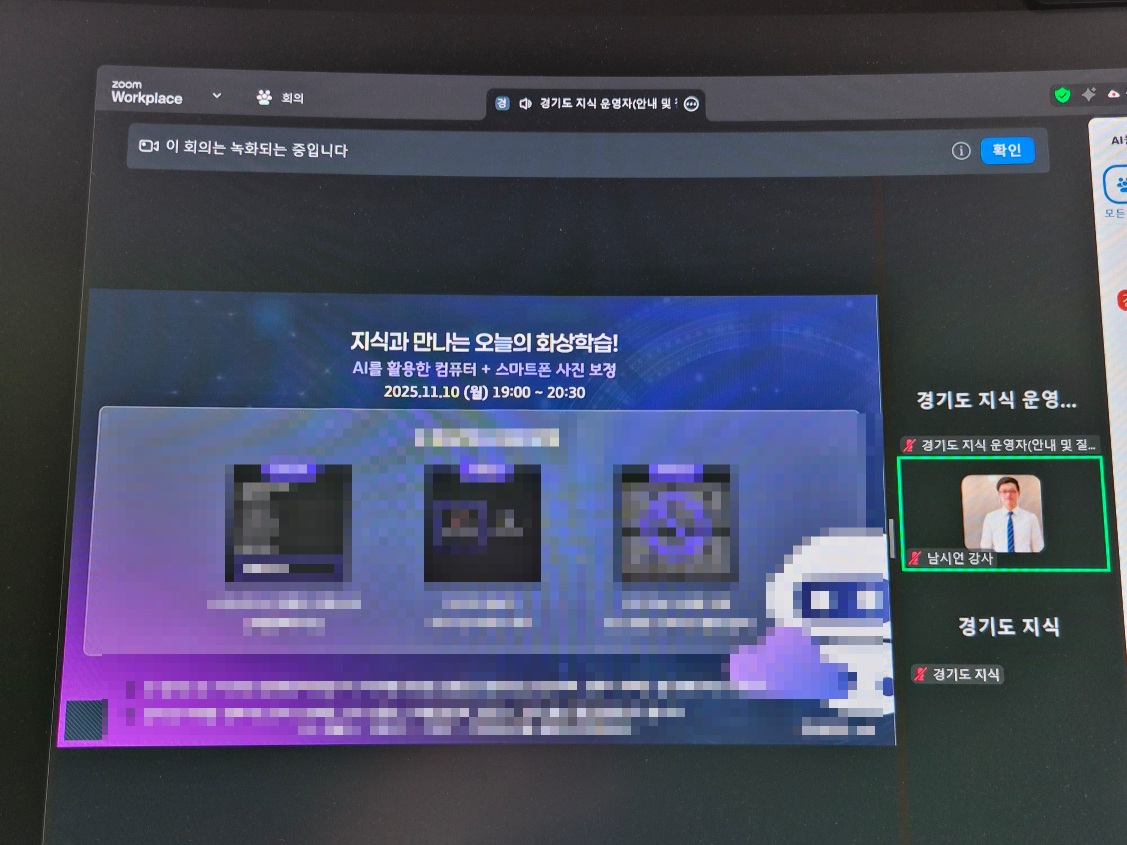 경기도 평생학습포털 지식에서 진행하는 비대면 줌 화상 강의 공개강연 모집이 시작되었습니다. 저는 11월 10일 월요일 오후 7시부터 진행되는 AI를 활용한 컴퓨터 + 스마트폰 사진 보정 강의에