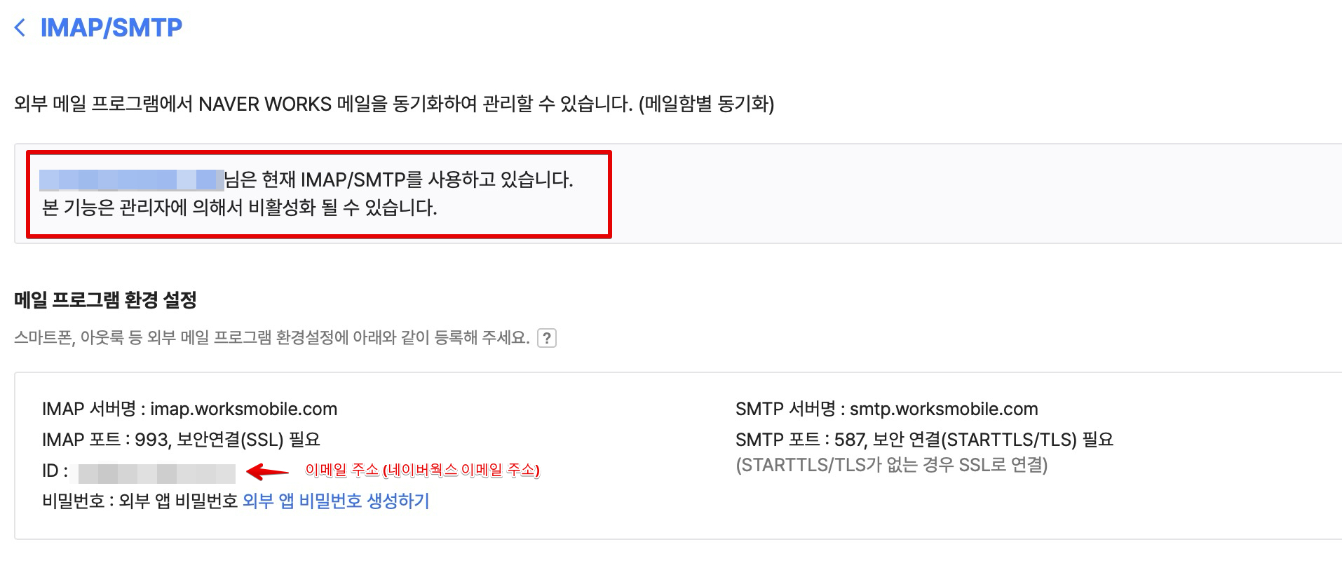이렇게 위와 같은 화면이 나타나면, 메일 프로그램 환경 설정 및 주소를 확인한다. 기본 네이버 메일과 메일 서버가 달라서인지, 서버명이 다르기 때문에 꼼꼼한 확인이 필요하다. ID는 이메일 주소인데 네이버웍스 이메일 주소가 된다. 설정 확인이 되면 아래쪽에 있는 <외부 앱 비밀번호 생성하기>를 클릭한다.