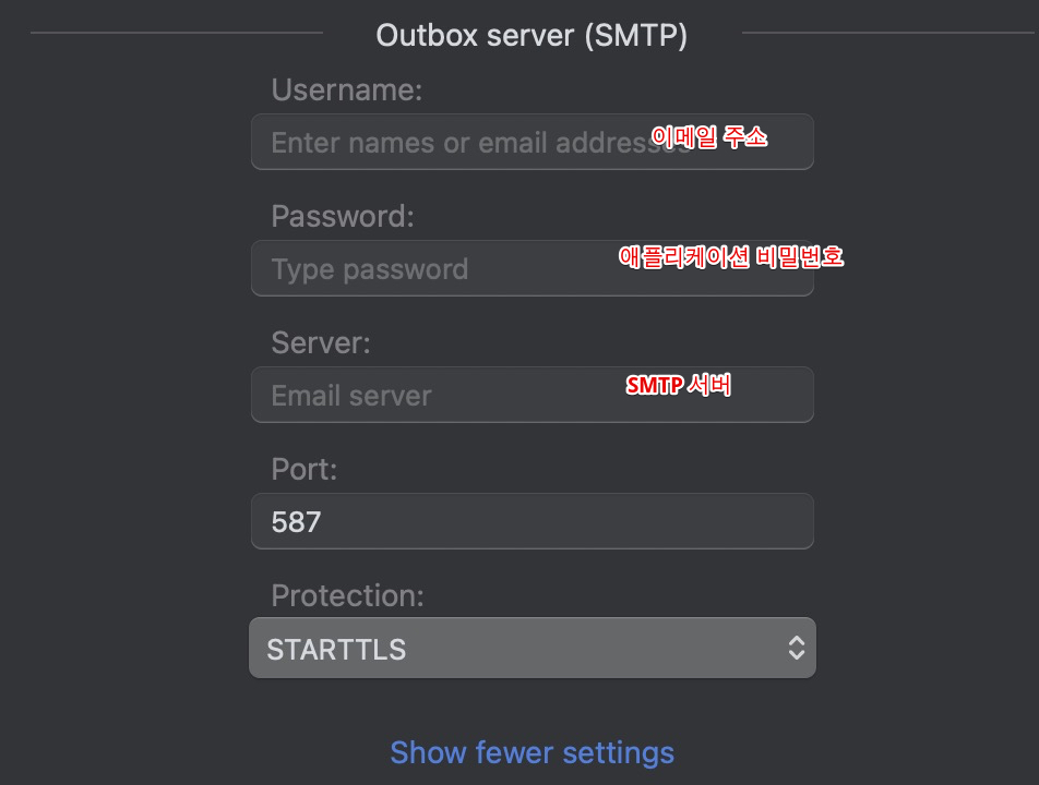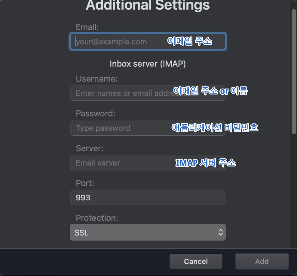 일단 IMAP 부터 설정하는데 반드시 위 그림처럼 설정해야한다. 그렇지 않으면 연동되지 않는다. 여기에서 특히 문제가 되는게 바로 중간에 있는 <애플리케이션 비밀번호>다.