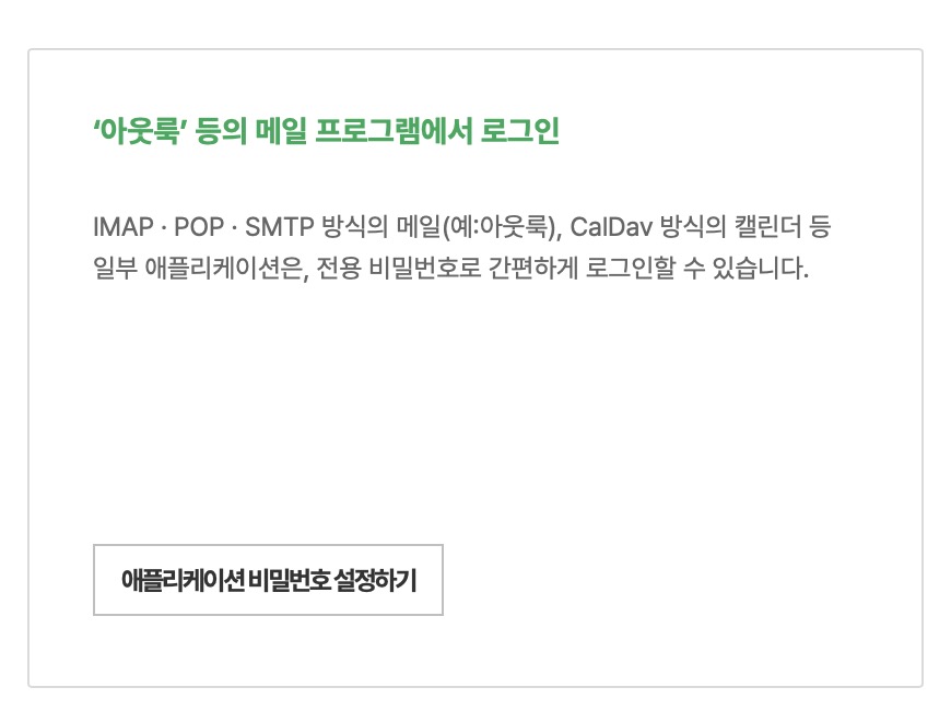 IMAP/SMTP 사용은 네이버 메일에서 <환경설정>에서 <POP3/IMAP 설정>으로 들어가면 사용함으로 바꿀 수 있다. 그런 다음 2단계 인증을 켜야한다. 그리고 마지막으로 아래쪽에 <설정하기>를 클릭해서 애플리케이션 비밀번호를 생성해야한다.