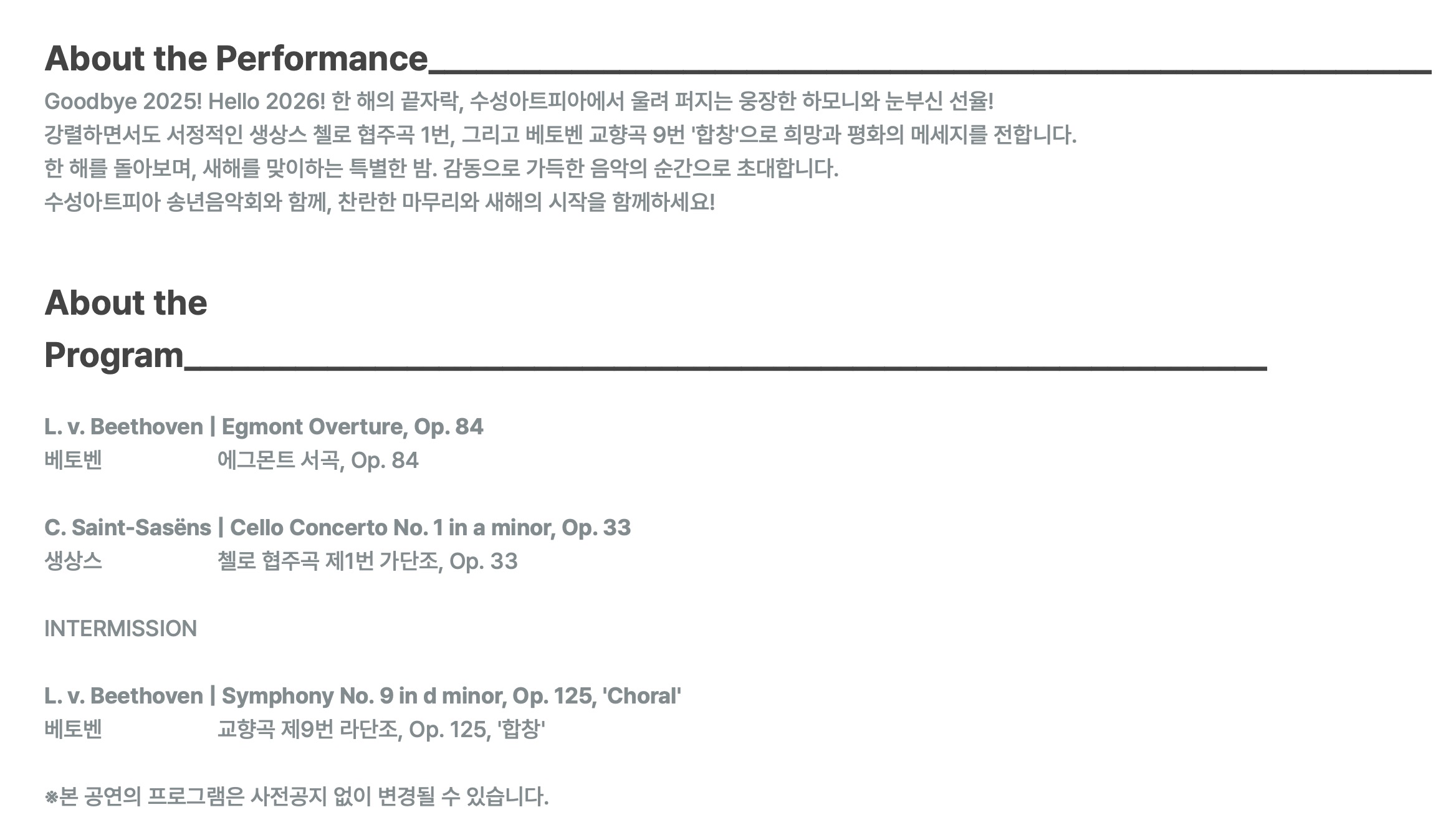 어느덧 달력의 마지막 장, 11월도 절반이 지나가고 있습니다. 거리를 밝히는 반짝이는 조명과 따뜻한 연말 분위기 속에서 2025년을 잘 마무리하면 좋겠는데요. 한 해를 마무리하는 이 특별한 시기에, 수성아트피아에서는 여러분의 2025년 마지막 밤을 그 무엇보다 벅차고 뜨거운 감동으로 채워줄 무대를 준비했습니다.