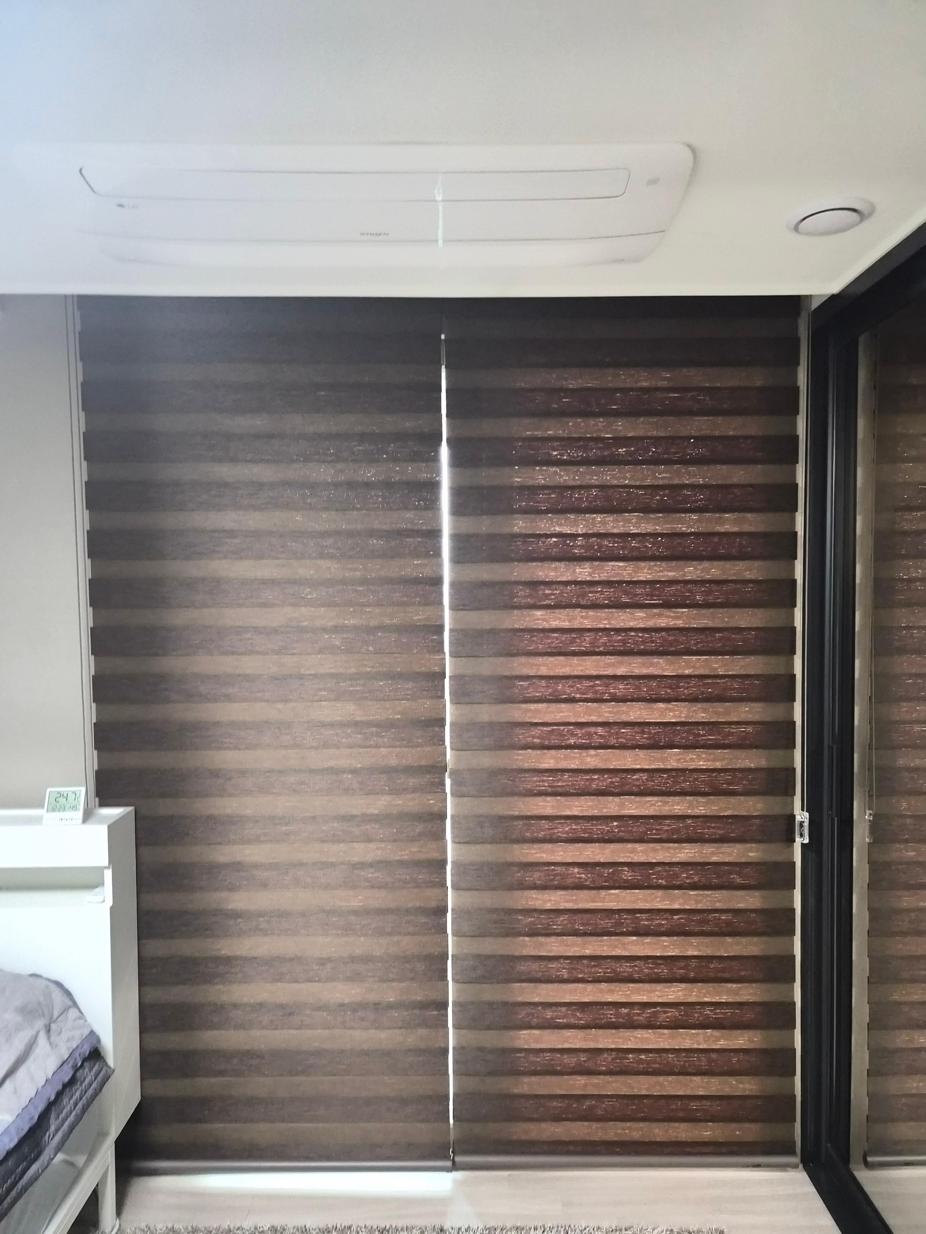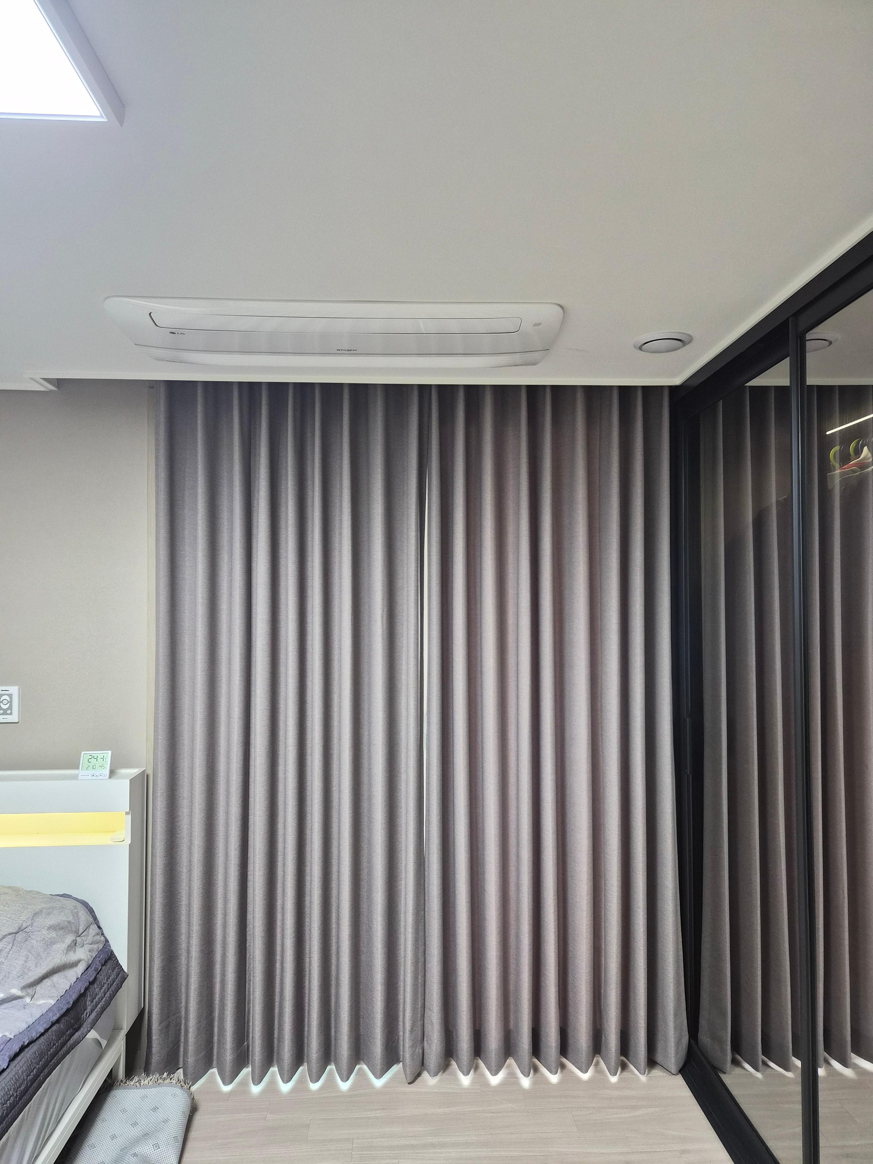 커튼 색깔은 벽지랑 가능하면 비슷하면서도 벽지보다 조금만 더 어두운 색상이나 다른 색상이면 좋겠다고 생각했었는데, 지금 커튼의 색상은 따로 정해진 이름이 있다기보다는 브라운이랑 라떼 색깔이랑 섞여있는 색상이라고 한다. 그냥 브라운라떼라고 부른다고 한다. 커튼 재질은 거실에 했던 재질이랑 똑같은거라서 익히 잘 알고 있었다. 거실이랑 색상만 조금 다르게 한 셈이다.