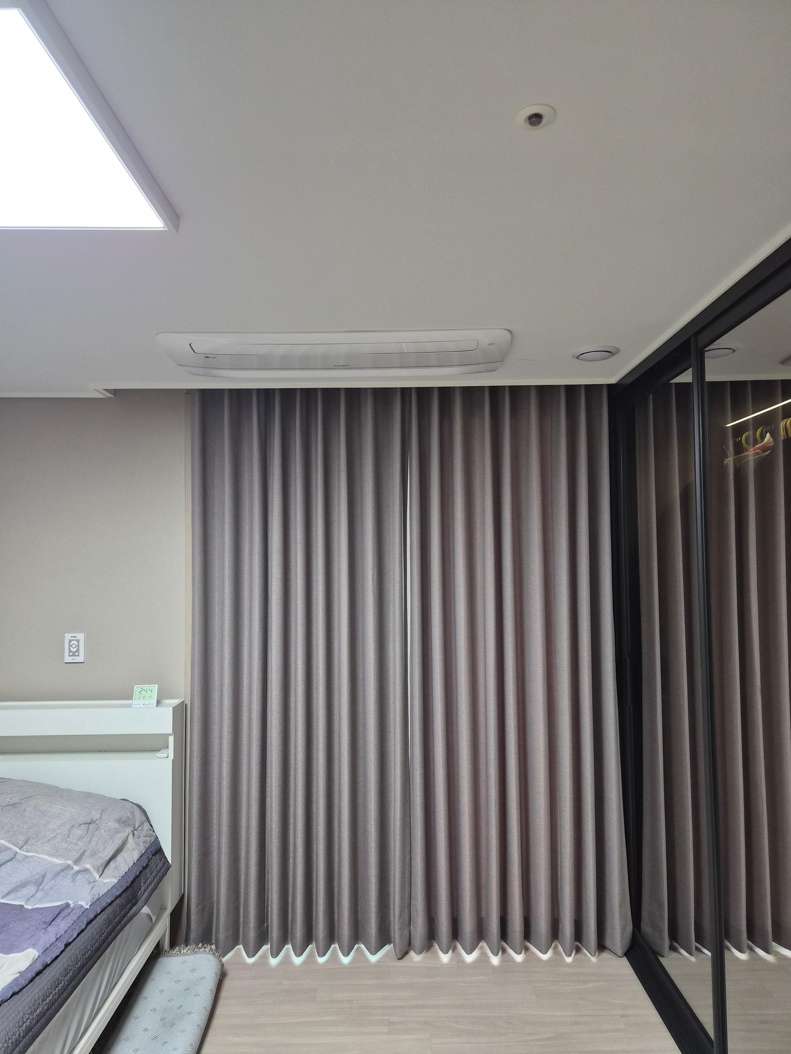 커튼 색깔은 벽지랑 가능하면 비슷하면서도 벽지보다 조금만 더 어두운 색상이나 다른 색상이면 좋겠다고 생각했었는데, 지금 커튼의 색상은 따로 정해진 이름이 있다기보다는 브라운이랑 라떼 색깔이랑 섞여있는 색상이라고 한다. 그냥 브라운라떼라고 부른다고 한다. 커튼 재질은 거실에 했던 재질이랑 똑같은거라서 익히 잘 알고 있었다. 거실이랑 색상만 조금 다르게 한 셈이다.