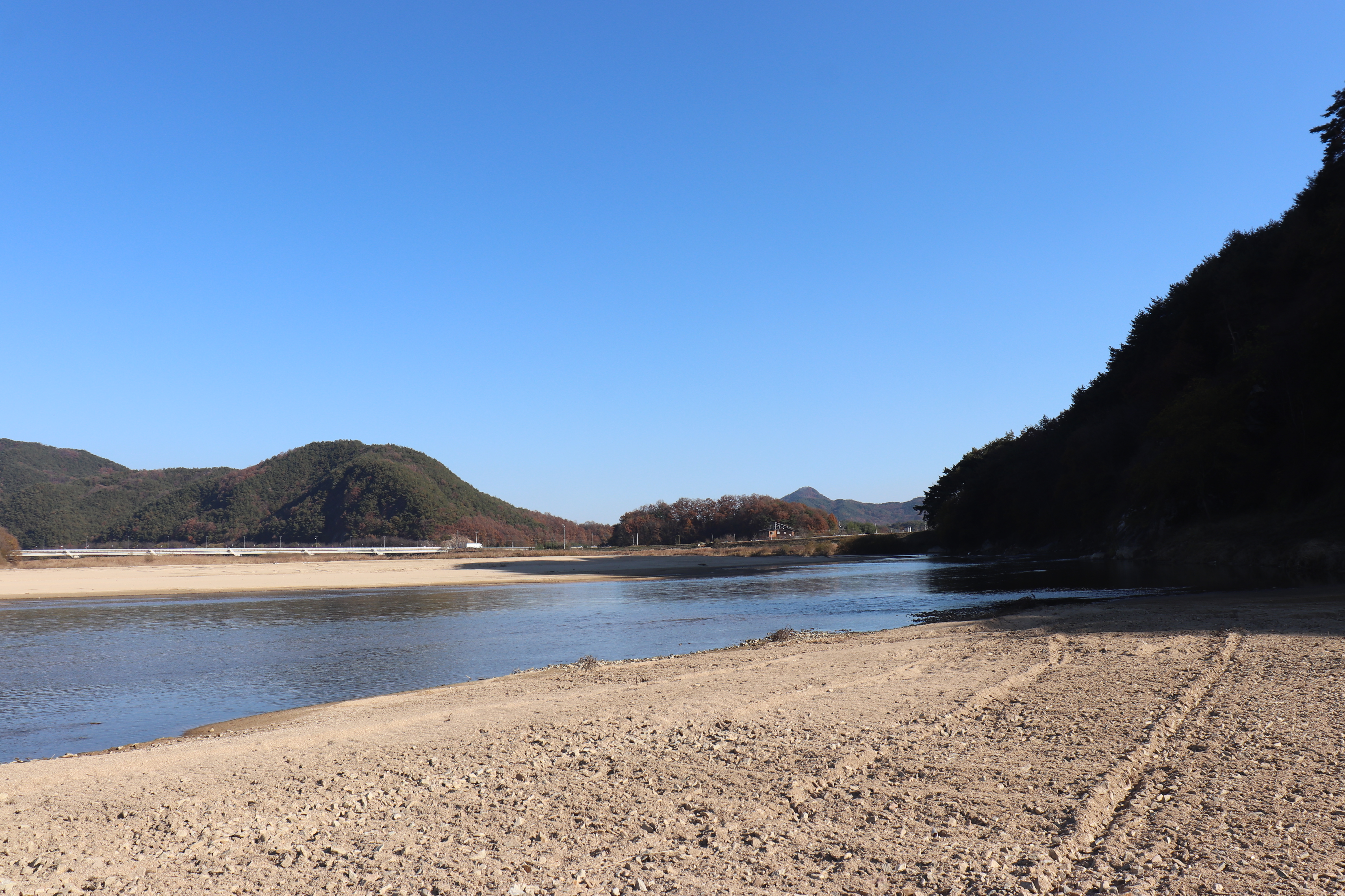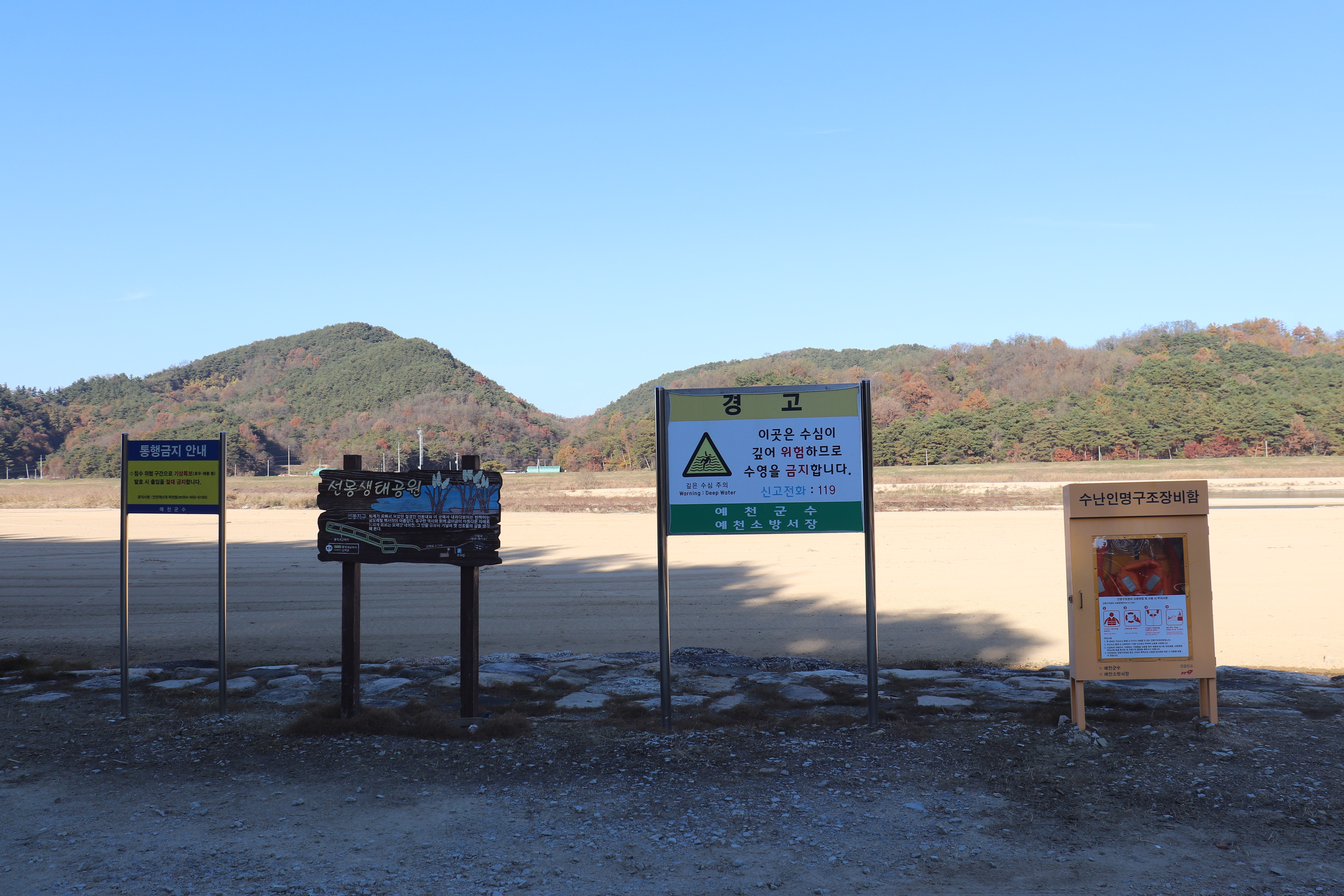 정자에서 내려와 백사장으로 걸어가 보았습니다. 내성천의 백사장은 모래가 정말 곱고 깨끗했습니다. 강물은 맑아서 바닥이 훤히 들여다보일 정도였습니다. 얕은 곳에 발을 담그고 싶었지만, 가을바람이 제법 차가워서 아쉽지만 참았습니다. 선몽대 주변은 그야말로 자연 그 자체라고 할 수 있었어요. 강 건너편 숲은 울긋불긋 가을 옷을 갈아입고 있었습니다.