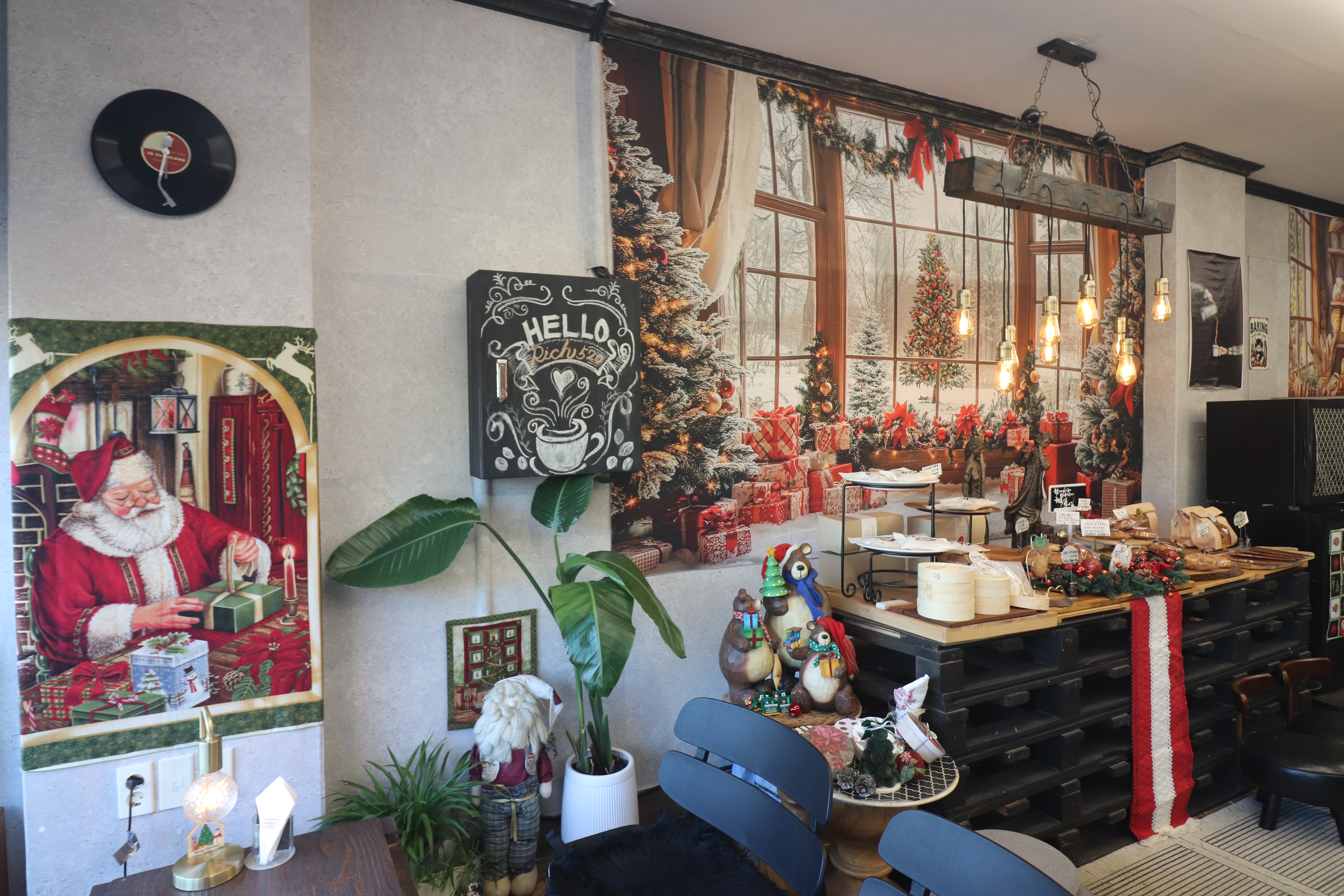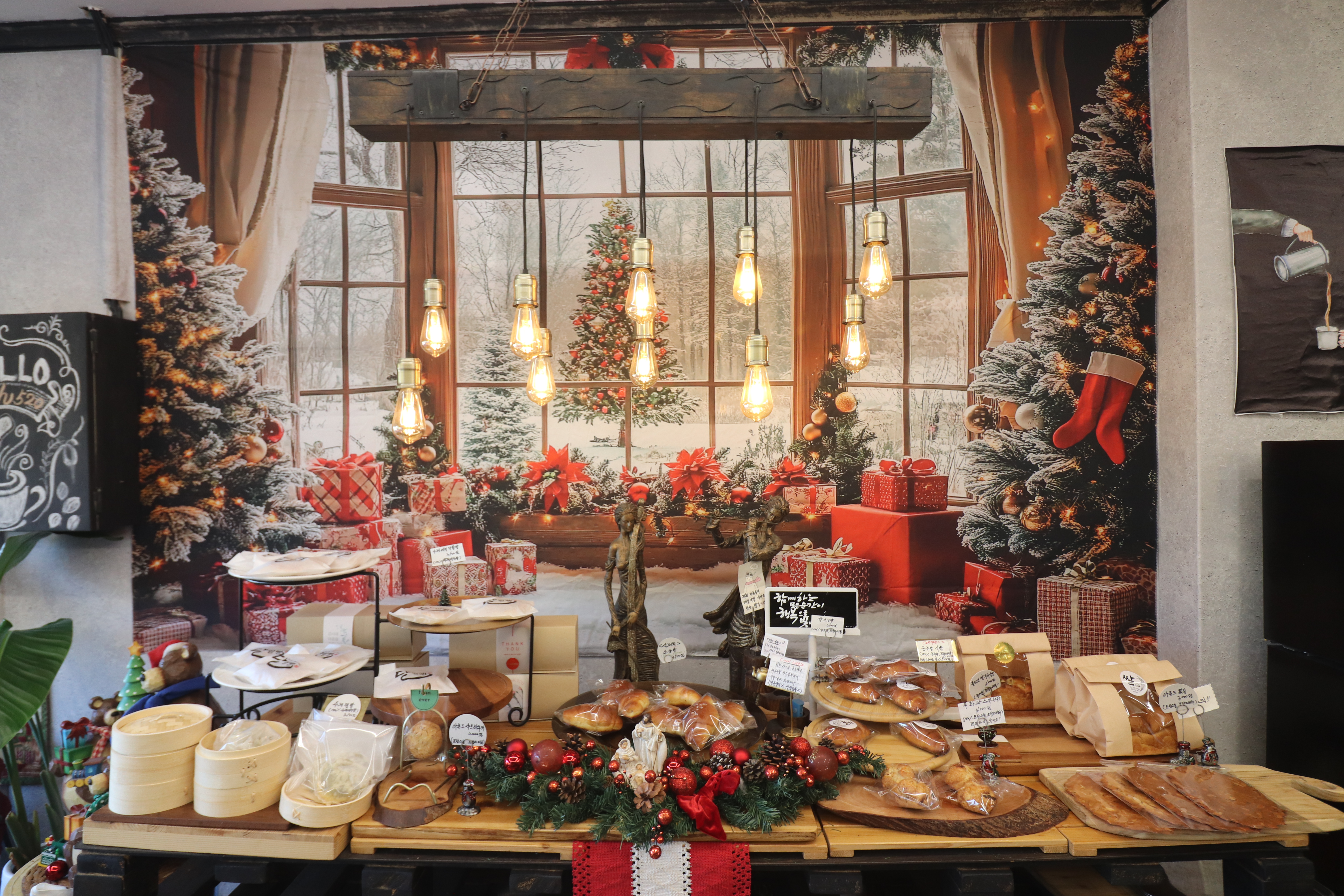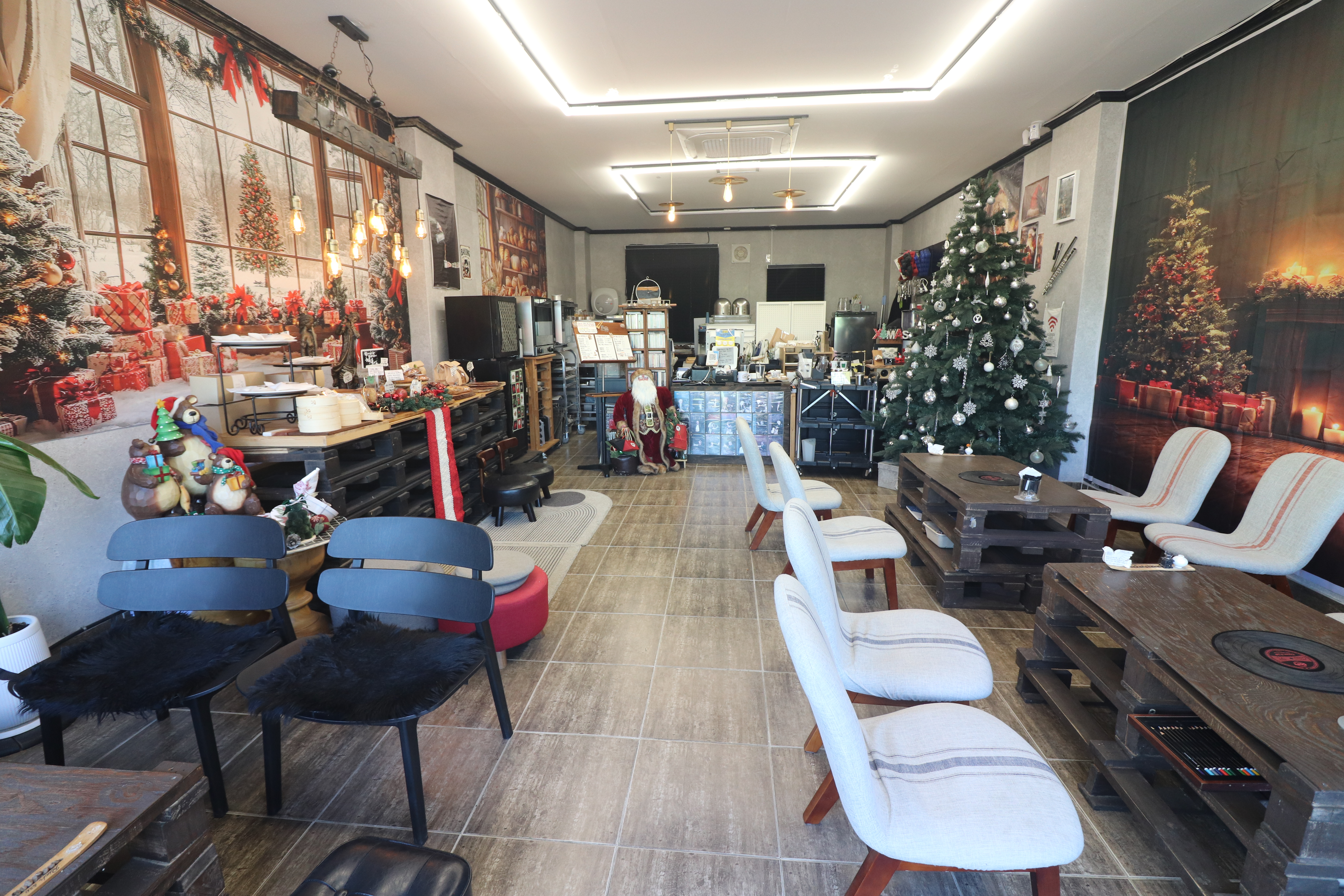 실내 공간은 전체적으로 꽤 넓고 쾌적한 편입니다. 전체적으로 따뜻한 우드 톤과 화이트 톤이 어우러진 인테리어는 포근하면서도 감성적인 분위기를 갖고 있습니다. 다가오는 겨울을 맞아 크리스마스 분위기가 물씬나는 디자인이라서 더욱 예쁜 카페였습니다.