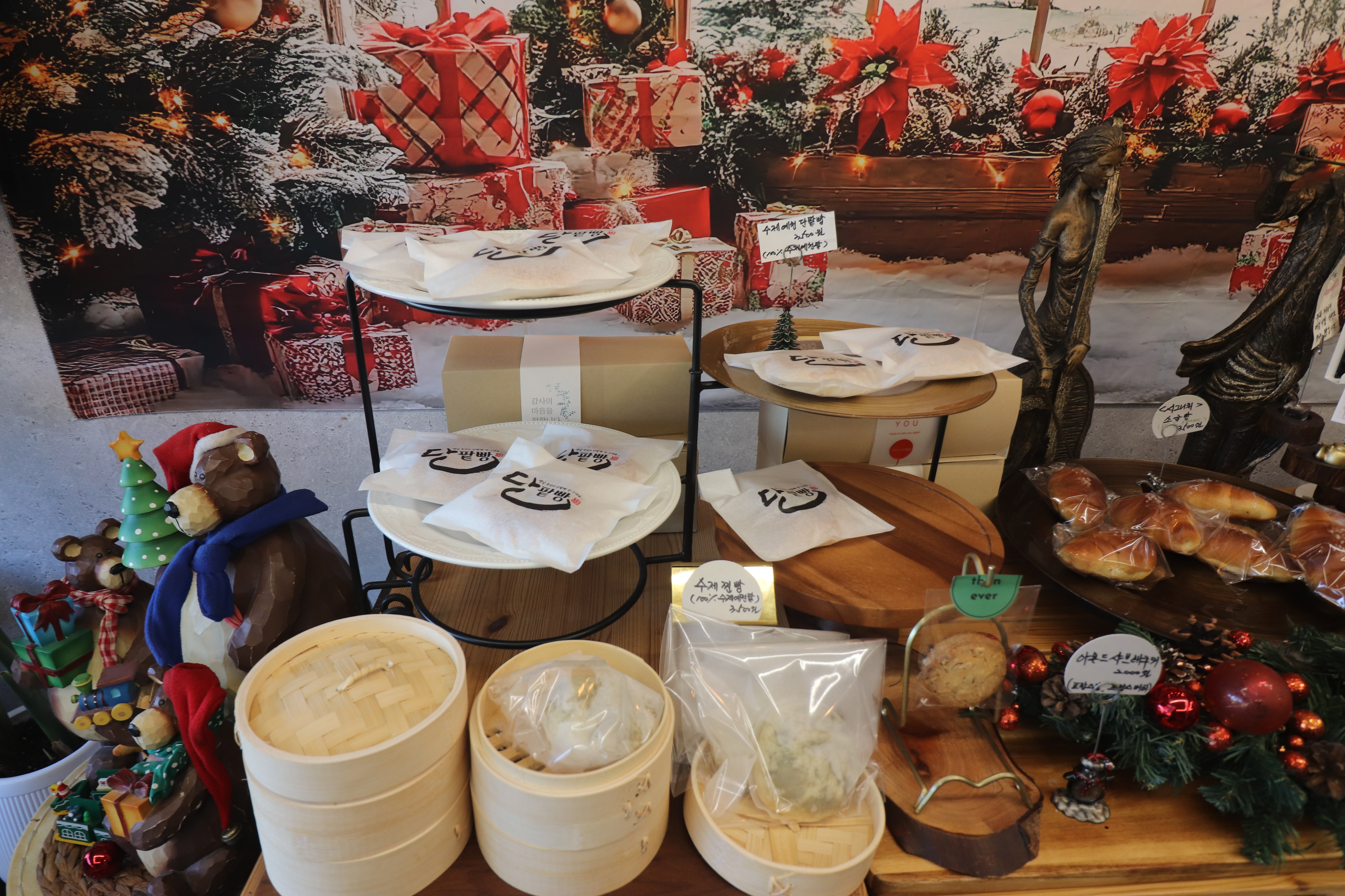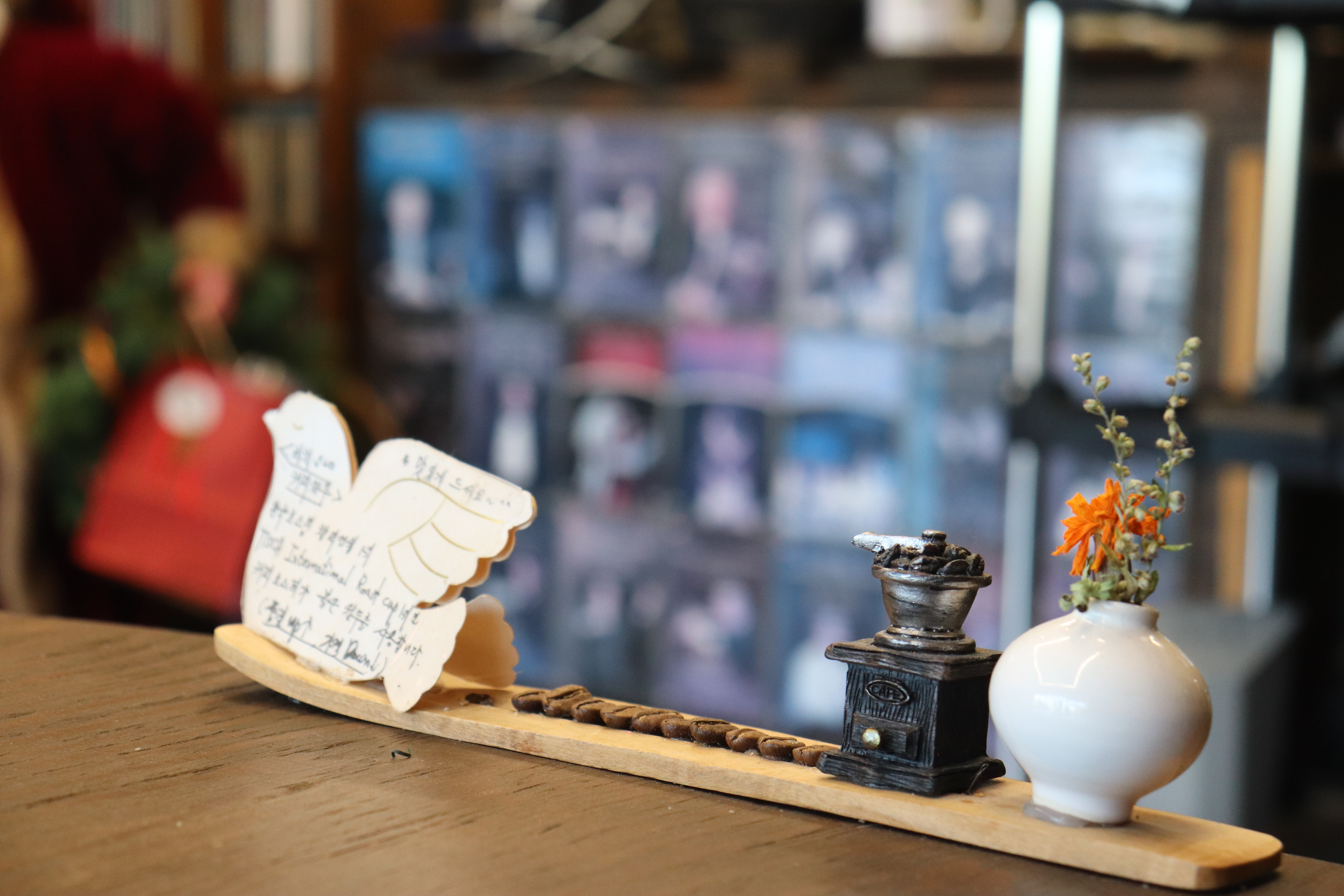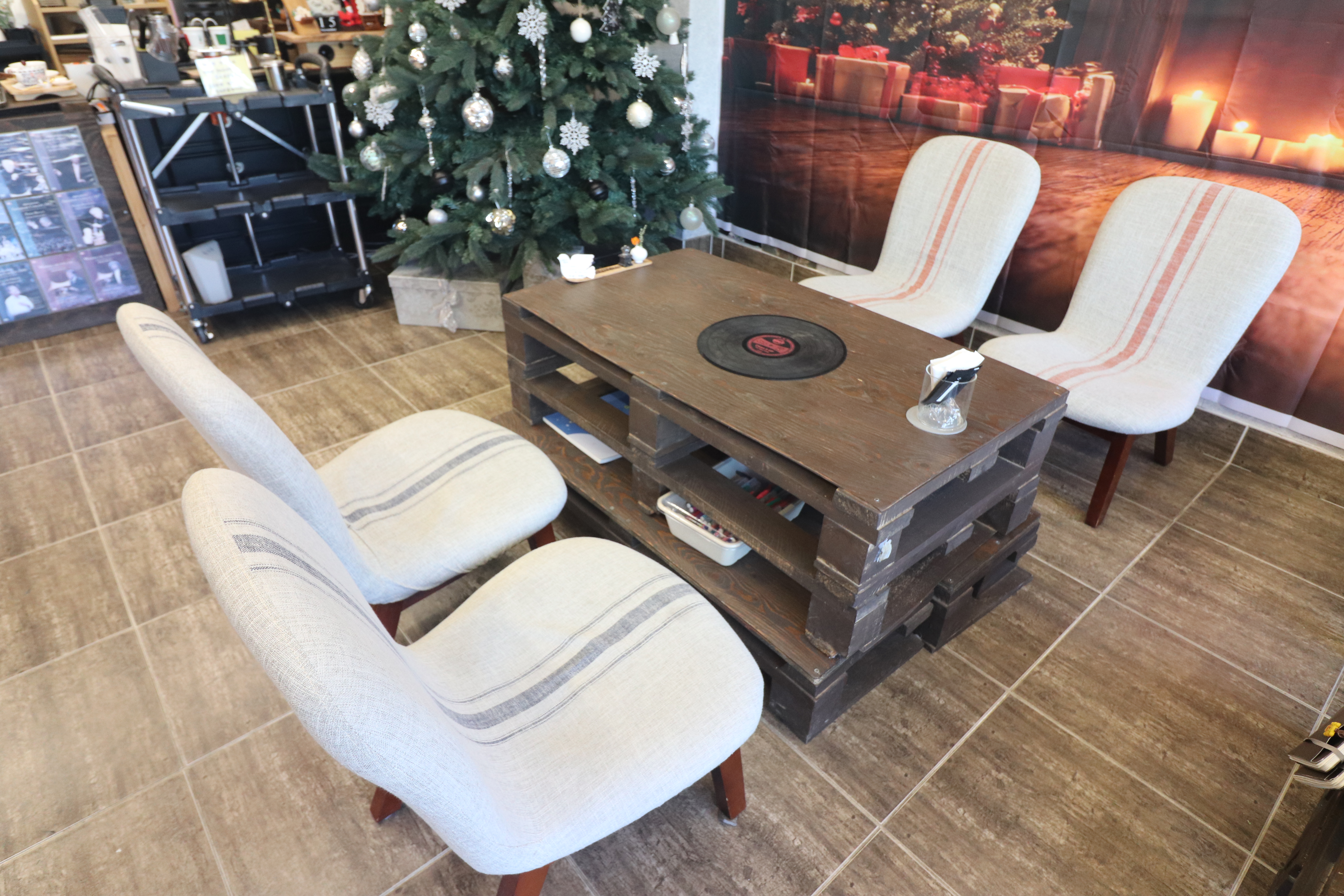 실내 공간은 전체적으로 꽤 넓고 쾌적한 편입니다. 전체적으로 따뜻한 우드 톤과 화이트 톤이 어우러진 인테리어는 포근하면서도 감성적인 분위기를 갖고 있습니다. 다가오는 겨울을 맞아 크리스마스 분위기가 물씬나는 디자인이라서 더욱 예쁜 카페였습니다.