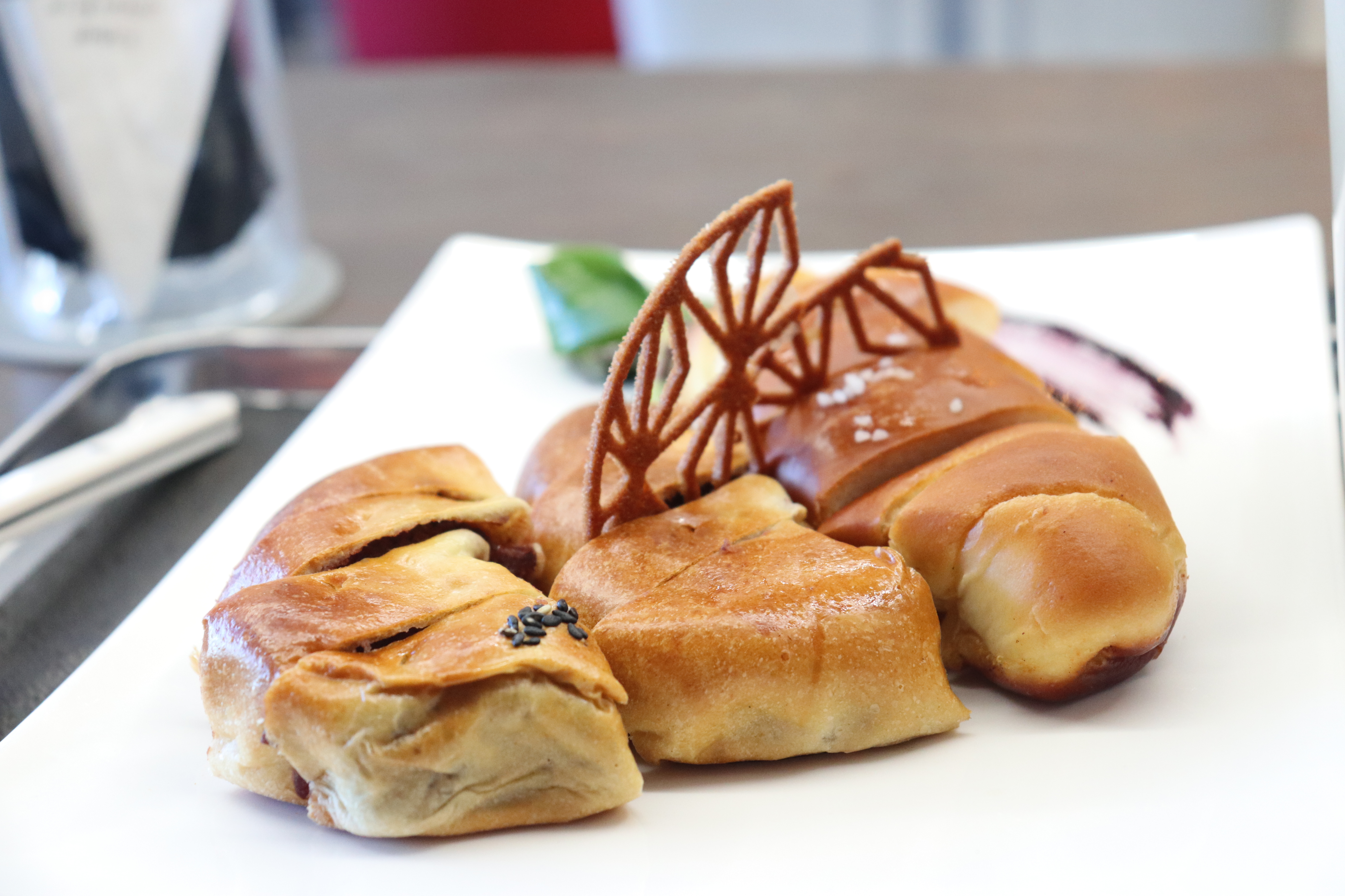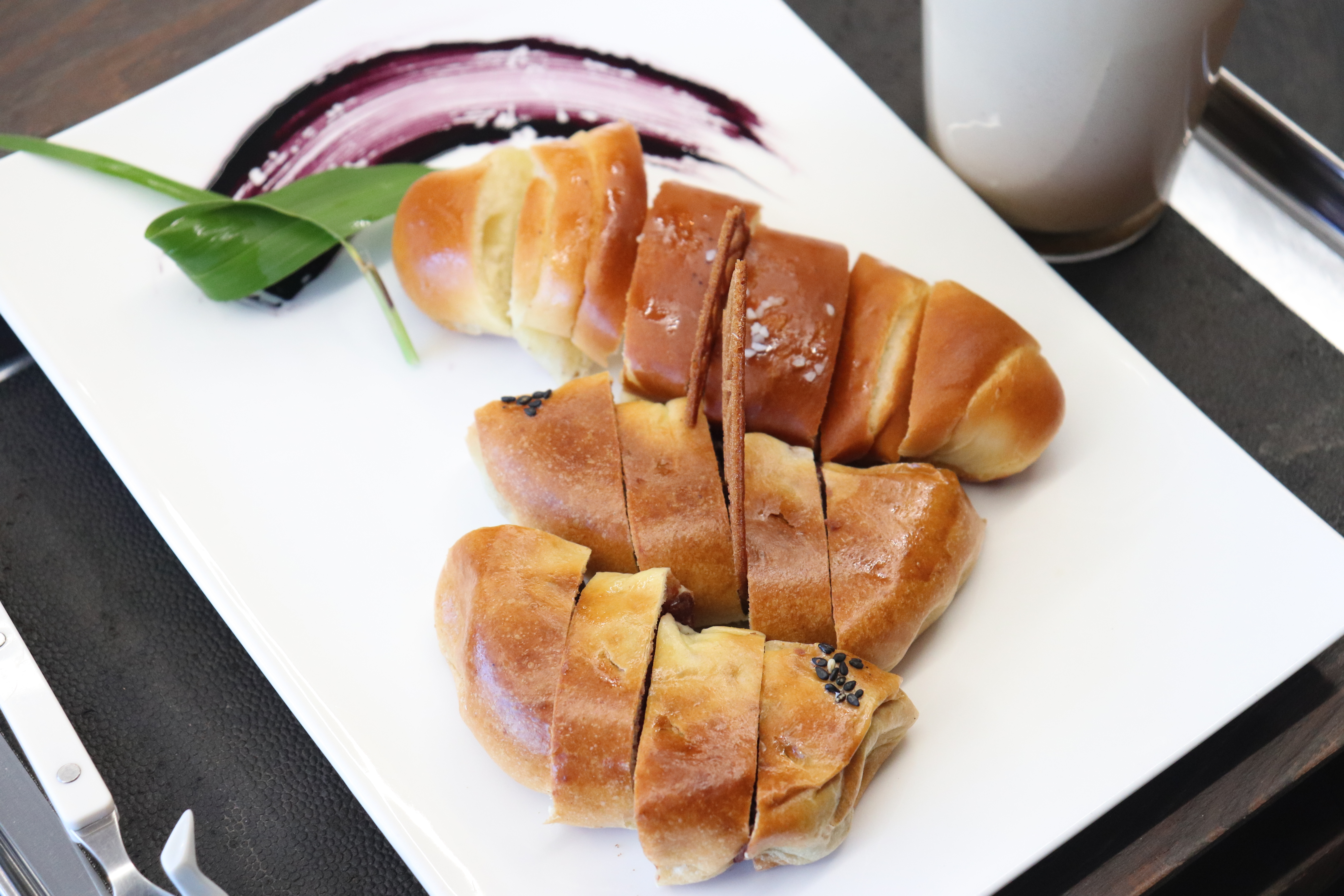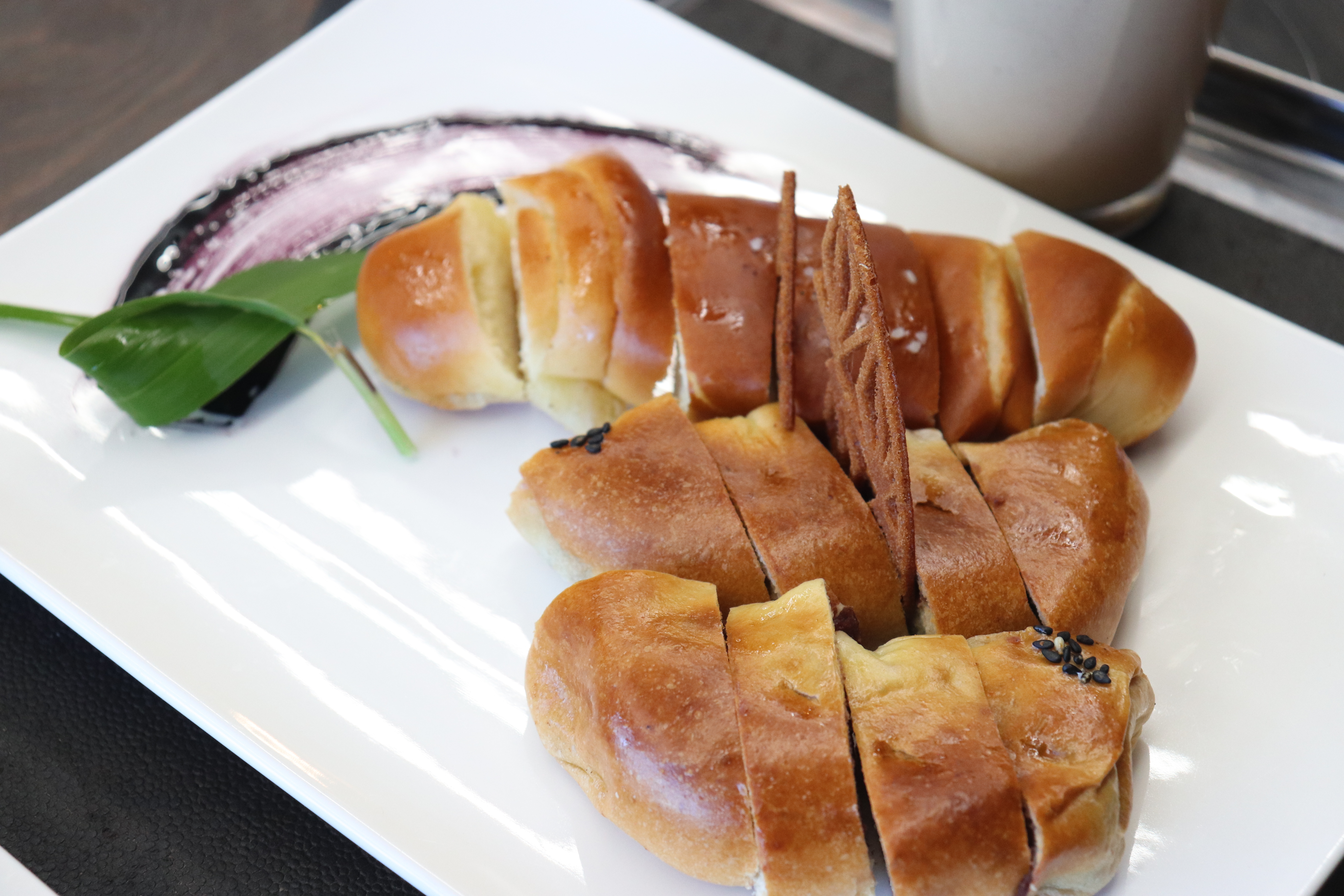 주문한 메뉴가 나왔습니다. 예쁜 접시에 담겨 나온 빵과 음료의 비주얼이 좋더군요.
