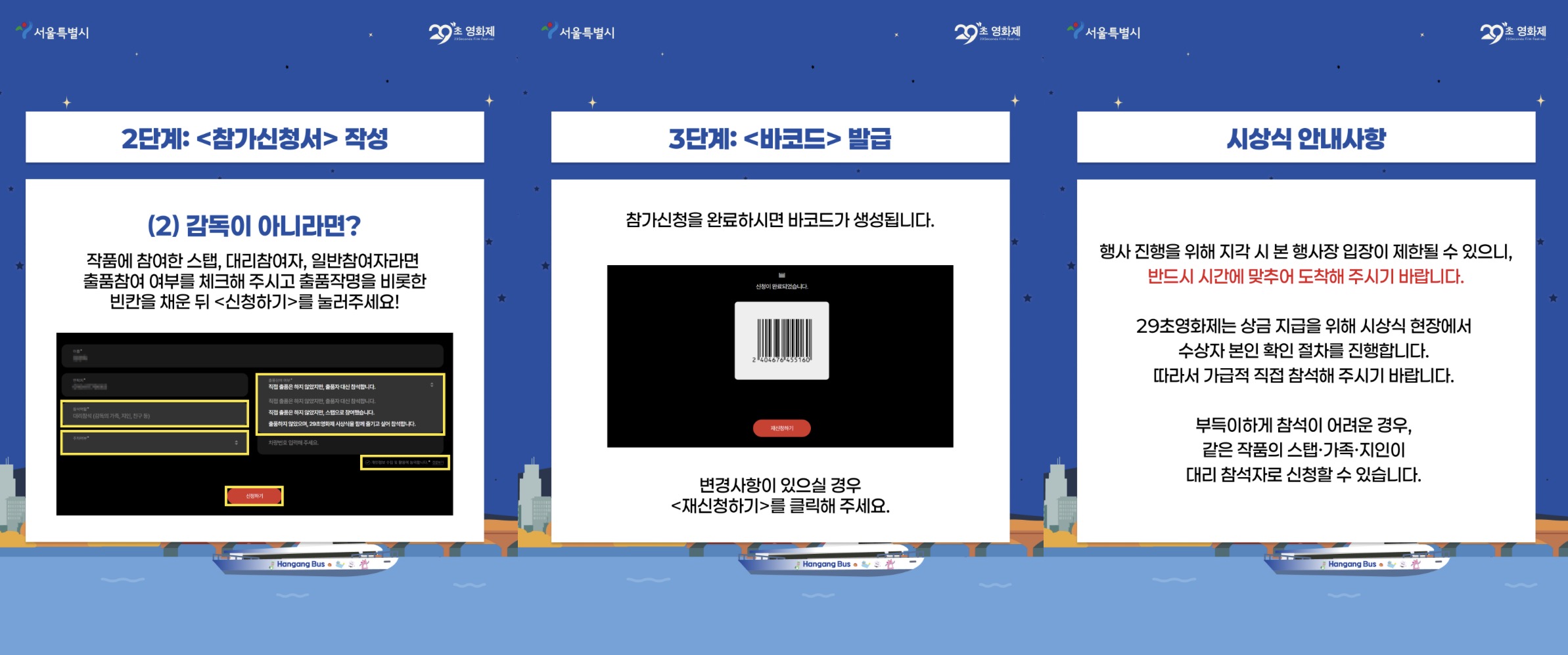 시상식 참가 방법은 크게 두 가지로 나뉩니다. 감독님들의 경우, 29초영화제 홈페이지에서 <시상식 참가신청>을 이용해서 참가신청서 작성 후 참가신청할 수 있습니다.