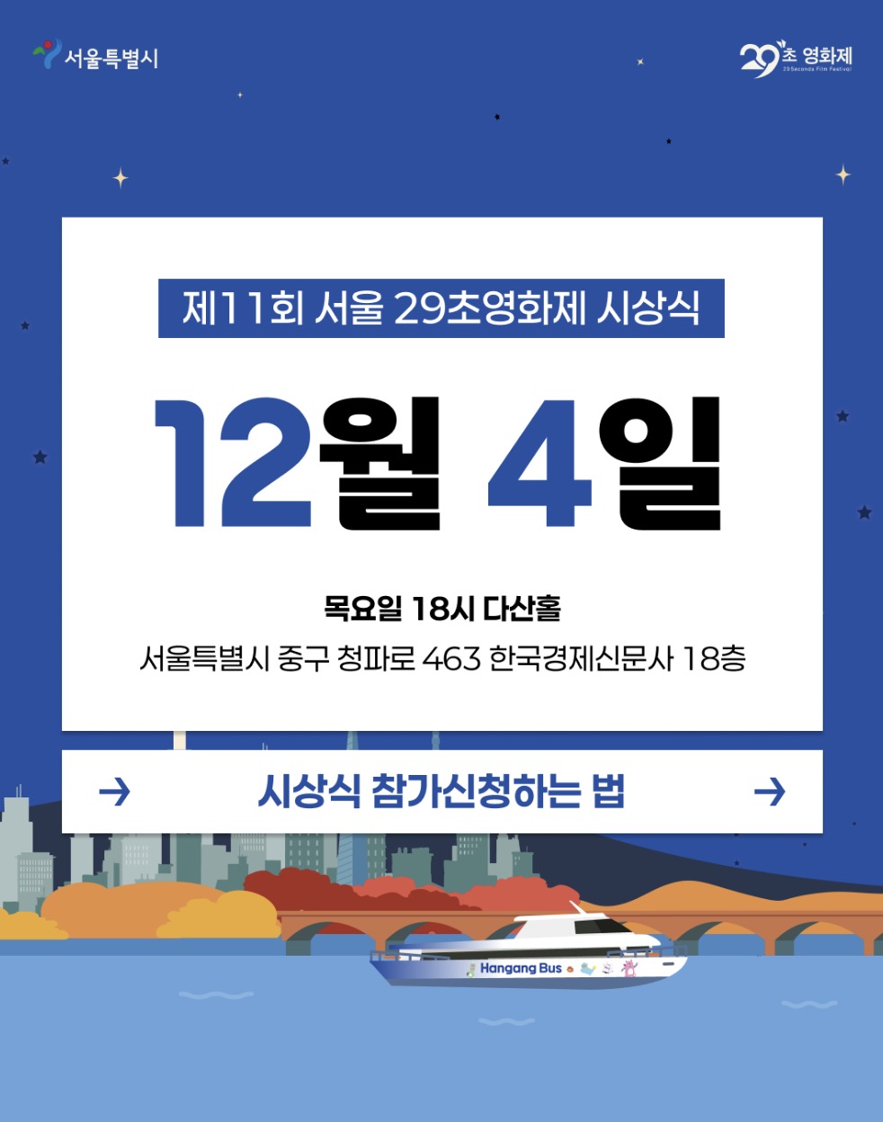 제11회 서울 29초영화제 출품이 마무리되고 시상식이 곧 열립니다. 12월 4일 18시, 한국경제신문사 다산홀에서 열리는데요. 목요일입니다.