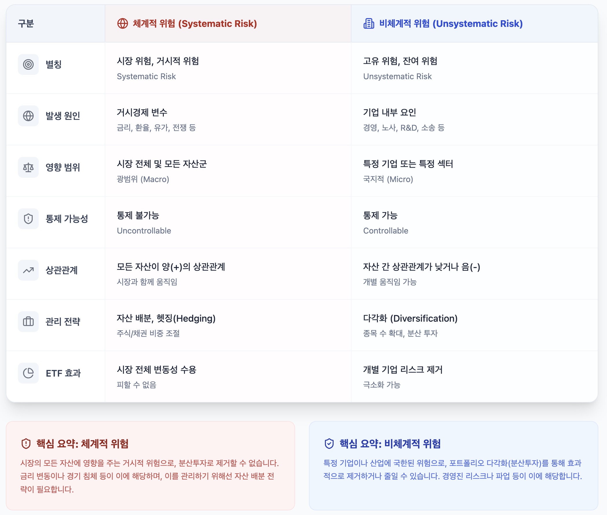 주식투자에서 리스크라고 하는건 크게 두 가지의 개념이 있다. 현대 포트폴리오 이론(Modern Portfolio Theory, MPT)에서는 위험을 체계적 위험과 비체계적 위험의 합으로 정의한다.
