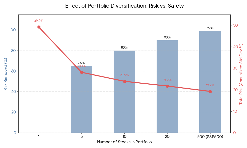 - 500개 종목(S&P 500) 보유 시: 비체계적 위험은 사실상 0에 수렴하며, 포트폴리오의 변동성은 시장 전체의 변동성(약 19.2%)과 거의 일치하게 된다. 이때에는 투자자가 개별 기업의 파산이나 실적 악화로 인해 치명적인 손실을 입을 확률을 구조적으로 거의 차단했다는 뜻이다.