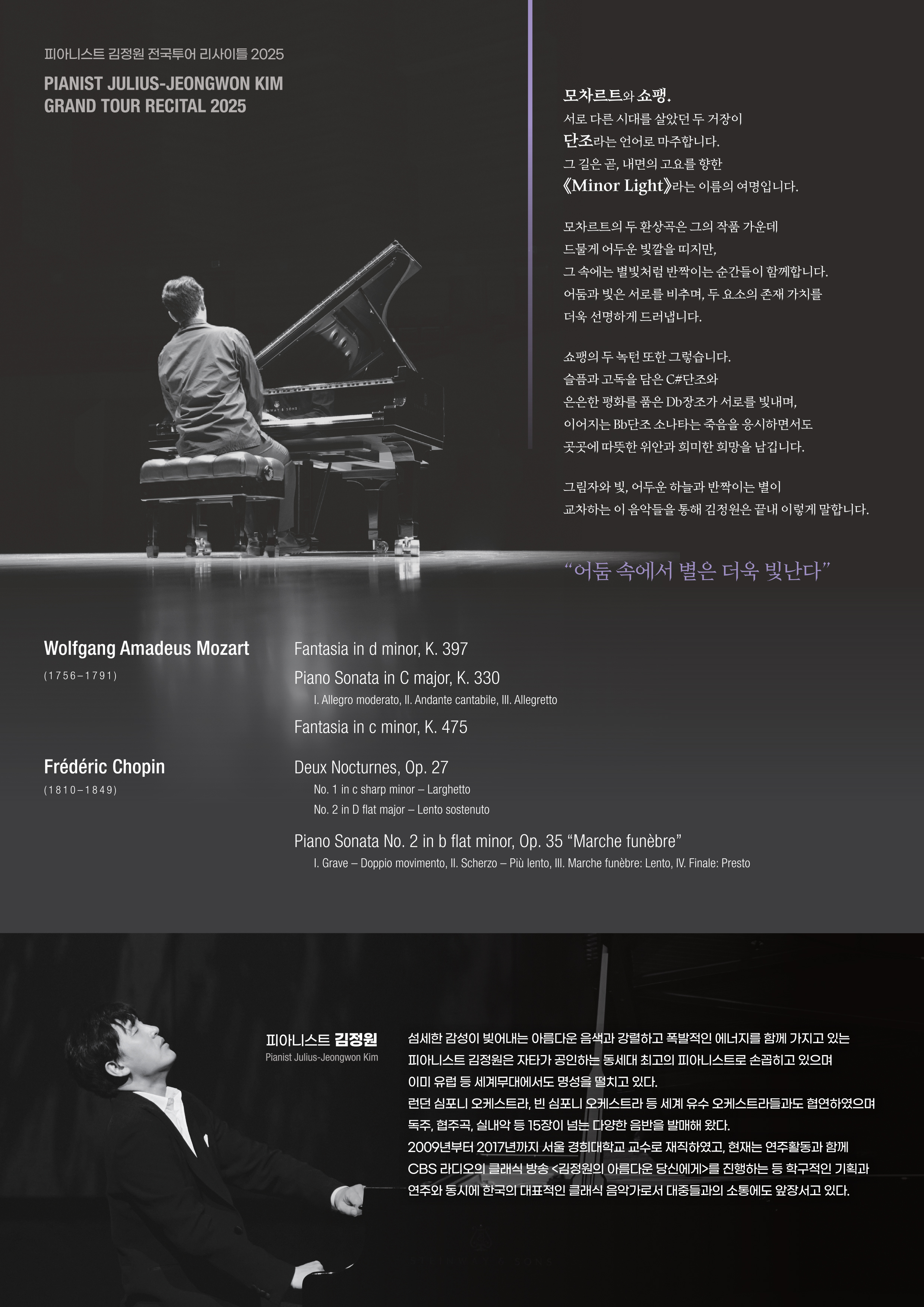 이번 수성아트피아 리사이틀의 부제는 <Minor Light>입니다. 이는 작품이 가진 단조(Minor)의 색채 속에서 인간 내면의 빛(Light)을 찾아간다는 중의적인 의미를 담고 있다고 합니다. 김정원은 이번 무대에서 모차르트와 쇼팽, 두 작곡가의 곡들을 통해 비탄과 고독 속에서도 끝내 발견하게 되는 희망과 회복의 메시지를 전하려 합니다.