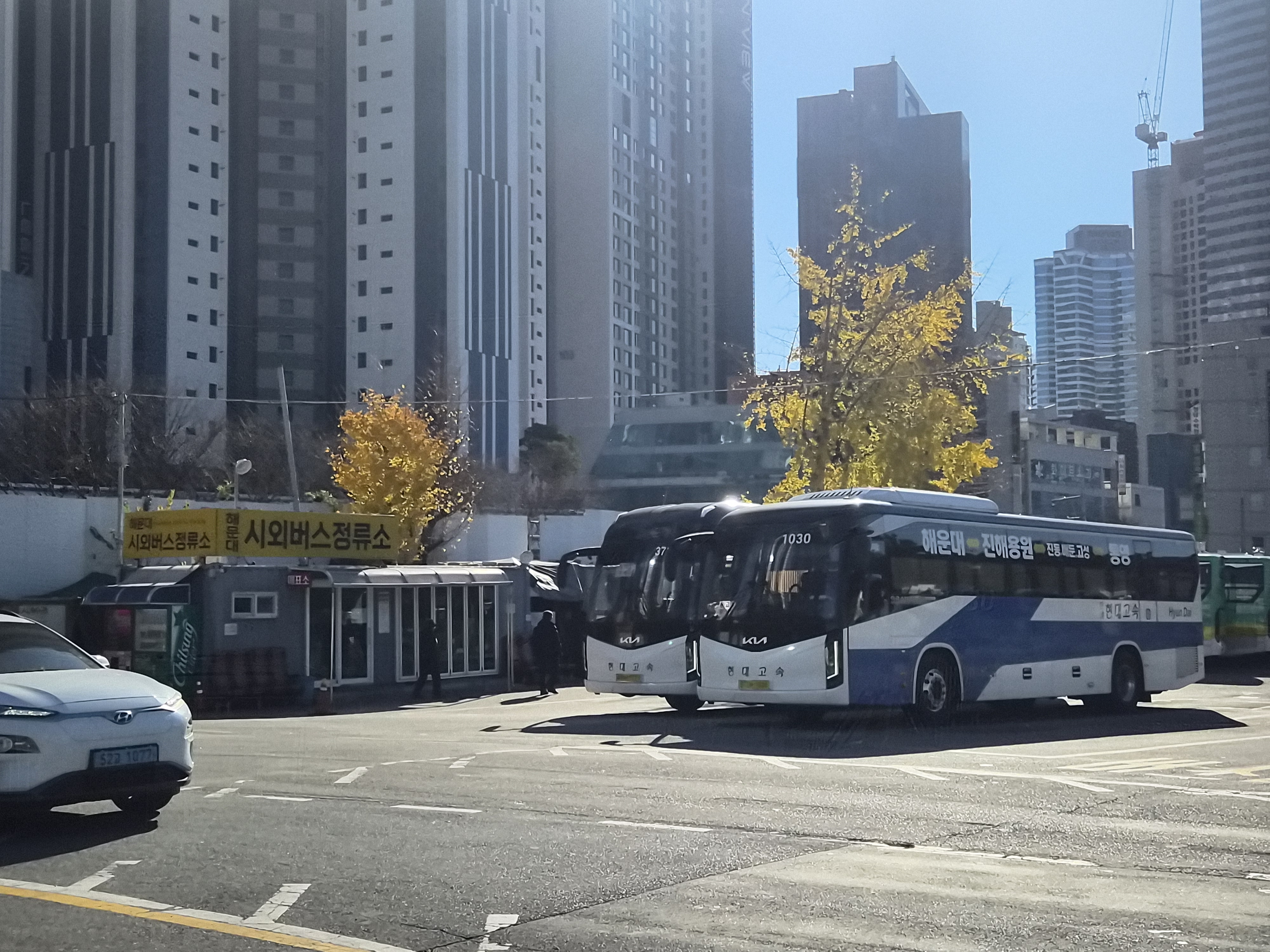 도착하는 곳은 부산해운대시외버스정류소. 그냥 간이 버스정류소 같은 곳이라서 편의시설 같은건 없고 화장실도 남자 화장실은 소변기쪽 다 보이게 문을 아예 못닫게 되어있기도하고 여러가지로 좀 불편하지만 해운대갈 때 제일 빨리 갈 수 있어서 소중한 곳이다. 여기에서 걸어서 해운대까지 약 10분~15분 저도 걸리며 1km 정도 떨어져있다. (은행나무에 단풍잎이 아직 있다고...?)
