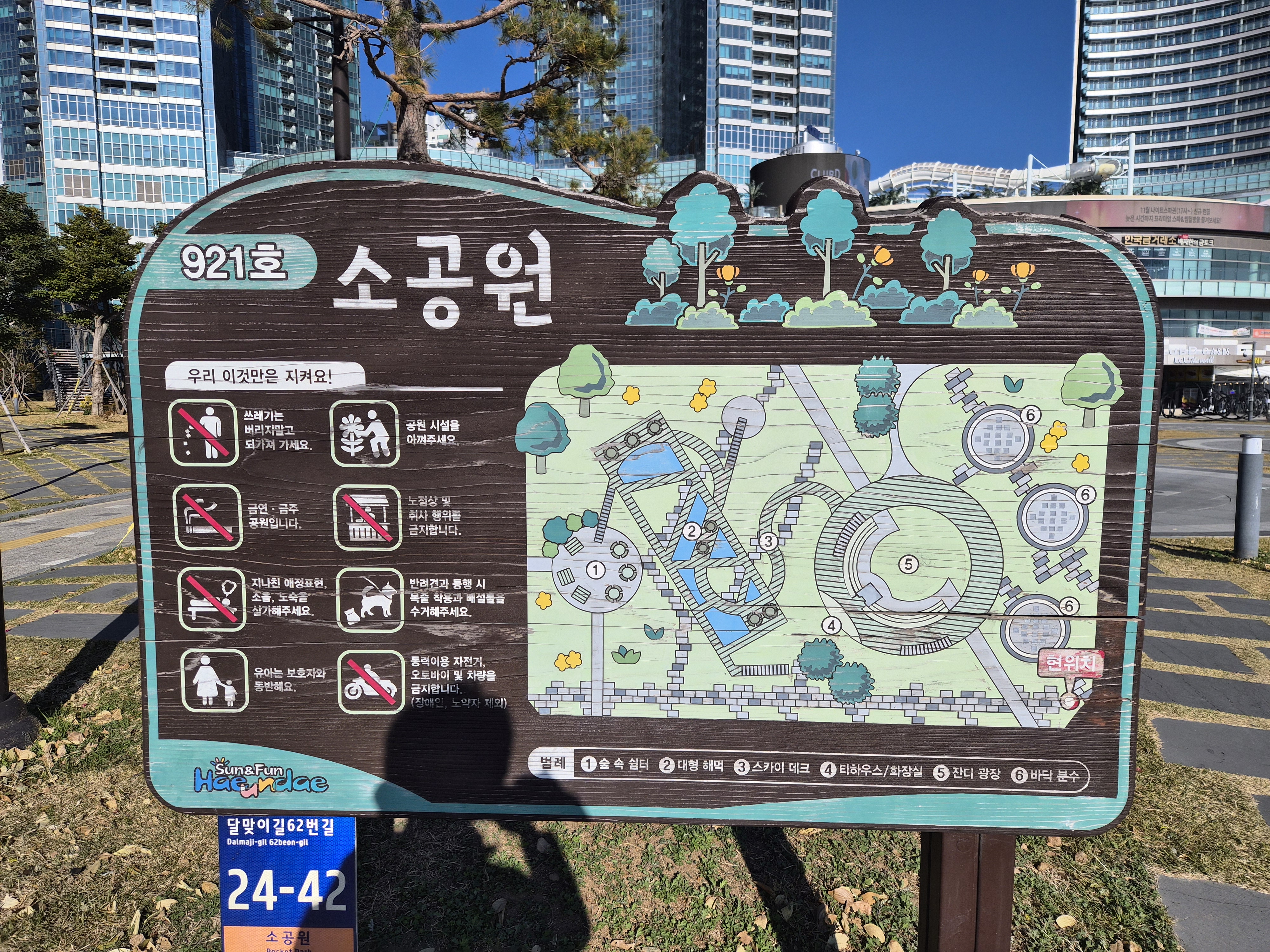 해운대 중앙쪽 부근에 있는 921호 소공원. 예전에는 없었던 것 같은데 소공원이 예쁘게 만들어져있었고 이쪽에 화장실이 있었다. 바로옆에 스타벅스 엘시티점이 있는데 사람들이 무지하게 많아서 자리가 없어서 이용하지 못했다. 2번이나 들락거렸다.