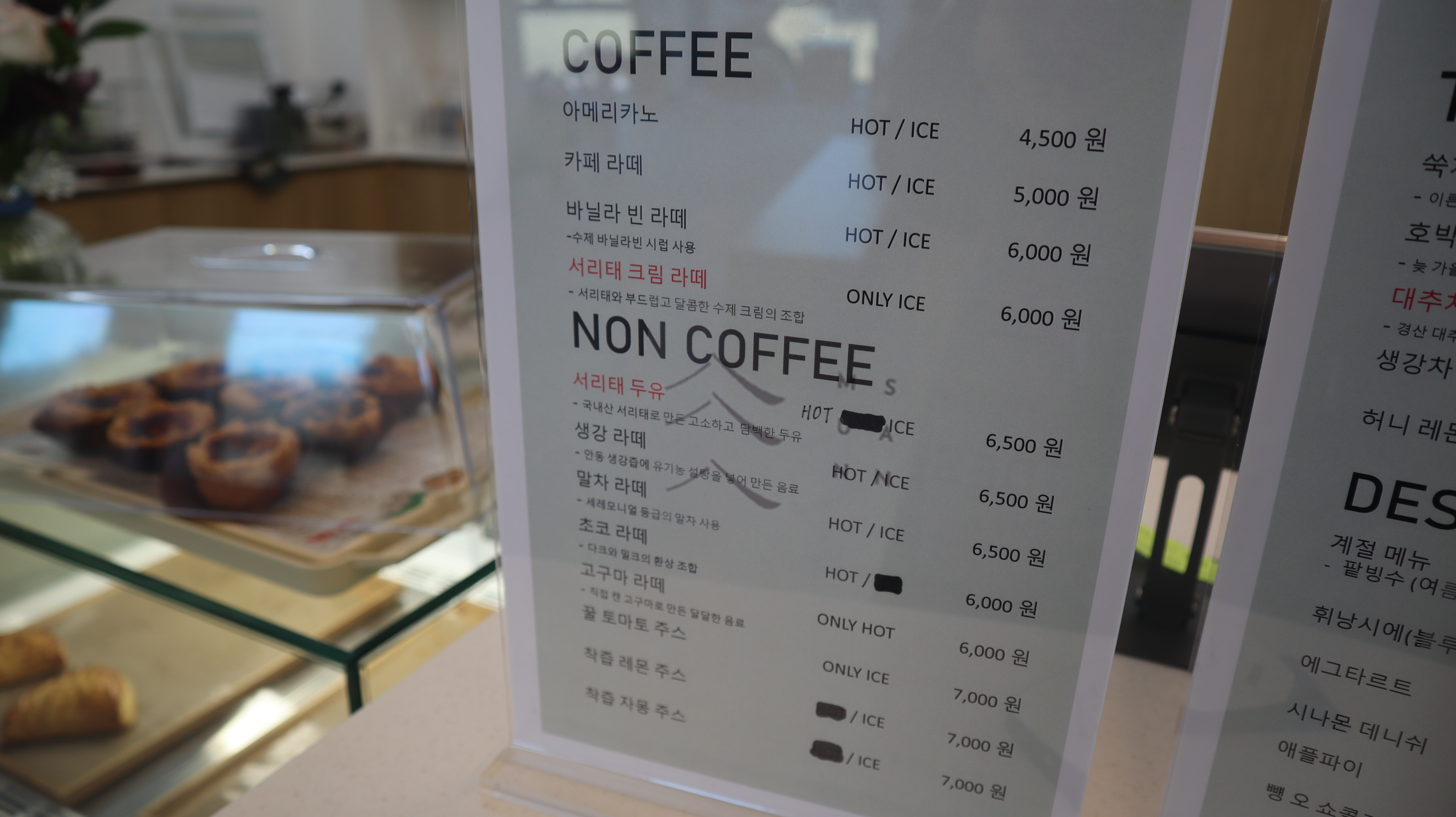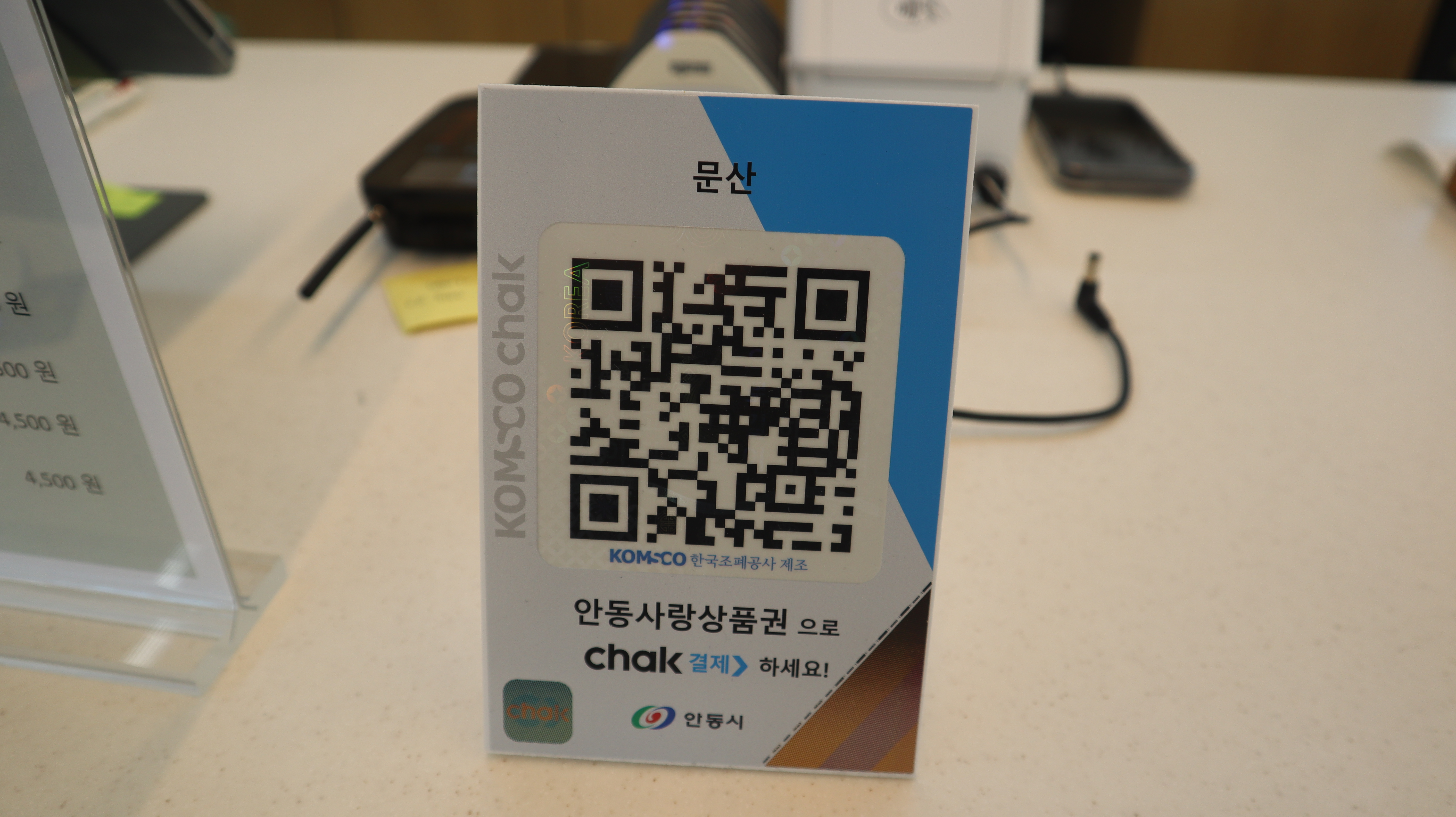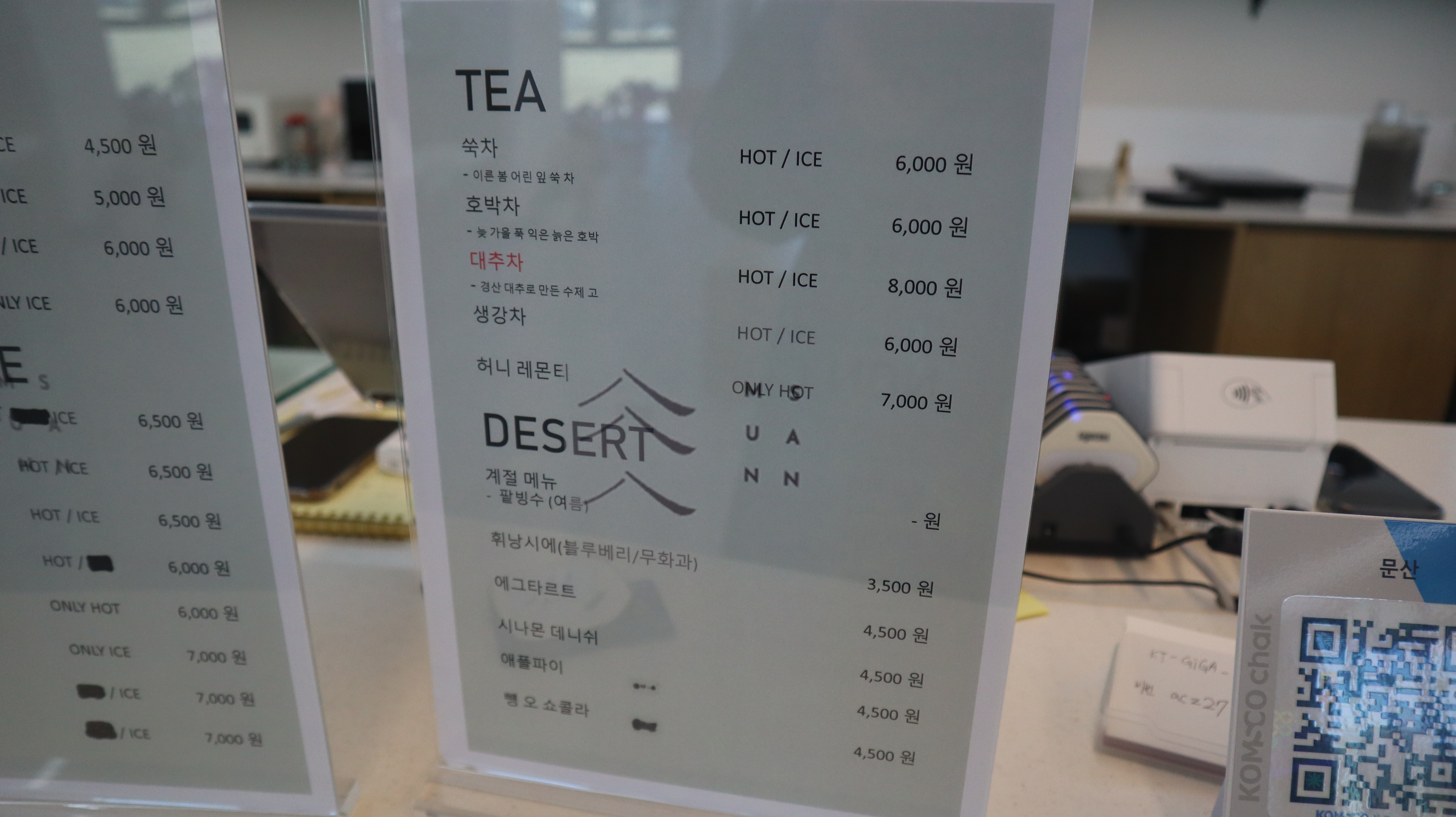 카페 메뉴를 살펴봤습니다. 커피는 물론이고 남녀노소 누구나 즐길 수 있는 논커피(Non-coffee) 음료가 있었고, 몇 가지 전통차도 준비되어 있었습니다. 저는 서리태 크림 라떼와 서리태 두유를 골라보았습니다. 붉은색으로 표시된 메뉴가 아마 시그니처가 아닐까 싶더라고요. 지역화폐인 안동사랑상품권 결제도 가능했습니다.