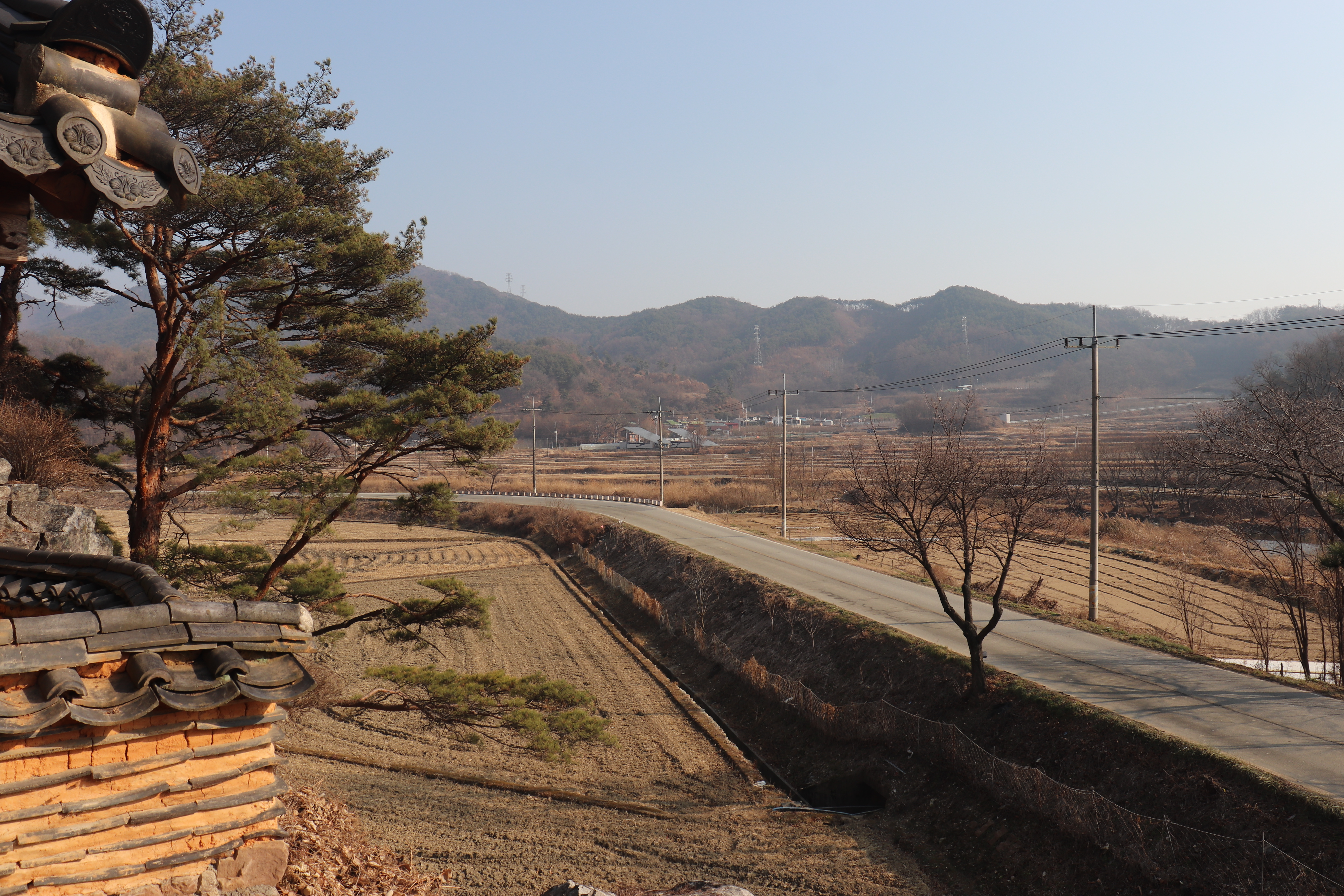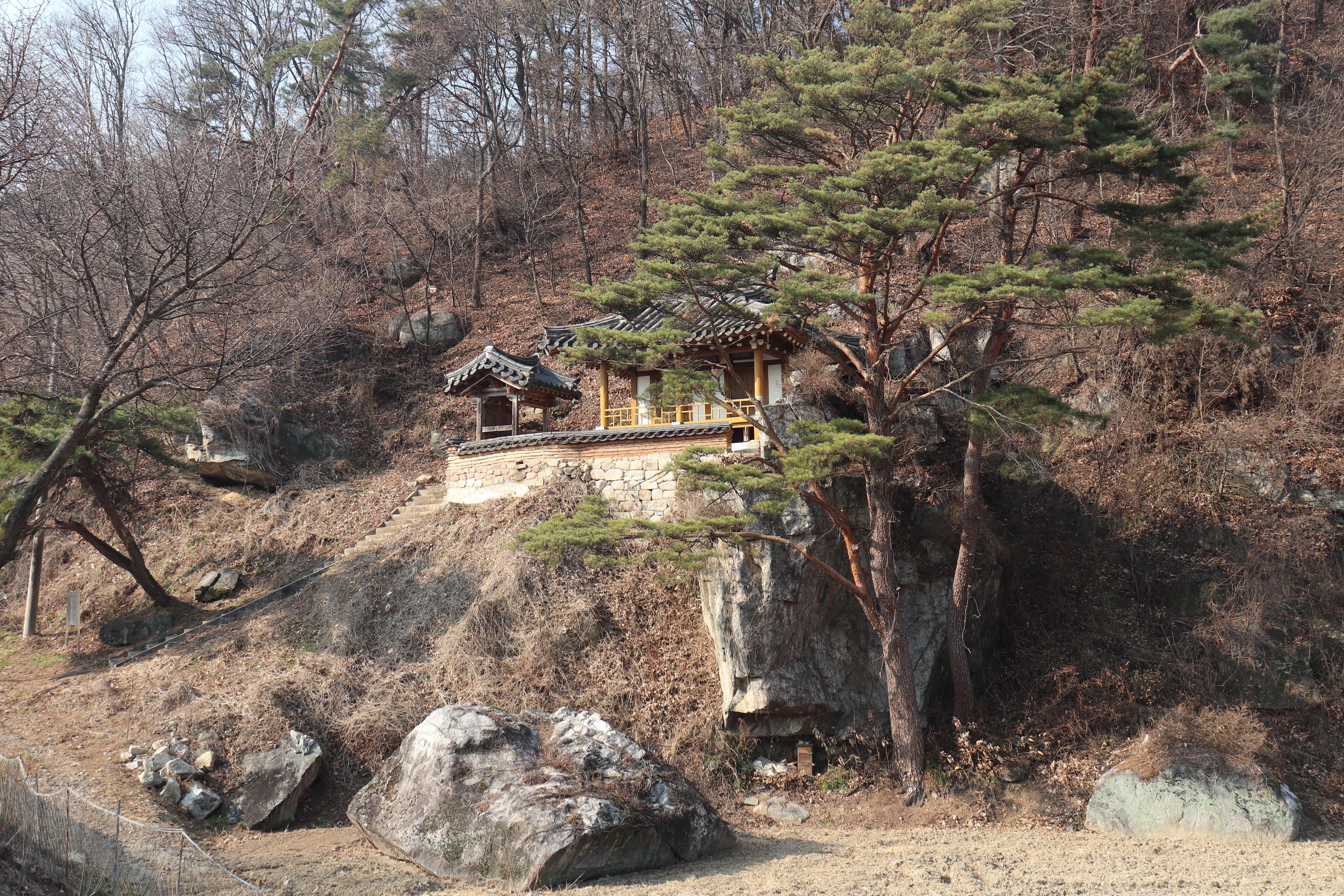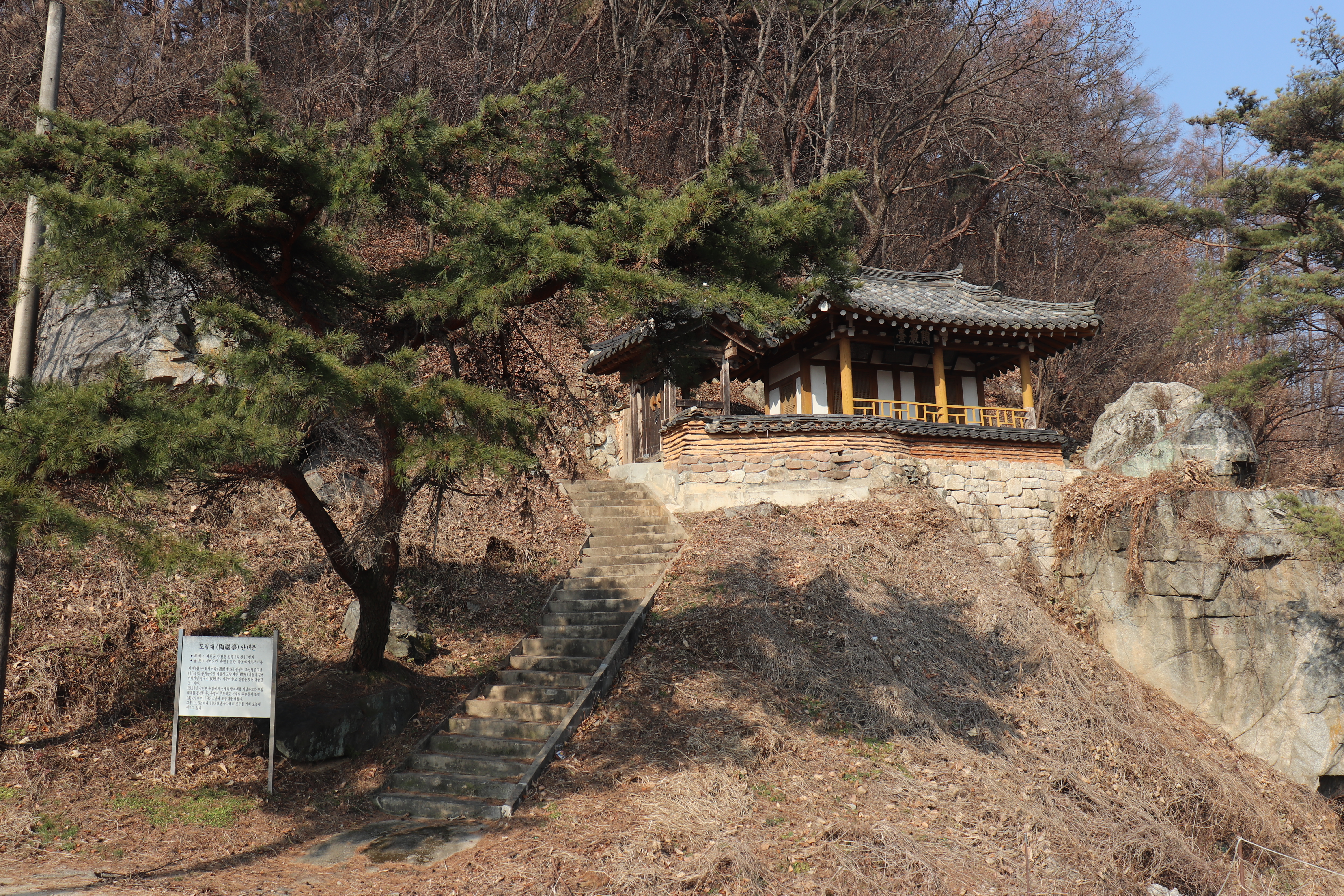 도암대쪽으로 오를 수 있는 계단을 올라가면 도암대에서 바깥 풍경을 바라볼 수 있습니다. 도암대 주변에 소나무 몇 그루가 바위틈에서 자라고 있어서 볼거리가 있고요. 겨울이라서 약간 황량한 느낌도 있었지만 겨울 풍경을 제대로 만끽할 수 있었던 것 같습니다. 여름이나 가을에 방문하면 예쁜 논밭을 풍경으로 알록달록한 색깔의 뷰를 볼 수 있을 것 같습니다.