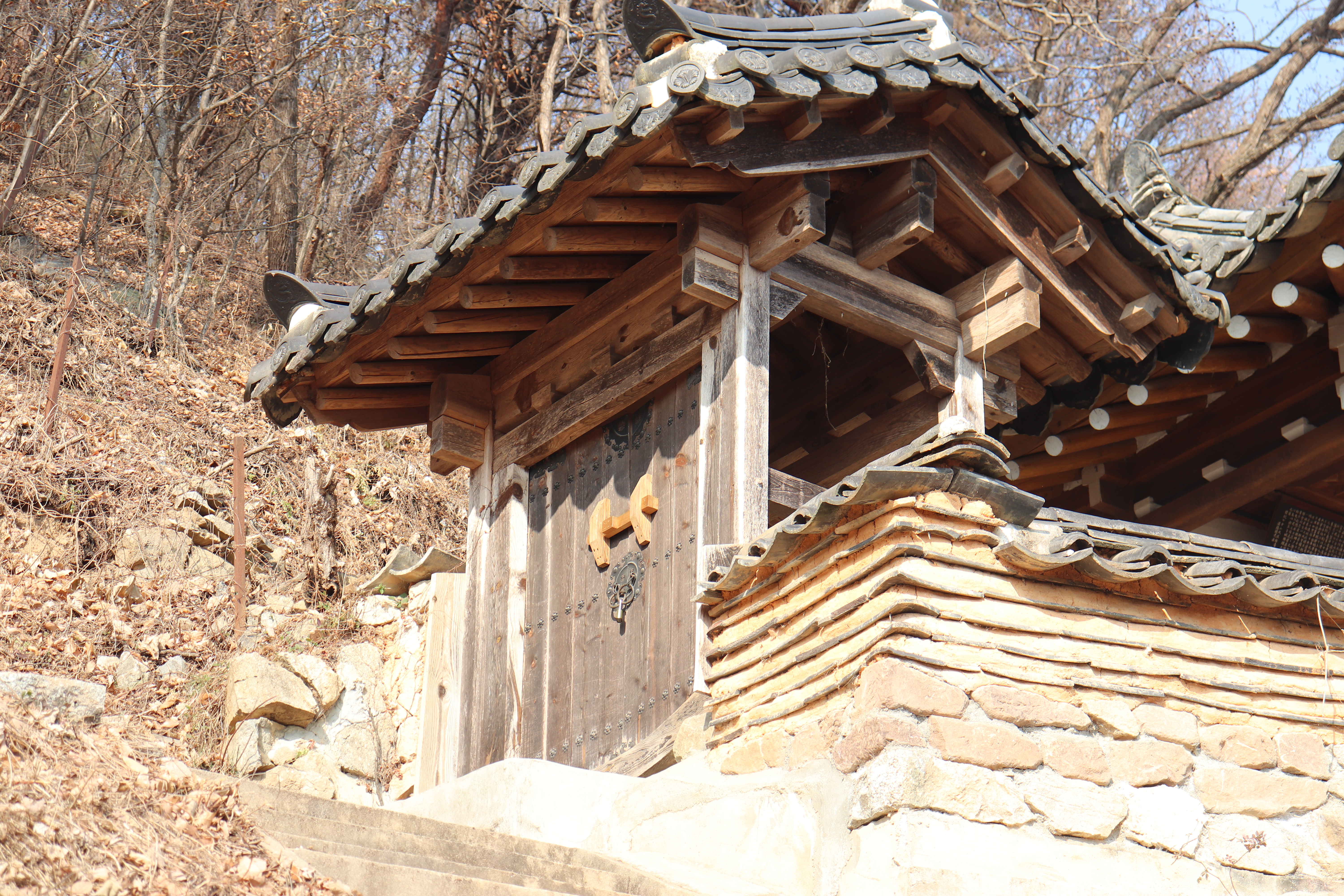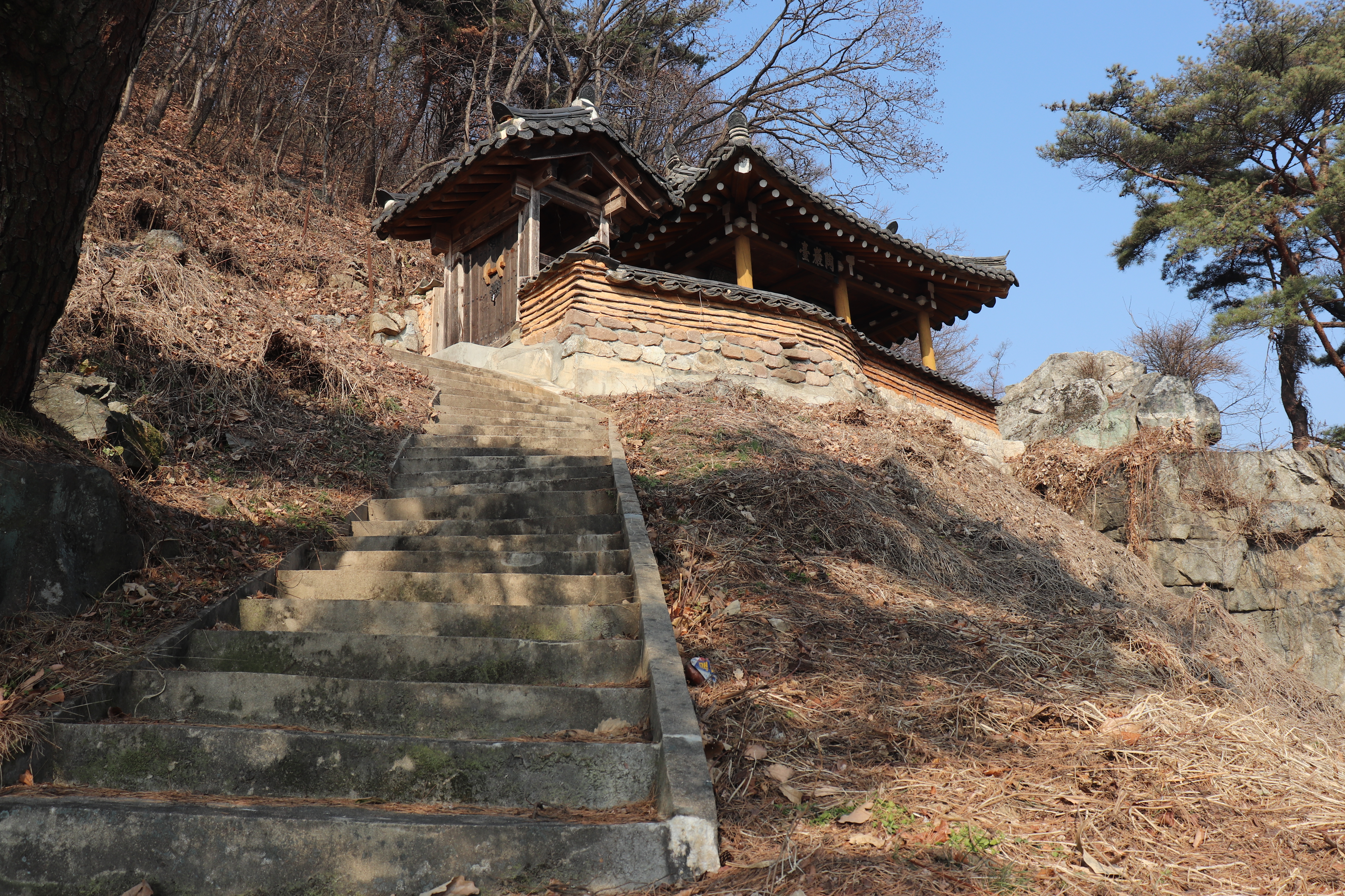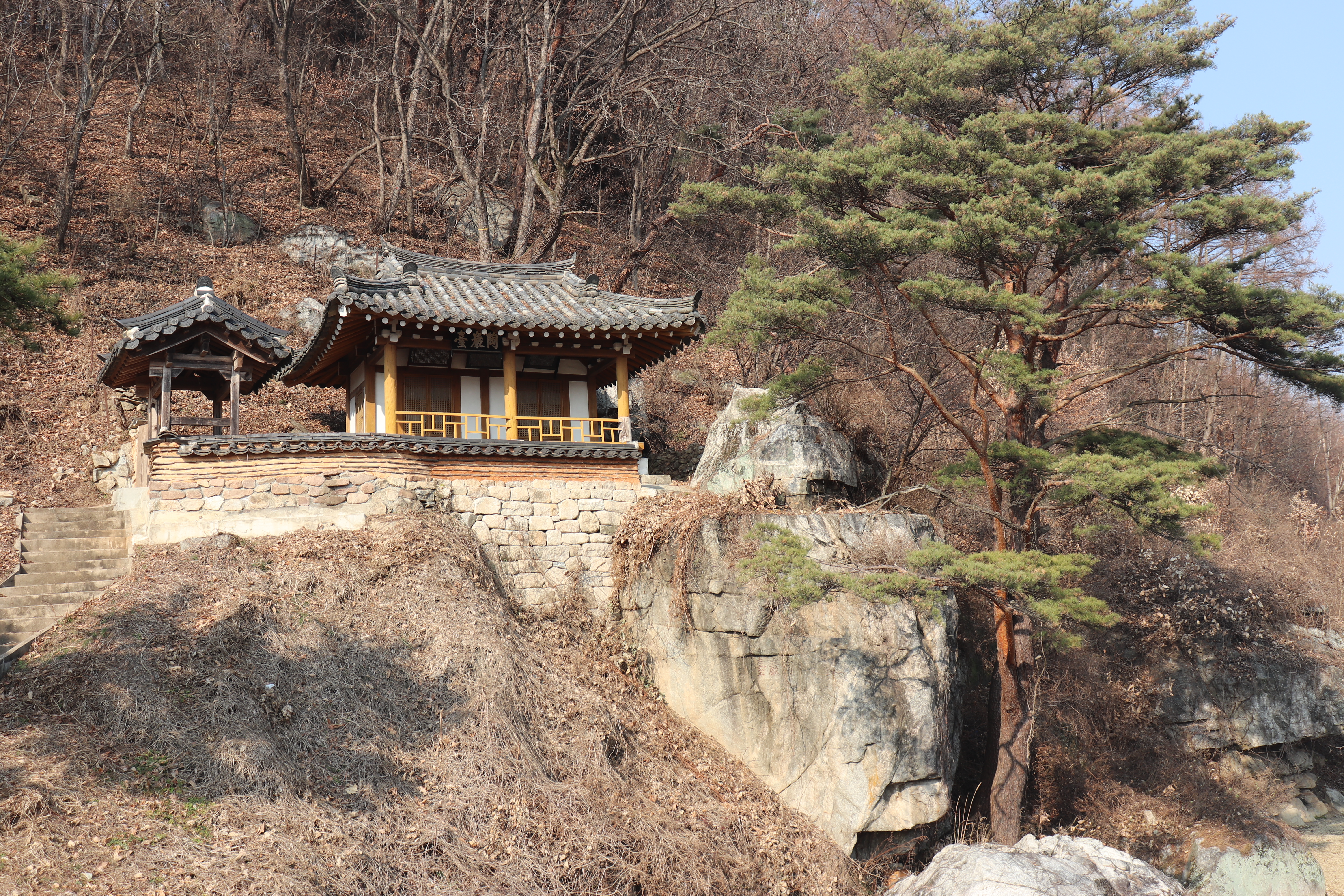 도암대쪽으로 오를 수 있는 계단을 올라가면 도암대에서 바깥 풍경을 바라볼 수 있습니다. 도암대 주변에 소나무 몇 그루가 바위틈에서 자라고 있어서 볼거리가 있고요. 겨울이라서 약간 황량한 느낌도 있었지만 겨울 풍경을 제대로 만끽할 수 있었던 것 같습니다. 여름이나 가을에 방문하면 예쁜 논밭을 풍경으로 알록달록한 색깔의 뷰를 볼 수 있을 것 같습니다.