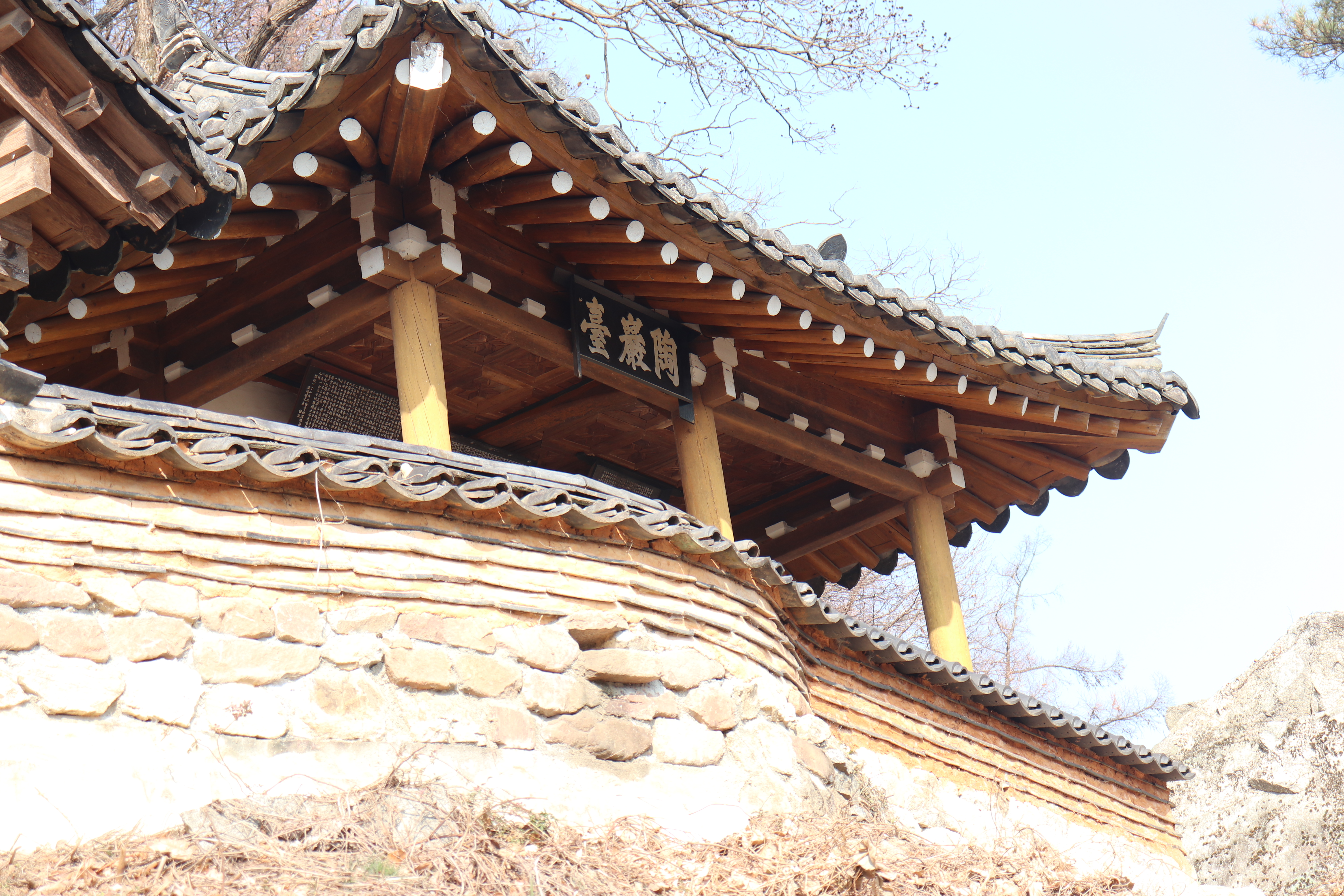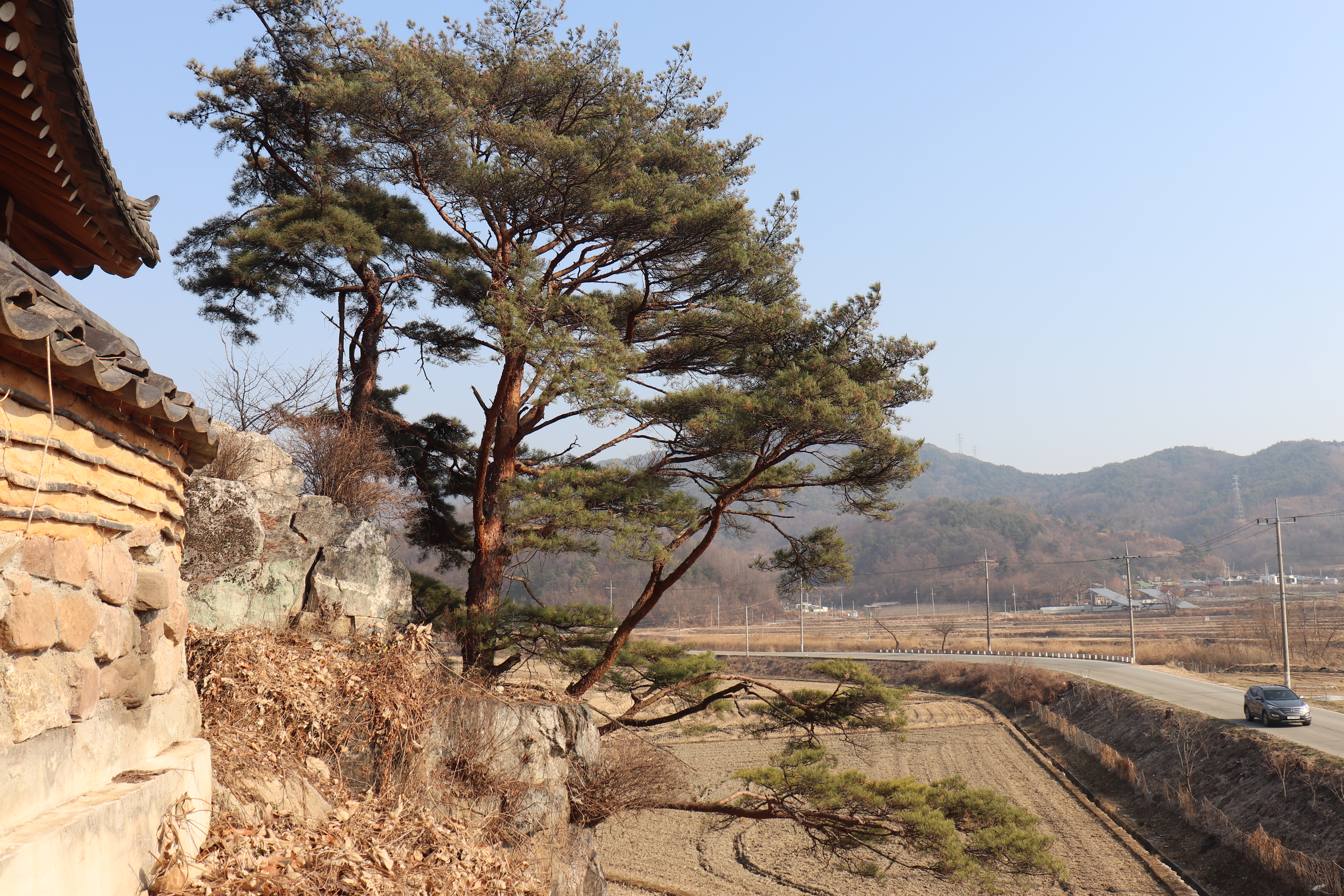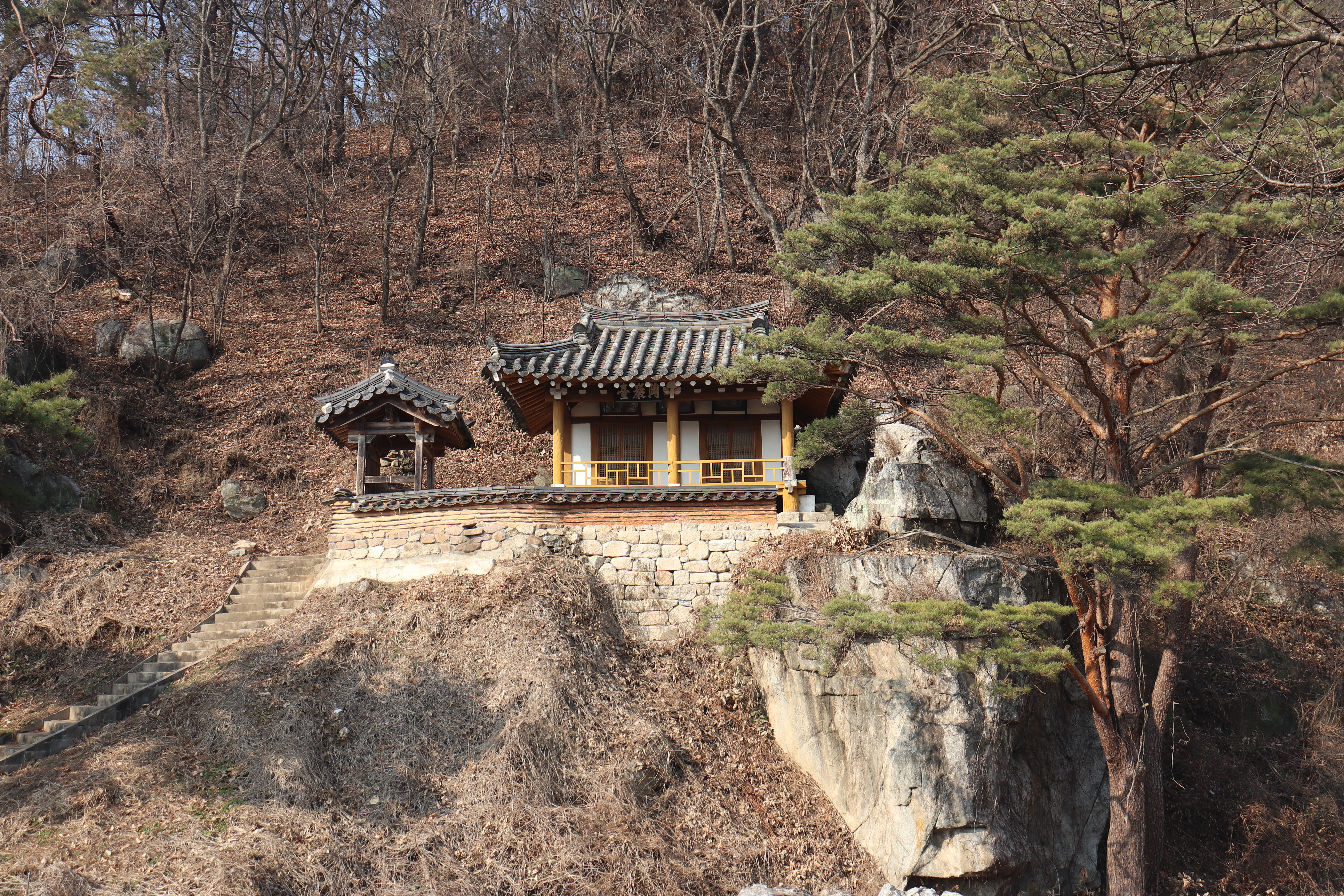 도암대쪽으로 오를 수 있는 계단을 올라가면 도암대에서 바깥 풍경을 바라볼 수 있습니다. 도암대 주변에 소나무 몇 그루가 바위틈에서 자라고 있어서 볼거리가 있고요. 겨울이라서 약간 황량한 느낌도 있었지만 겨울 풍경을 제대로 만끽할 수 있었던 것 같습니다. 여름이나 가을에 방문하면 예쁜 논밭을 풍경으로 알록달록한 색깔의 뷰를 볼 수 있을 것 같습니다.