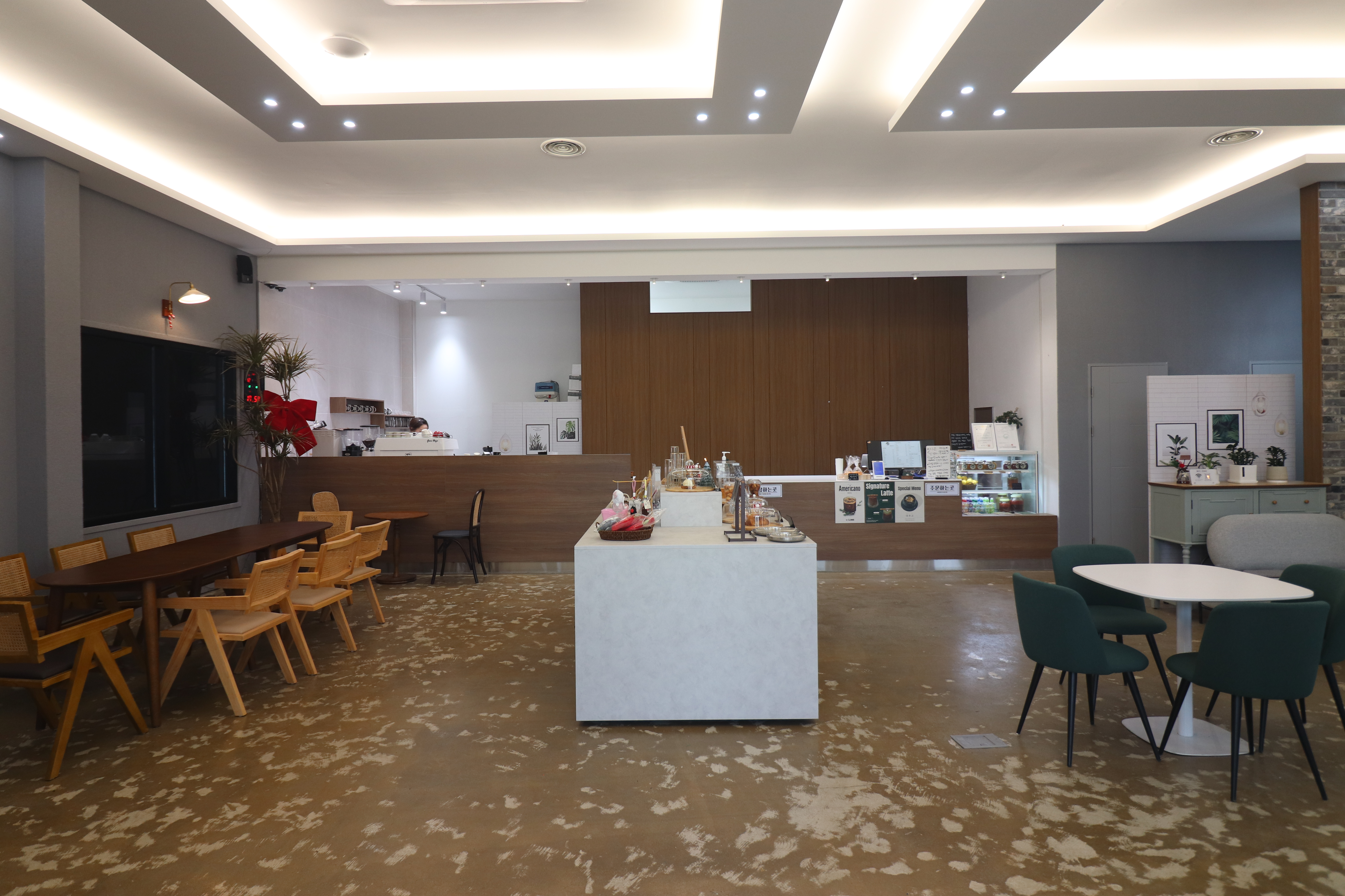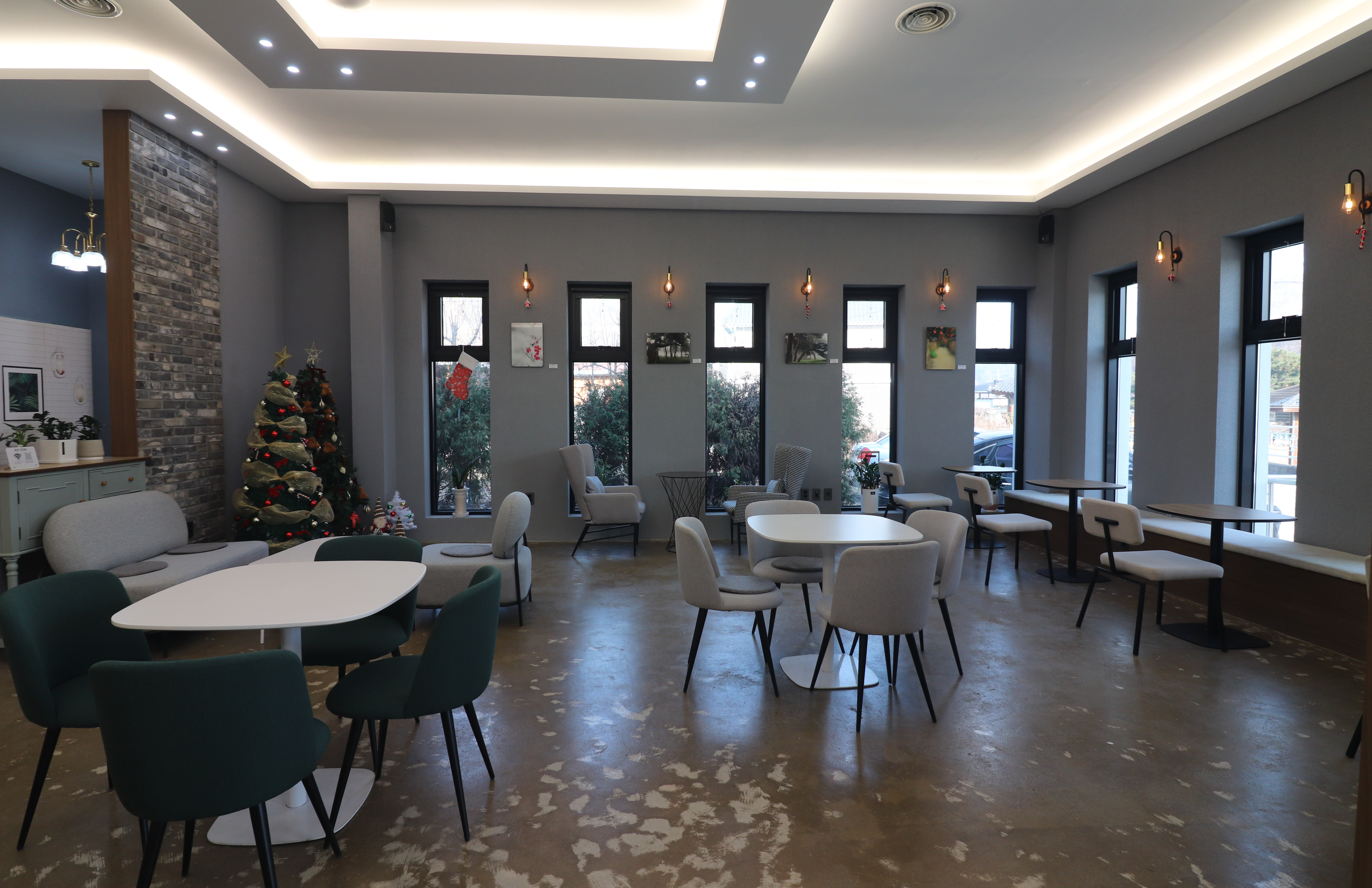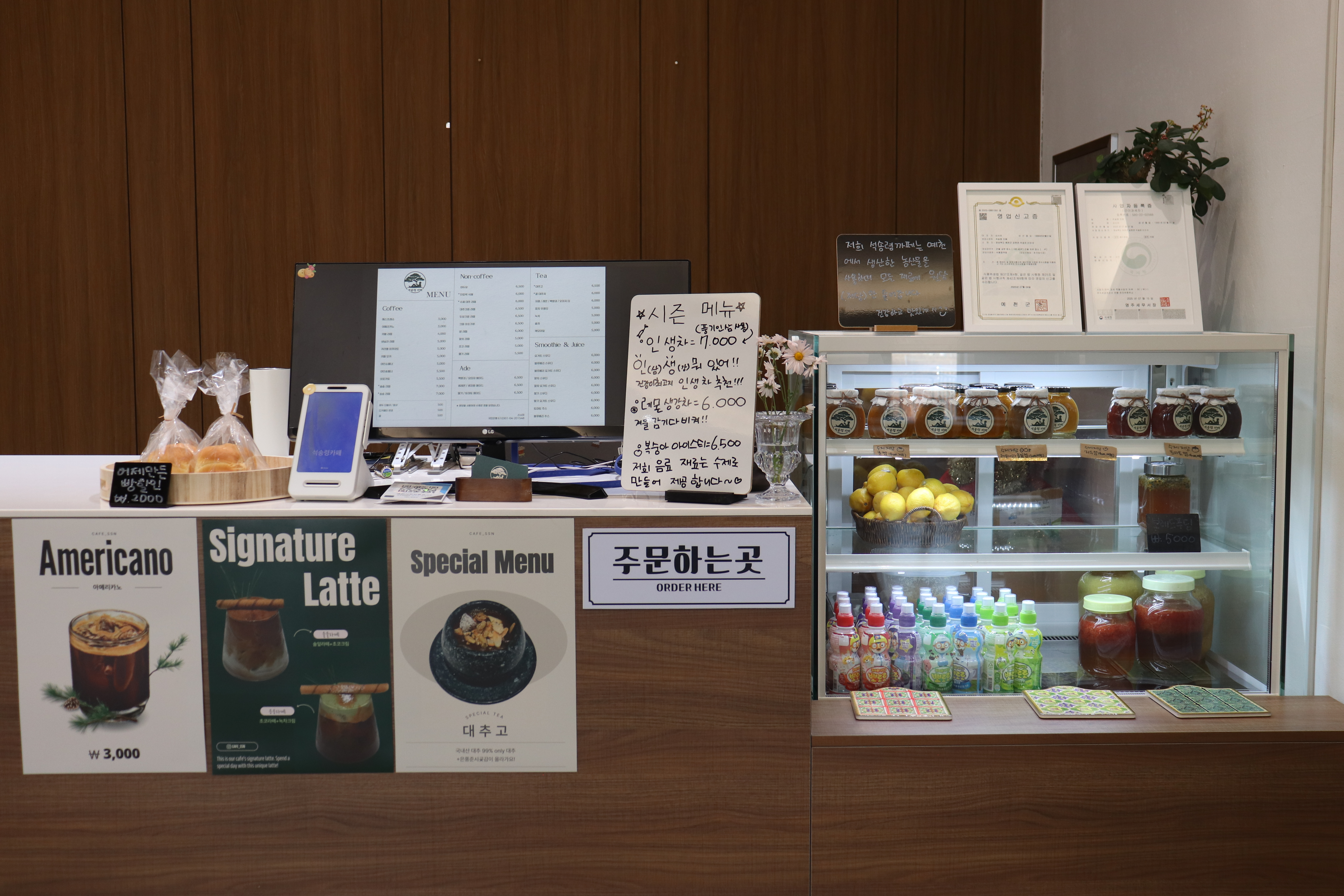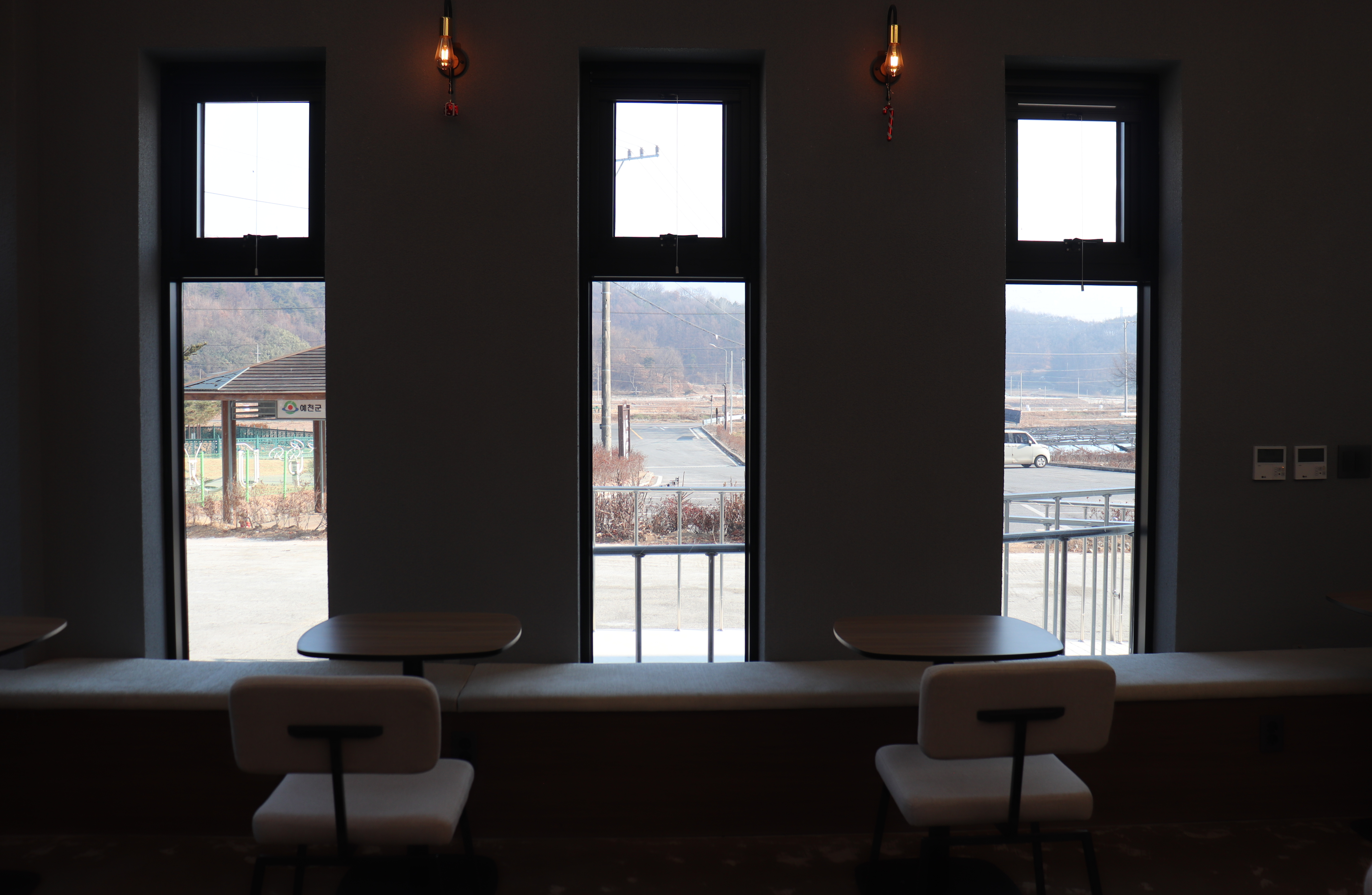 카페 내부에서 창가쪽에 자리를 잡으면 창 밖으로 석송령과 예천 주변의 아름다운 경관을 즐길 수 있습니다. 창가 자리에 앉아 가만히 밖을 바라보는 것만으로도 진정한 휴식이 되는 공간이죠.