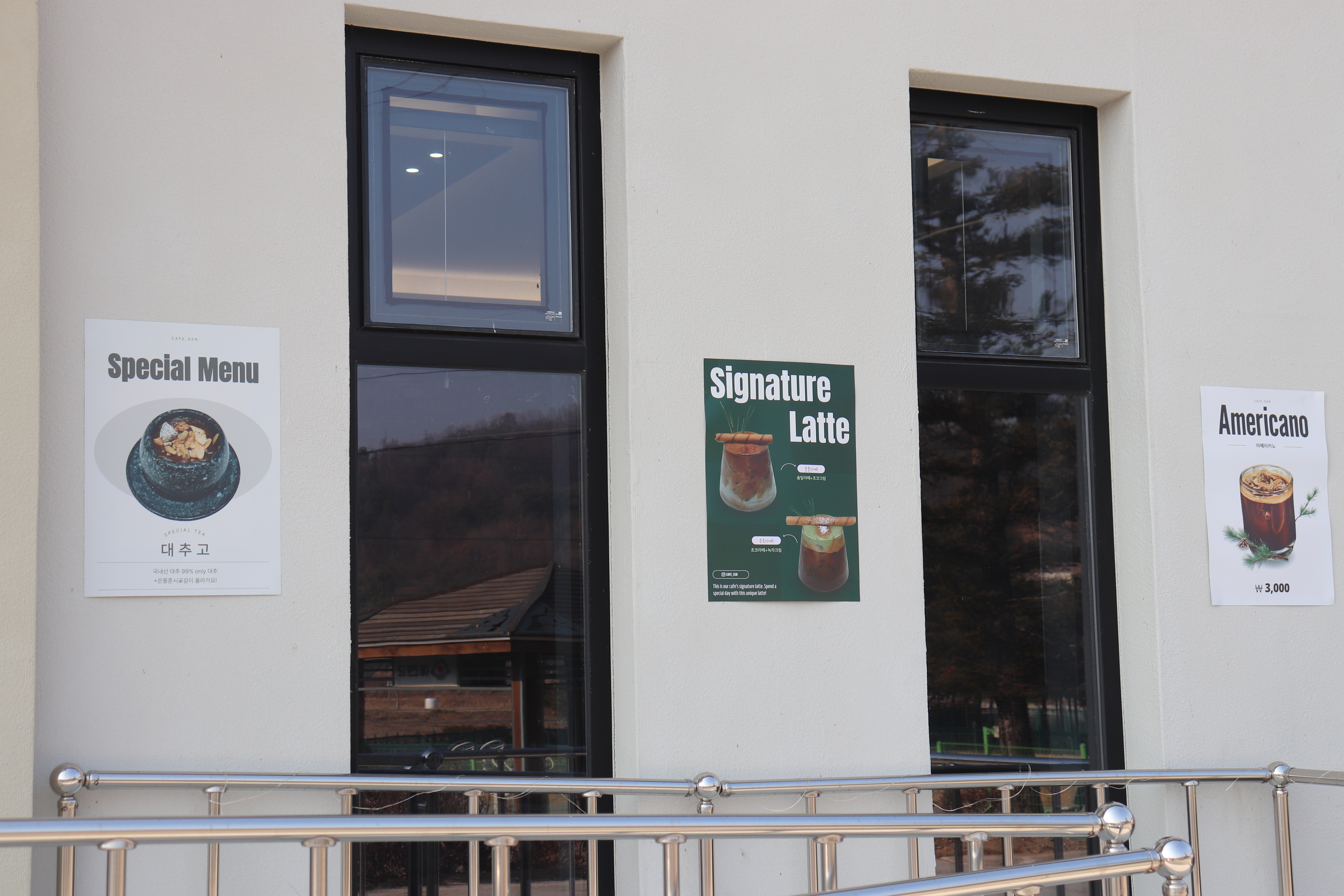 시그니처 메뉴를 밖에서도 확인할 수 있었어요. 브라질산 원두를 사용하며 초콜릿 맛과 고소한 맛이 나는 아메리카노, 수제대추고도 있다고 하고요. 레몬생강차도 있다고 합니다. 그림이 귀여워서 자꾸 보게 되네요.