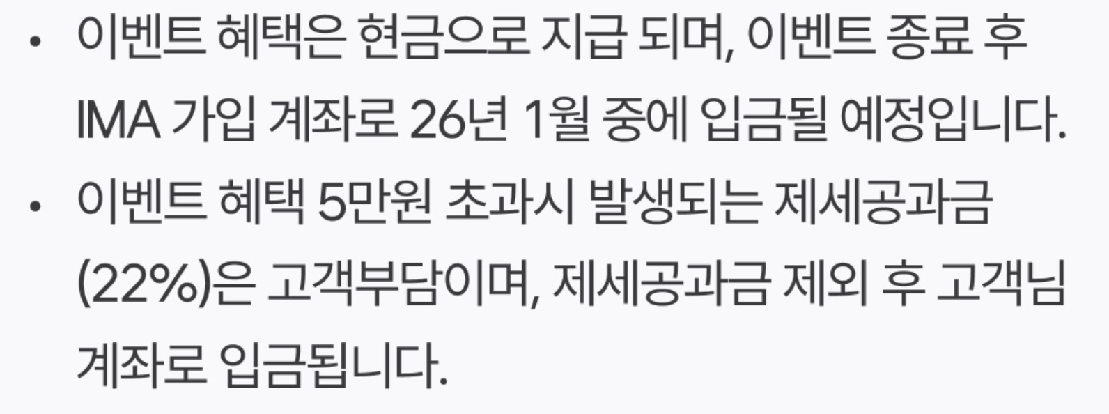 근데 이벤트 혜택으로 5만원 초과를 받게되면 제세공과금 22%를 본인이 부담해야한다. 즉, 1억원 이상 밀어넣으면 대략 2만원 빼고 8만원 들어온다고 보면된다.