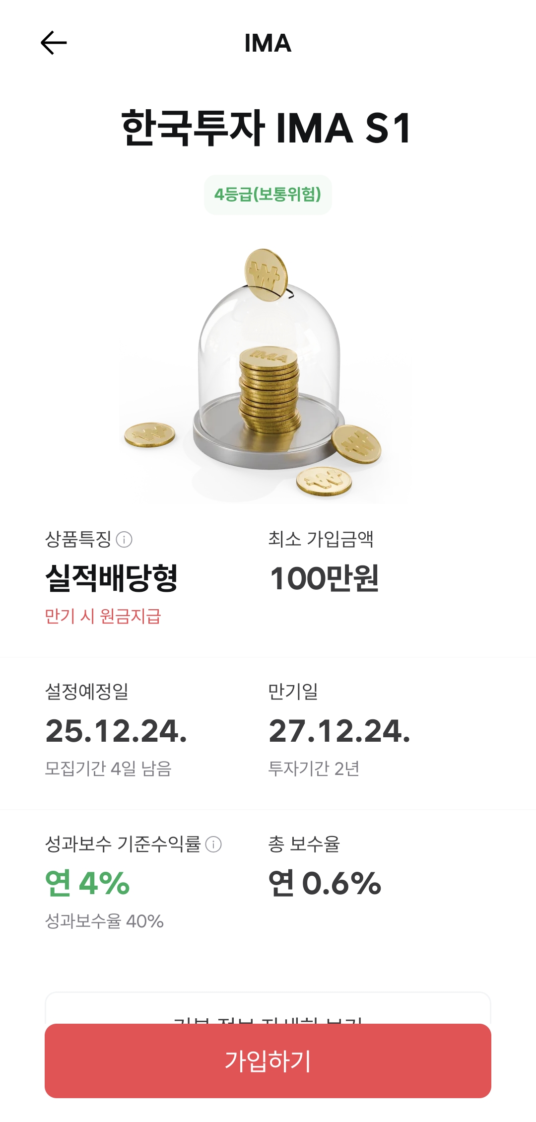 이번에 출시된 IMA 1호 상품은 목표 수익률 4%를 설정한 2년 만기형 폐쇄형 상품이다. 최소 가입 금액은 100만원이고, 투자 한도 제한은 없다고 한다. 폐쇄형 상품이므로 중도해지가 안된다는게 매우 중요한 포인트. 총 1조원 규모를 조달한다고 한다.