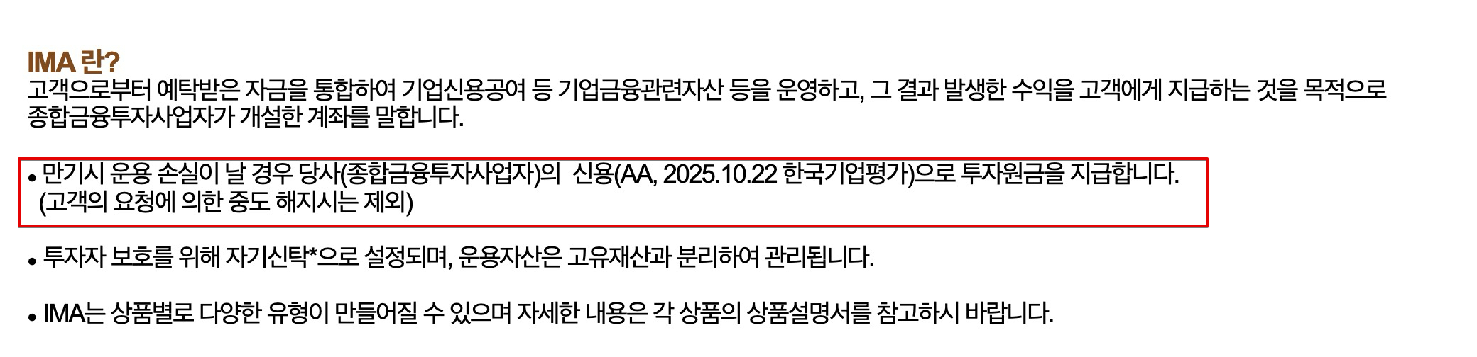 한국투자증권 홈페이지에서 IMA 계좌에 대한 설명을 읽어보았다. 중요한 포인트는 붉은색 박스 처리. 투자를 하다보면 만기 시점에 원금 손실이 날 수도 있다. 그러면 이때 만기원금에 대한 손실분을 증권사에서 채워주는 방식으로 원금을 보장한다는 개념이다. 중요한건, 만기일때만, 원금을 보장해준다는 것.