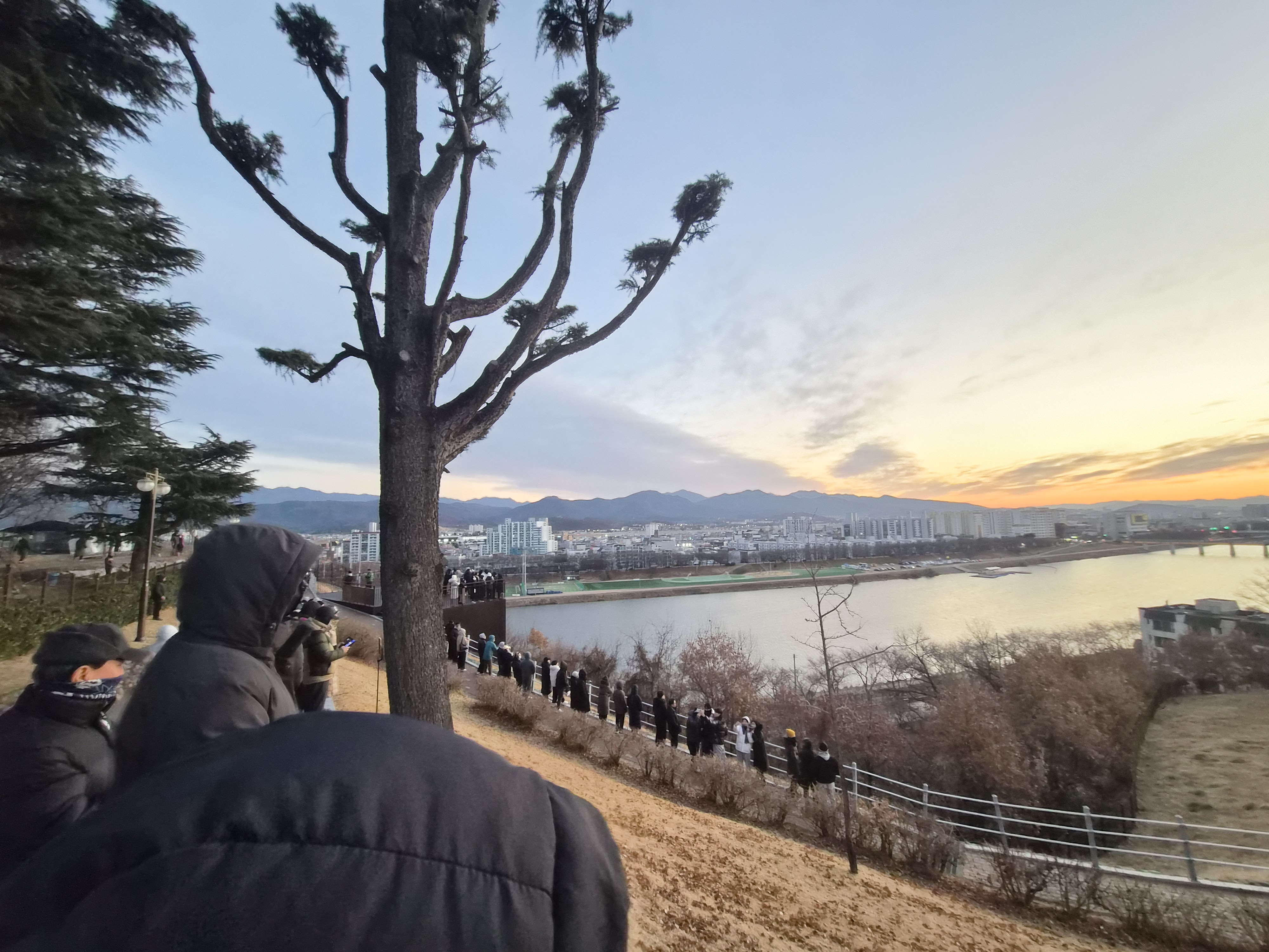 처음 생각에는 이 공원에는 공식 행사하는 곳도 아니고해서 사람 별로 없을거라고 생각했었다. 해봤자 대충 20~30명? 예상했었는데 실제로는 사람이 진짜 많았다. 거의 100여명 가까이 있었던 듯. 원래는 전망대쪽에서 일출보려고 했었고 실제로 며칠전에 사전 답사까지 다녀왔었는데, 이번에 갔더니 전망대쪽에 벌써부터 사람이 많아서 해가 잘 안보일 것 같길래 길목에 자리잡고 대기했다.