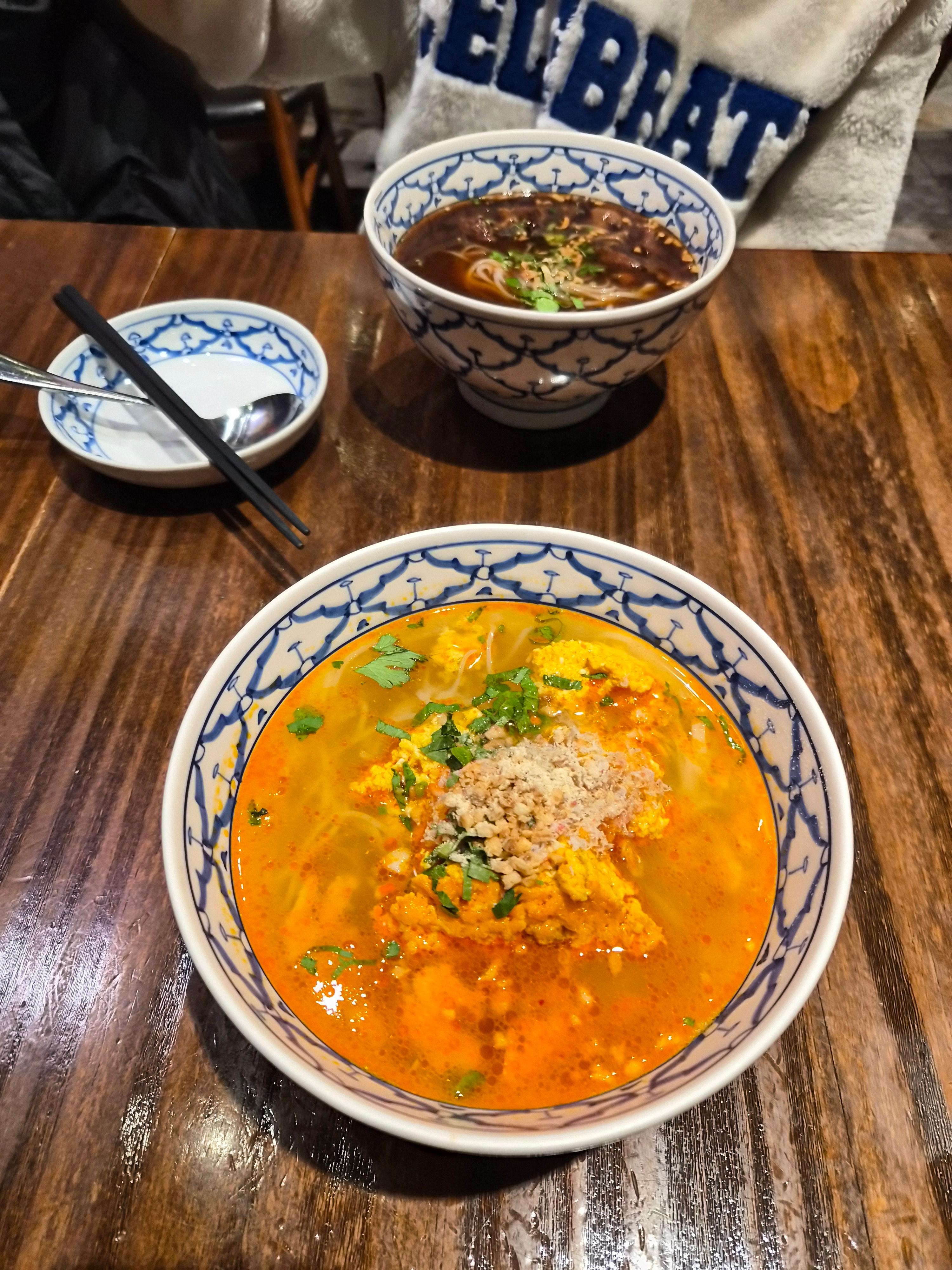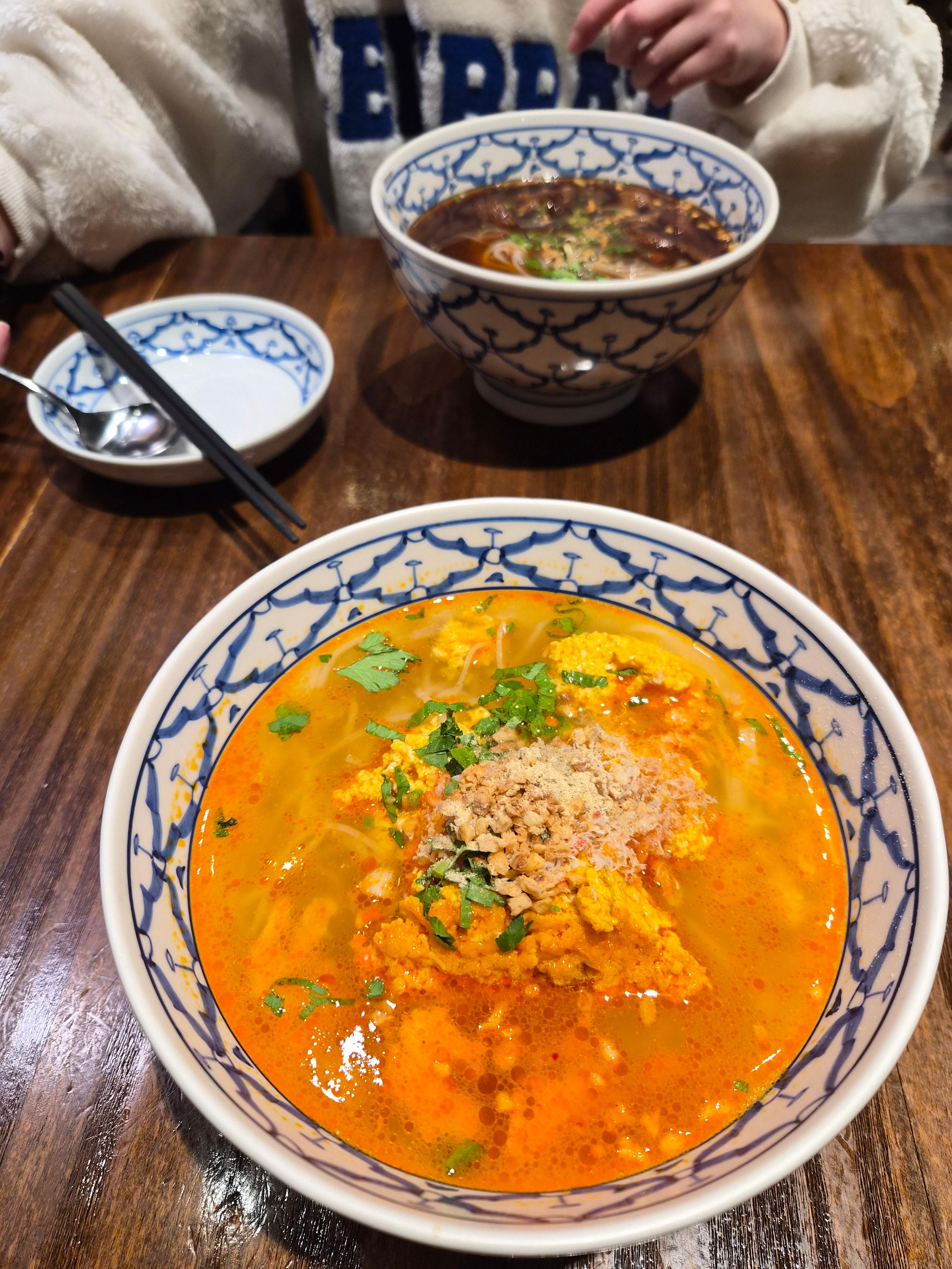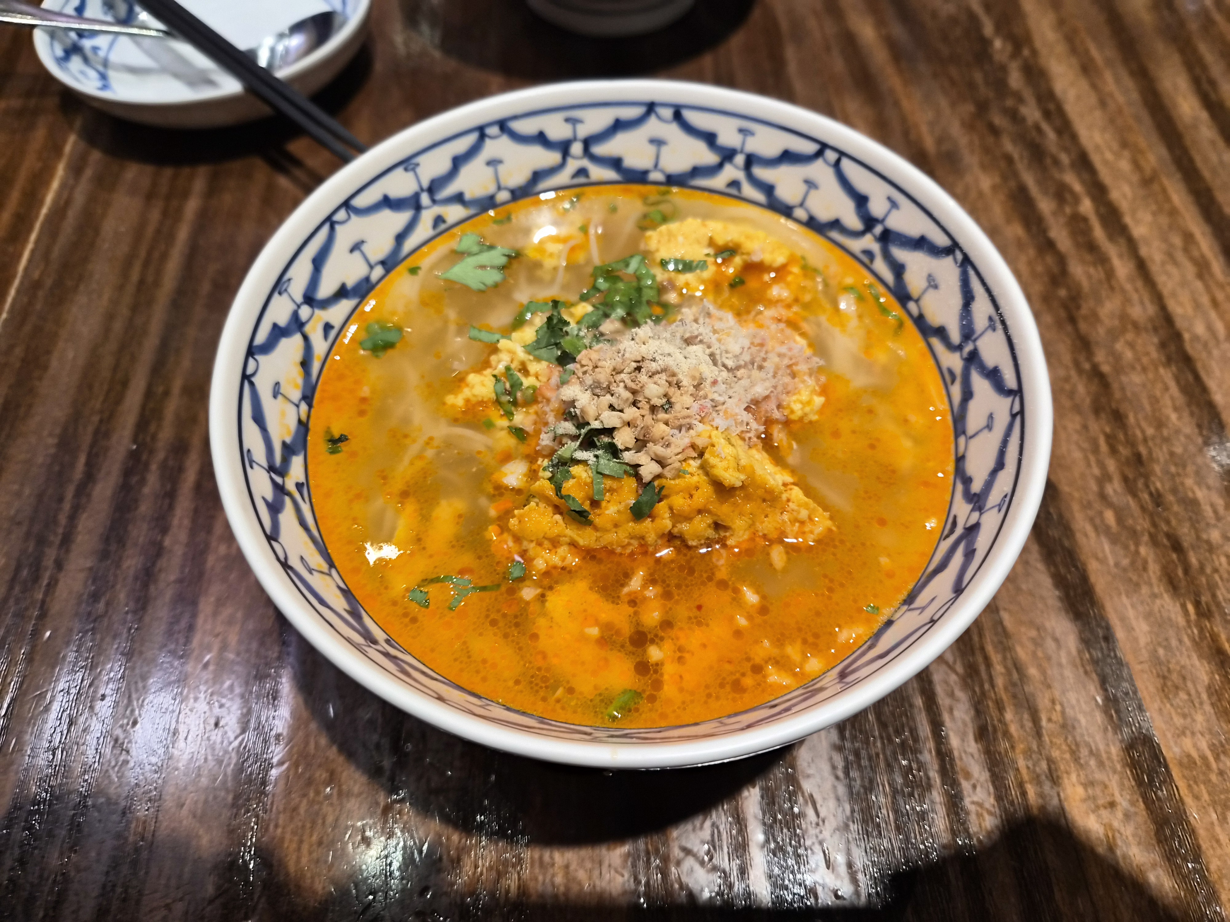 먼저 게살쌀국수. 메뉴판에서 사진이 맛있어 보이고 특이하다고 느껴서 주문해보았다. 쏘쏘. 한그릇 다 클리어 하긴 함. 게살이 맛있다. 매울걸로 생각했는데 거의 맵지는 않고 맛있는 맛. 신라면보다 확실히 덜 매운 맛 정도다.
