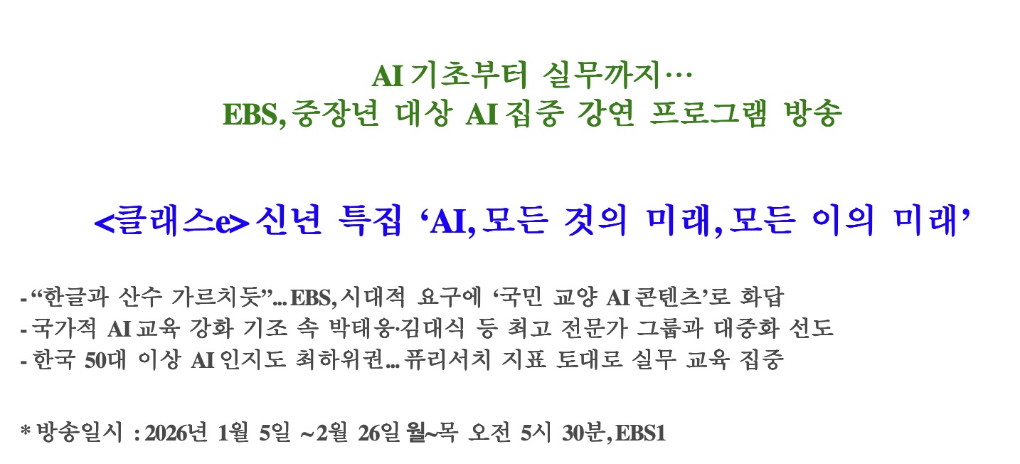 AI 기초부터 실무까지… EBS, 중장년 대상 AI 집중 강연 프로그램 방송 <클래스e> 신년 특집 ‘AI, 모든 것의 미래, 모든 이의 미래’- “한글과 산수 가르치듯”... EBS, 시대적 요구에 ‘국민 교양 AI