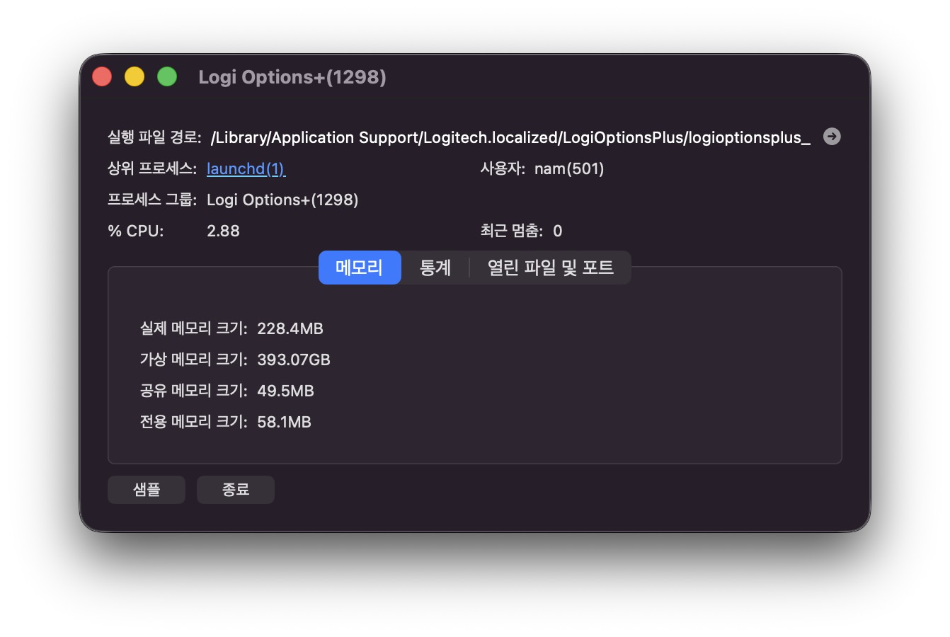 보편적으로 알려진 방법은 AppCleaner로 Logi+ 삭제 후 재설치, 활성상태보기에서 라이브러리 경로 파악한 다음 라이브러리 삭제 후 재설치, 재부팅, 기타 등등... 오만가지 방법 시도해봤지만 아무리해도 해결이 안된다.