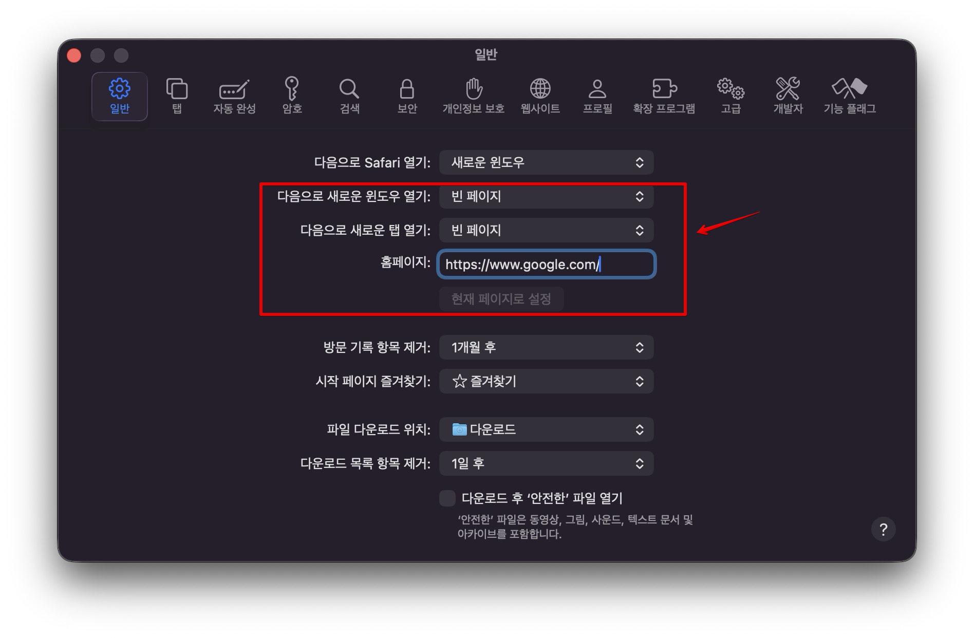맥os 타호 사파리 브라우저에서 [설정] - [일반]에 들어가보면 다음으로 새로운 윈도우 열기와 다음으로 새로운 탭 열기 항목에 처음에 <시작 페이지>가 설정되어 있다. 그리고 홈페이지는 애플 홈페이지로 연결되도록 설정되어 있다.