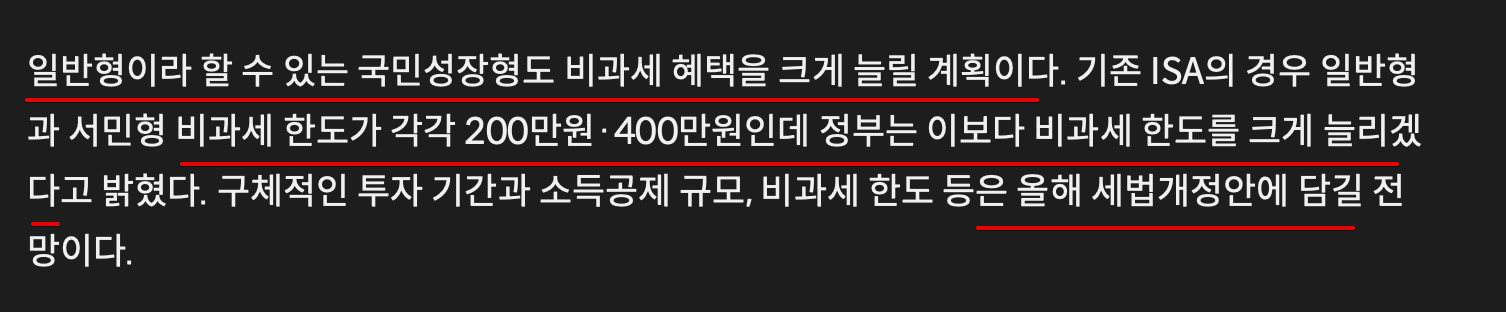 원래 작년인가? 까지만 하더라도 기존 ISA 계좌를 조금 더 개선해서 세법개정안에 담아서 발표하기로 되어있었다. 투자한도를 2배 늘려주고 비과세 혜택도 2배 늘려주는 ISA로 개선될 예정이었다. 그런데 지금 생산적 금융 ISA가 나온다고하니까 이런 개정은 무산된 모양이다.