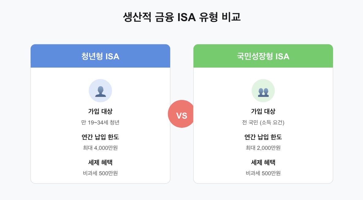 생산적 금융 ISA 유형이 두 가지가 있다. 첫번째는 청년형 ISA이고 두 번째는 일반형이라고 할 수 있는 국민성장형 ISA다. 2026년 하반기에 출시된다고 한다.