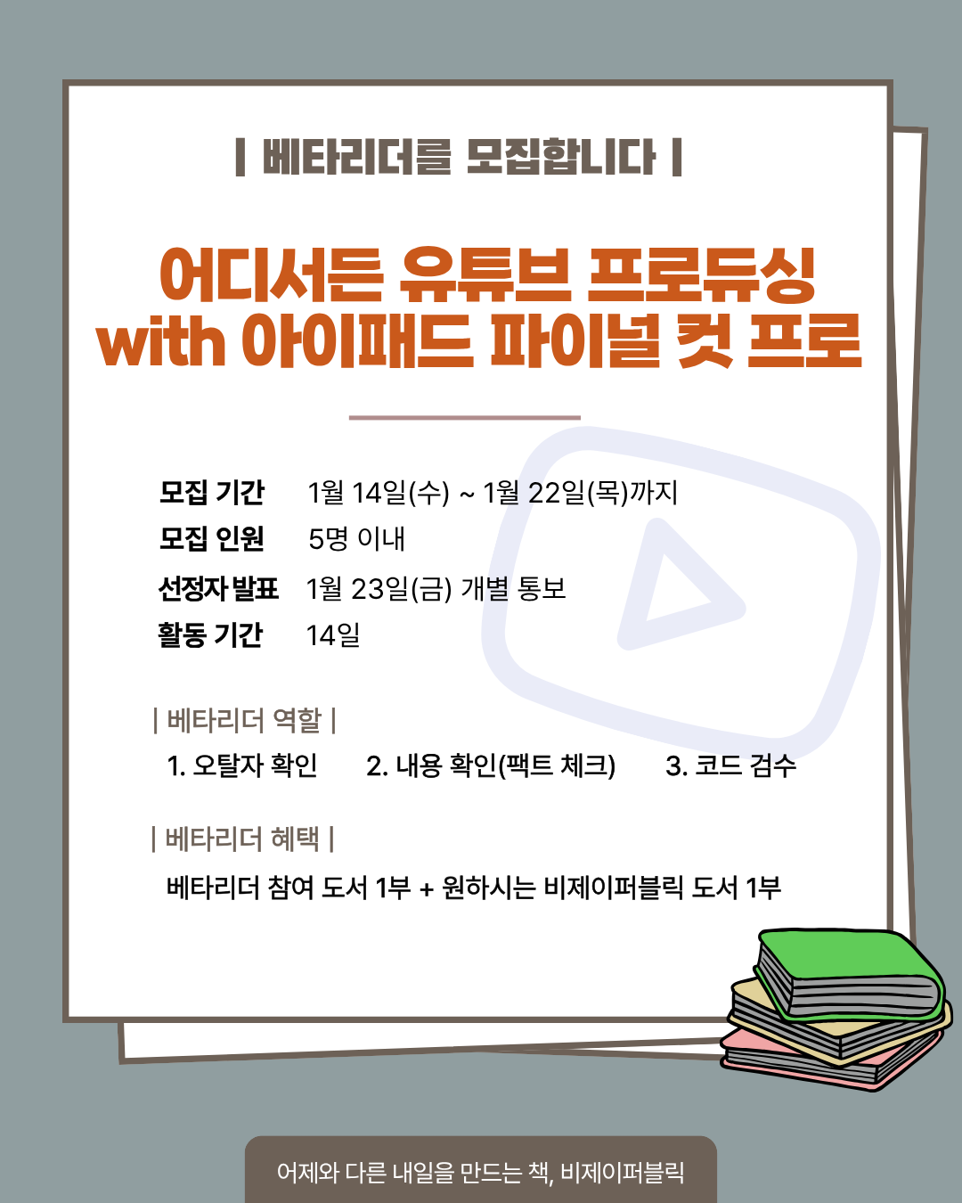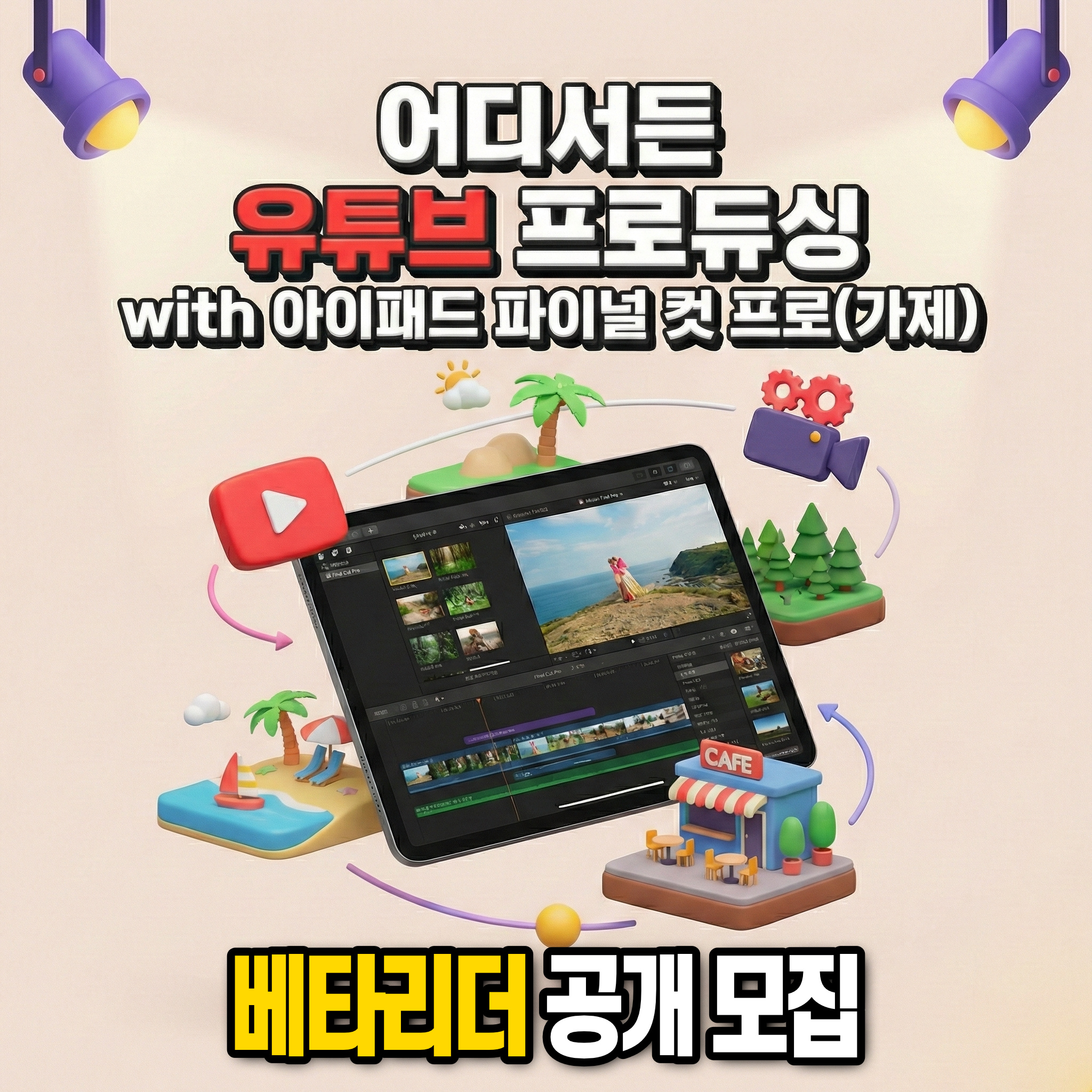 ≪어디서든 유튜브 프로듀싱 with 아이패드 파이널 컷 프로(가제)≫의 베타리더를 모집합니다. ✅ 모집 인원: 5명 이내 ✅ 모집 기간: 1월 14일(수) ~ 1월 22일(목) ✅ 선정자 발표: 1월 23일(금) *선정