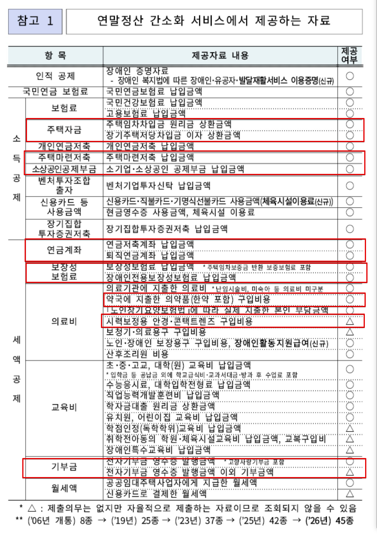 지금까지 42종 자료를 제공했는데 올해부터는 45종 자료를 제공한다. 여기에서 특히 주목할만한 부분은 (체육시설 이용료 자료) 쪽이다. 25년 7월 1일 이후 수영장이나 체력단련장(헬스장 등)에서 이용료를 신용카드 등으로 사용하게되면 문화체육 사용분이라고해서 30% 소득공제를 주는 항목이 신설되었다. 운동 열심히 하는분들에겐 반드시 챙겨가야할 혜택이다.