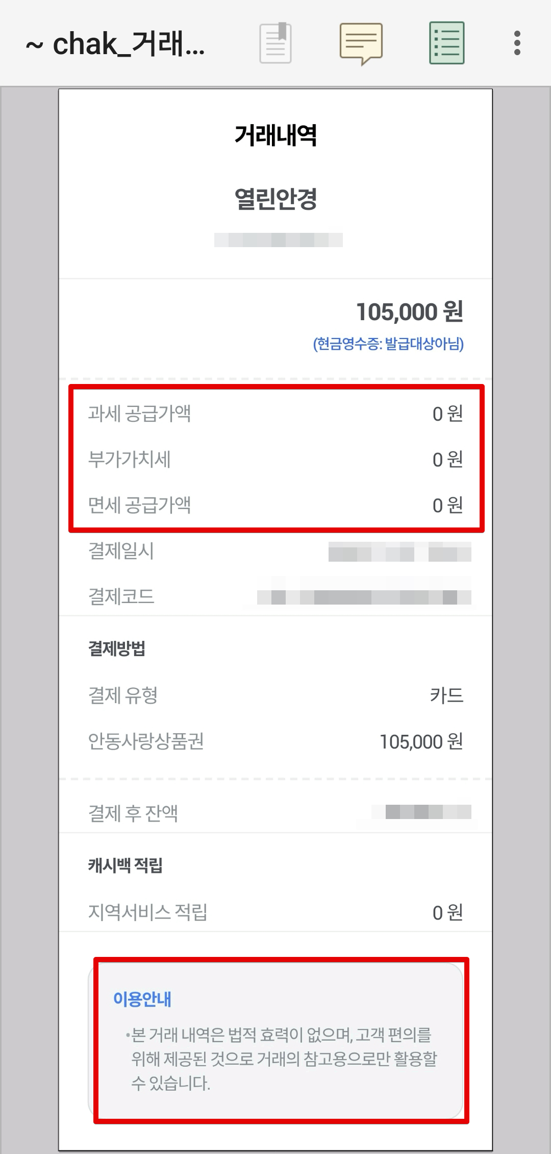 일단 지역화폐 chak 앱에서 거래내역을 찾아볼 때 항목을 보니까 공급가액이랑 부가세 모두 0원으로 표시가 되어있다. 원래 지역화폐 결제분에 대해서는 현금영수증을 자동발급받을 수 있도록 하는 기능이 있는데 이것도 QR코드를 이용해서 결제했을 때만 가능하고 카드로 긁는건 안된다. 물건을 샀는데 공급가액이 없다는게 말이 안되니까 너무나도 이상해서 카드사 홈페이지에서 매출전표를 조회해보니까 공급가액과 부가세 내역을 볼 수 있었다. 그래서 이 매출전표를 기준으로 세액공제를 받으면 될 것 같다.